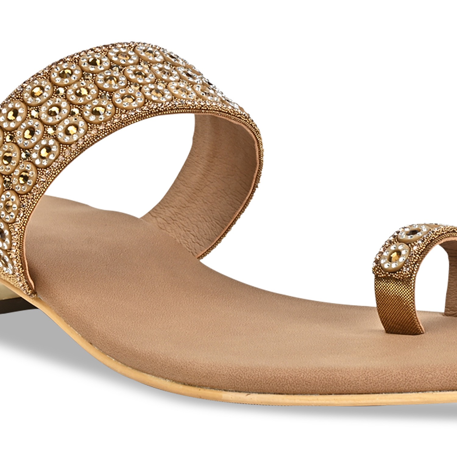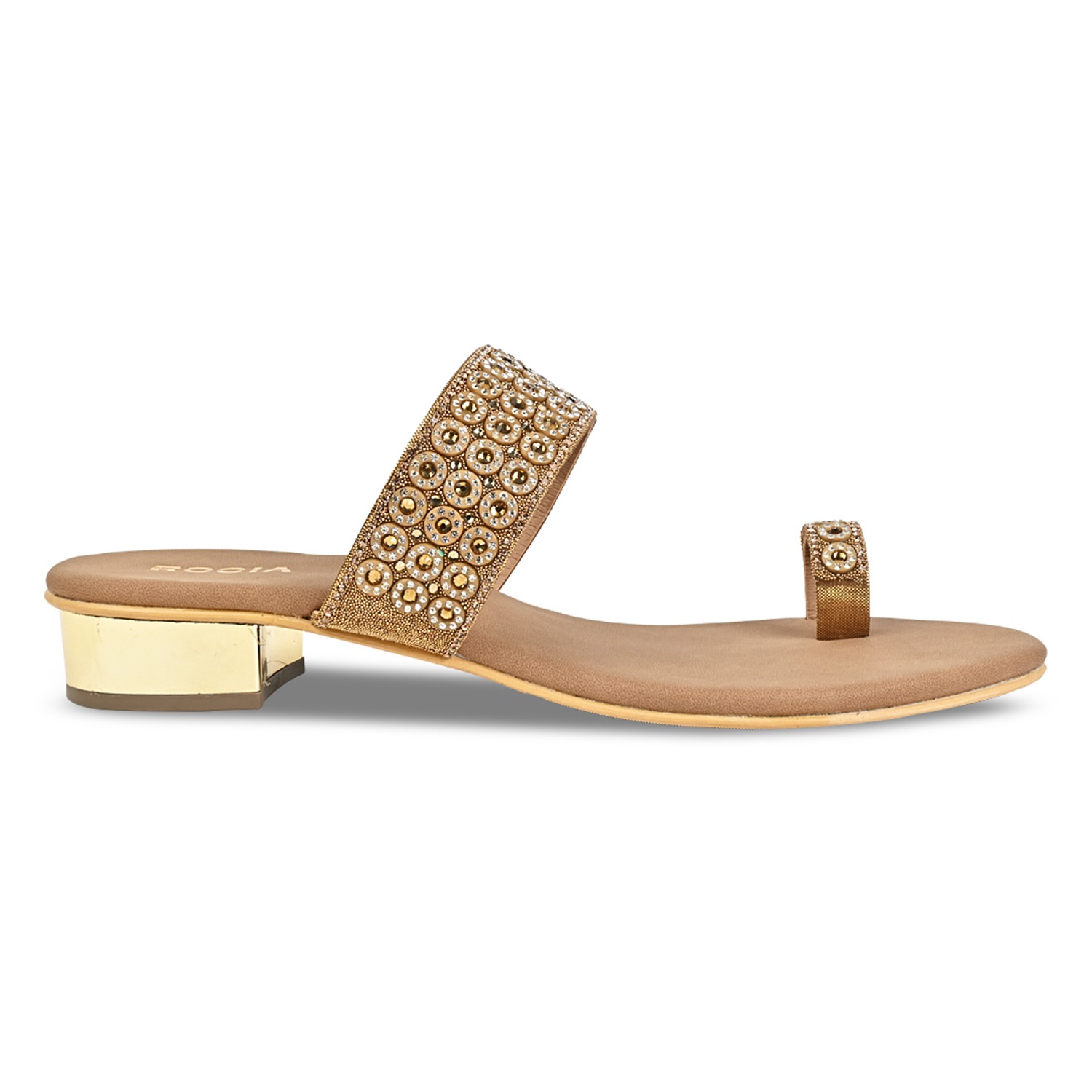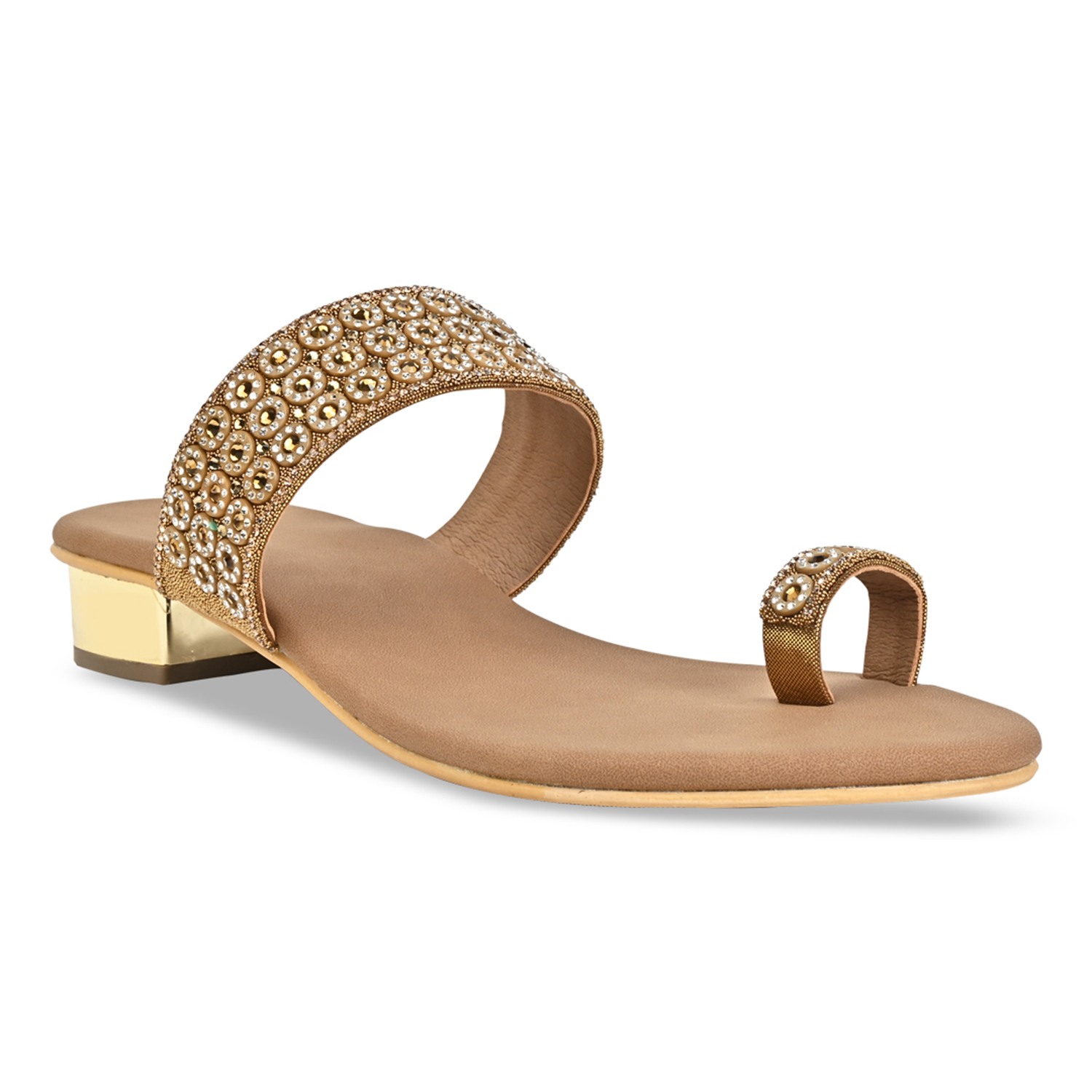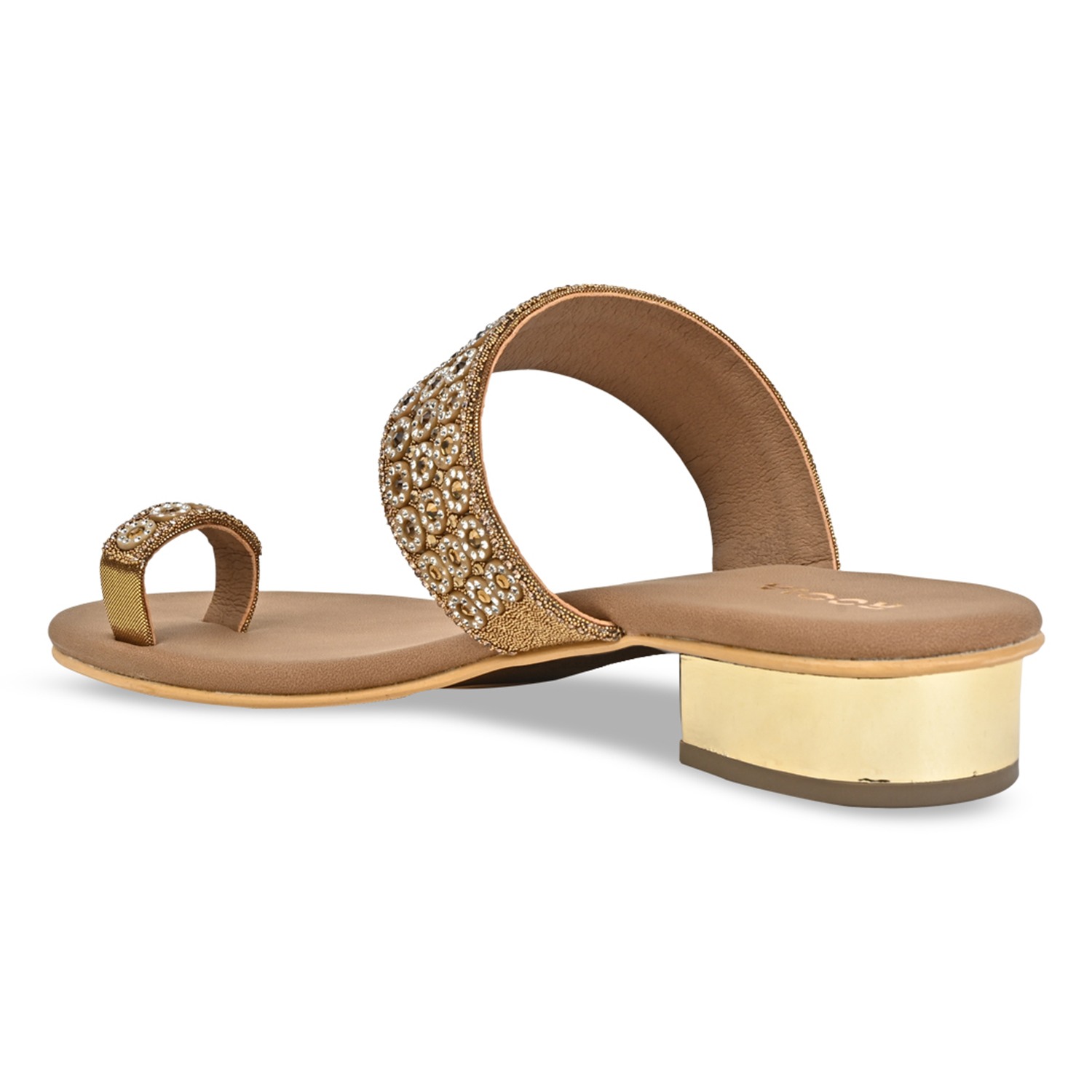 Antique Gold Women Diamond Embellished Box Heel Sandals