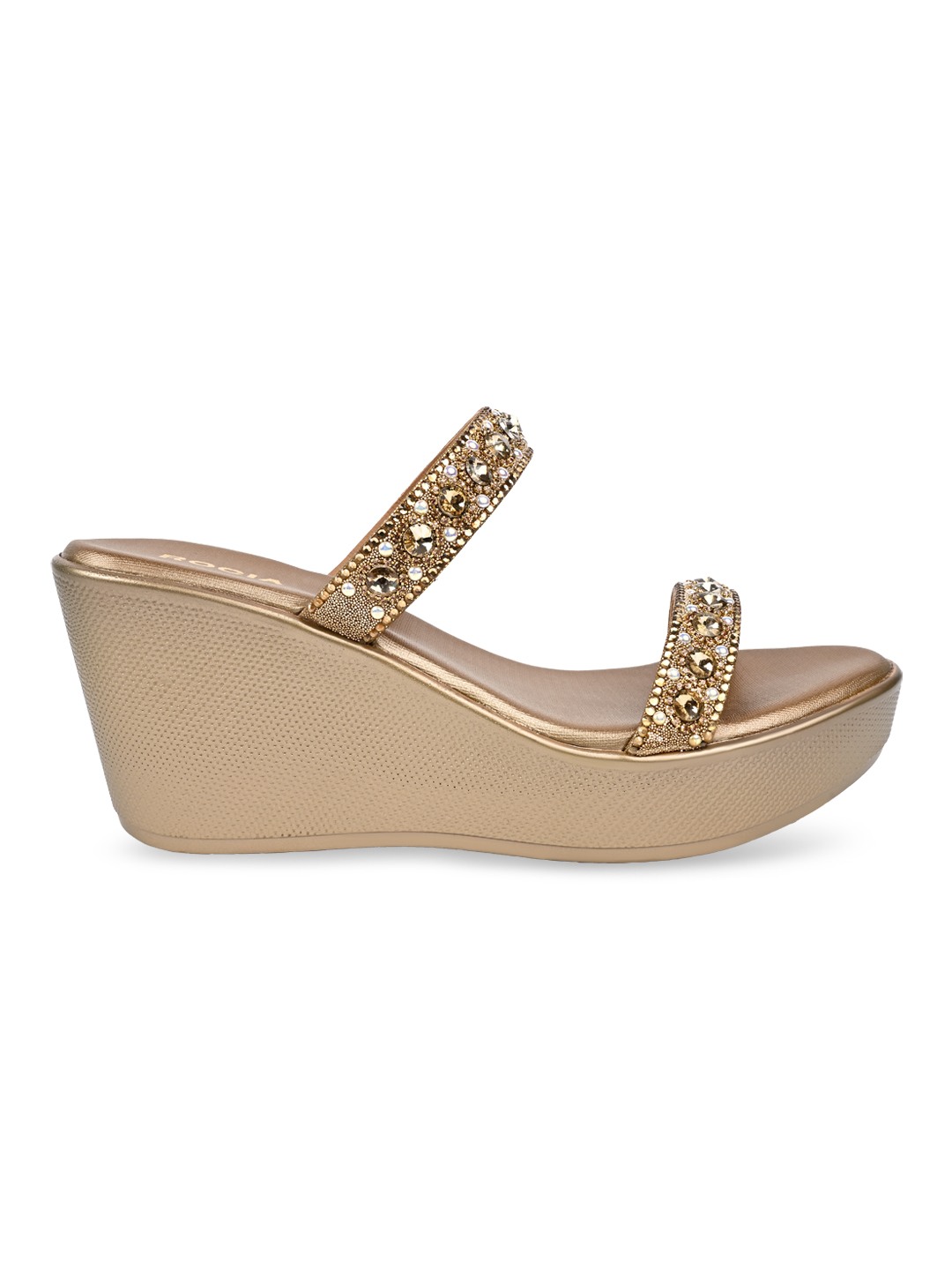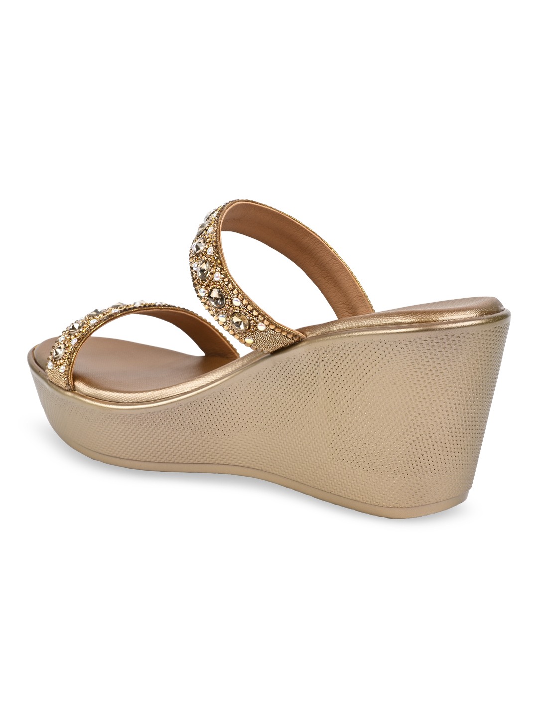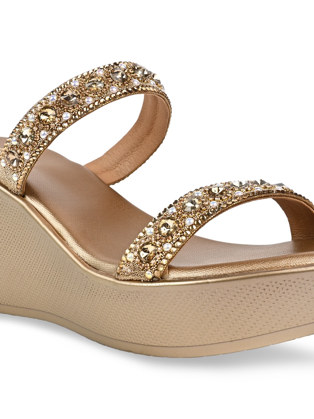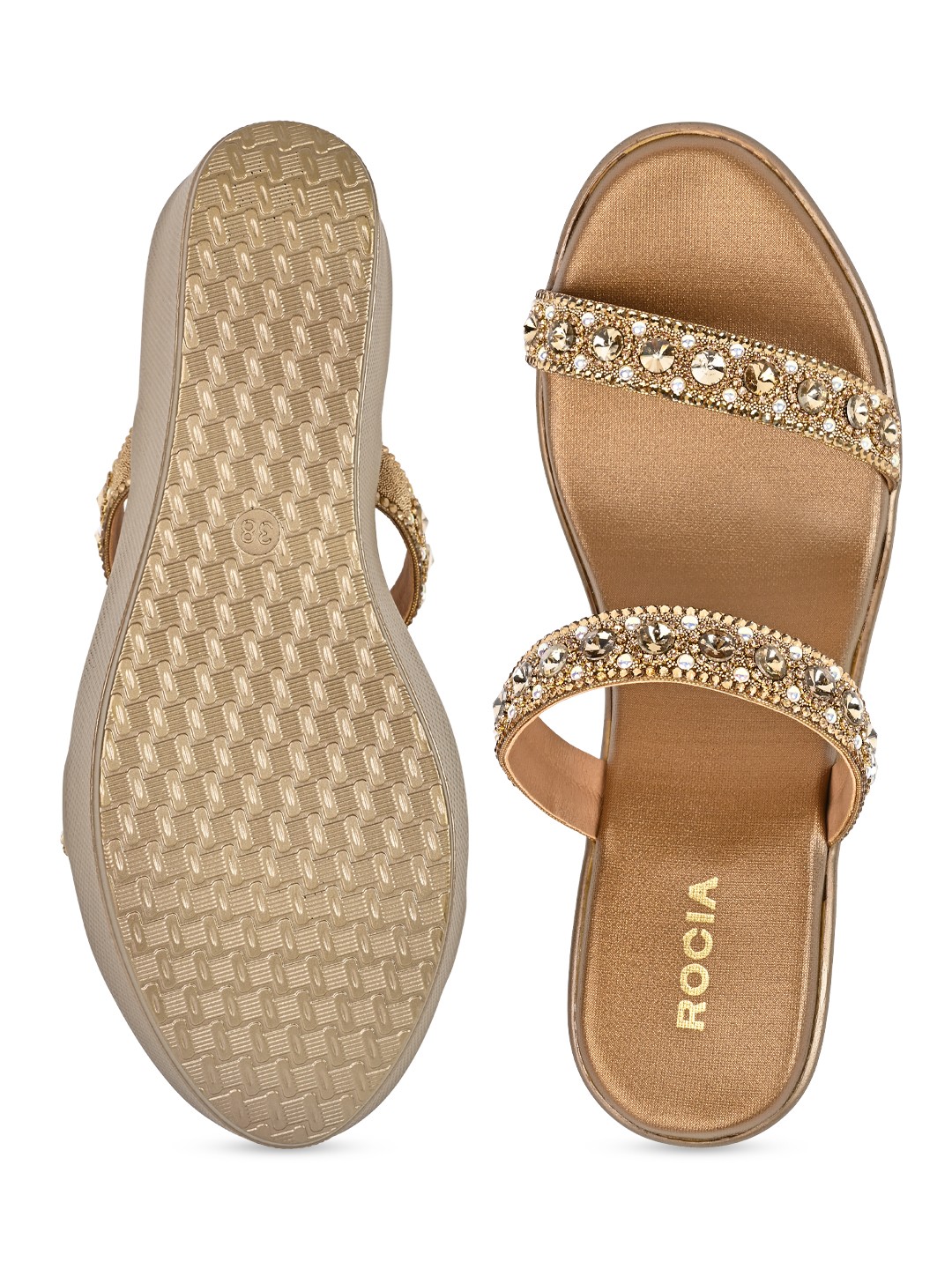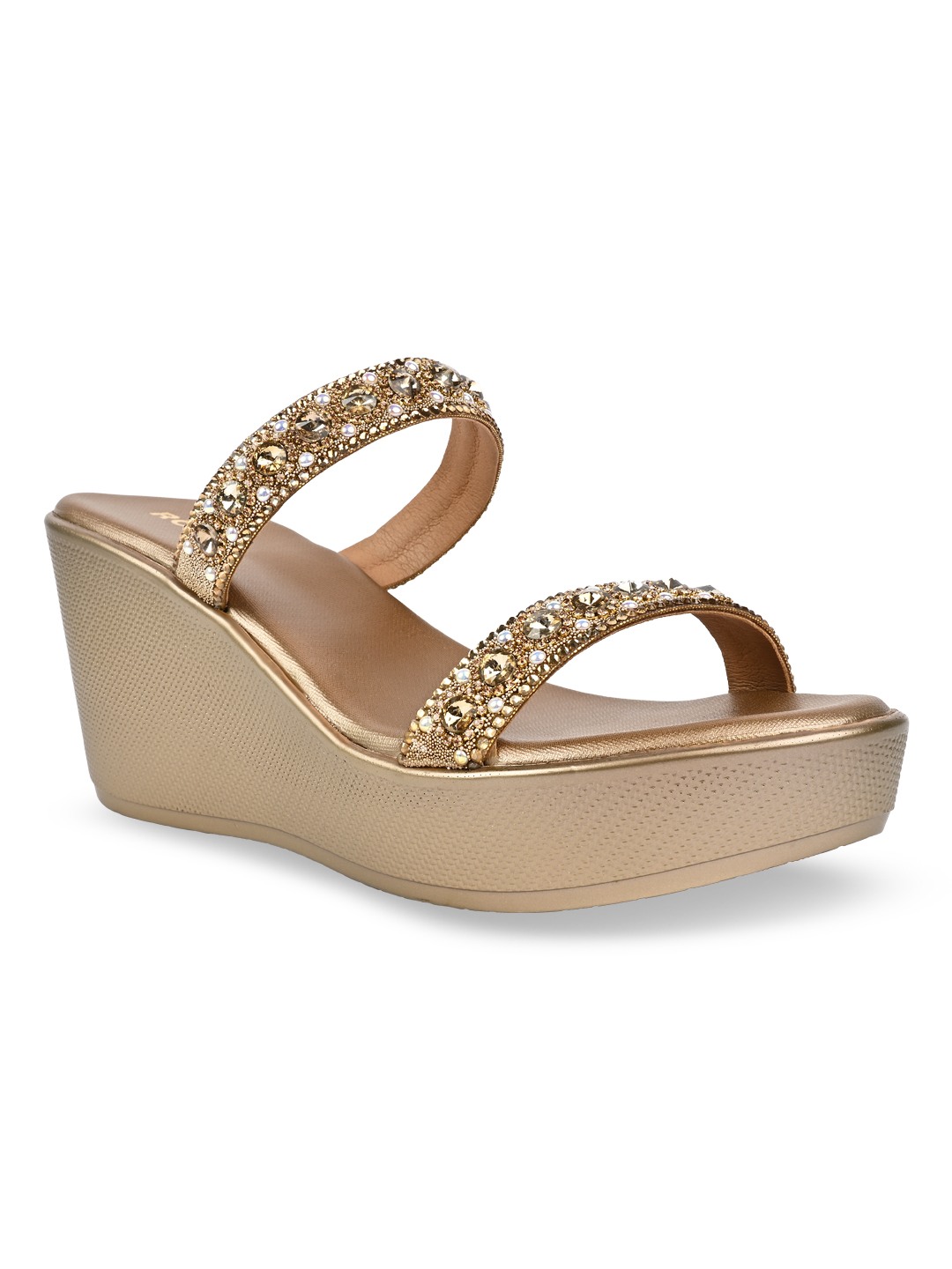 Crafted for festive glamour, Rocia by Regal Shoes Diamond Embellished High Fancy Platforms are adorned with shimmering diamond details for a refined finish. The open-toe slip-on design keeps the look elegant yet effortless. Set on a striking 3.5-inch platform heel, they create a bold, confident silhouette. Ideal for weddings, festive celebrations, and statement ethnic styling.
