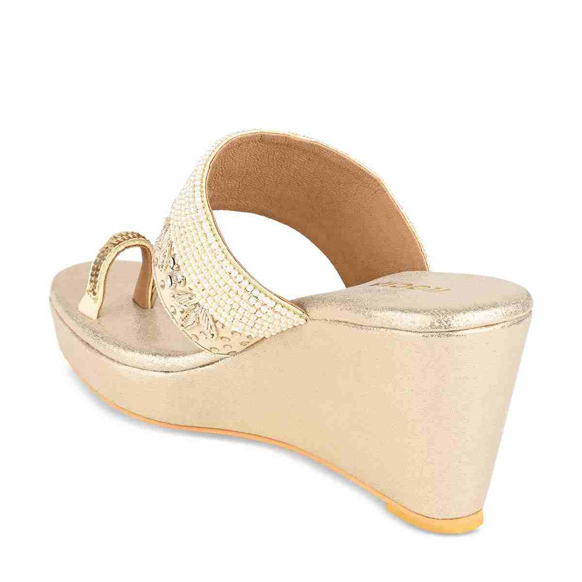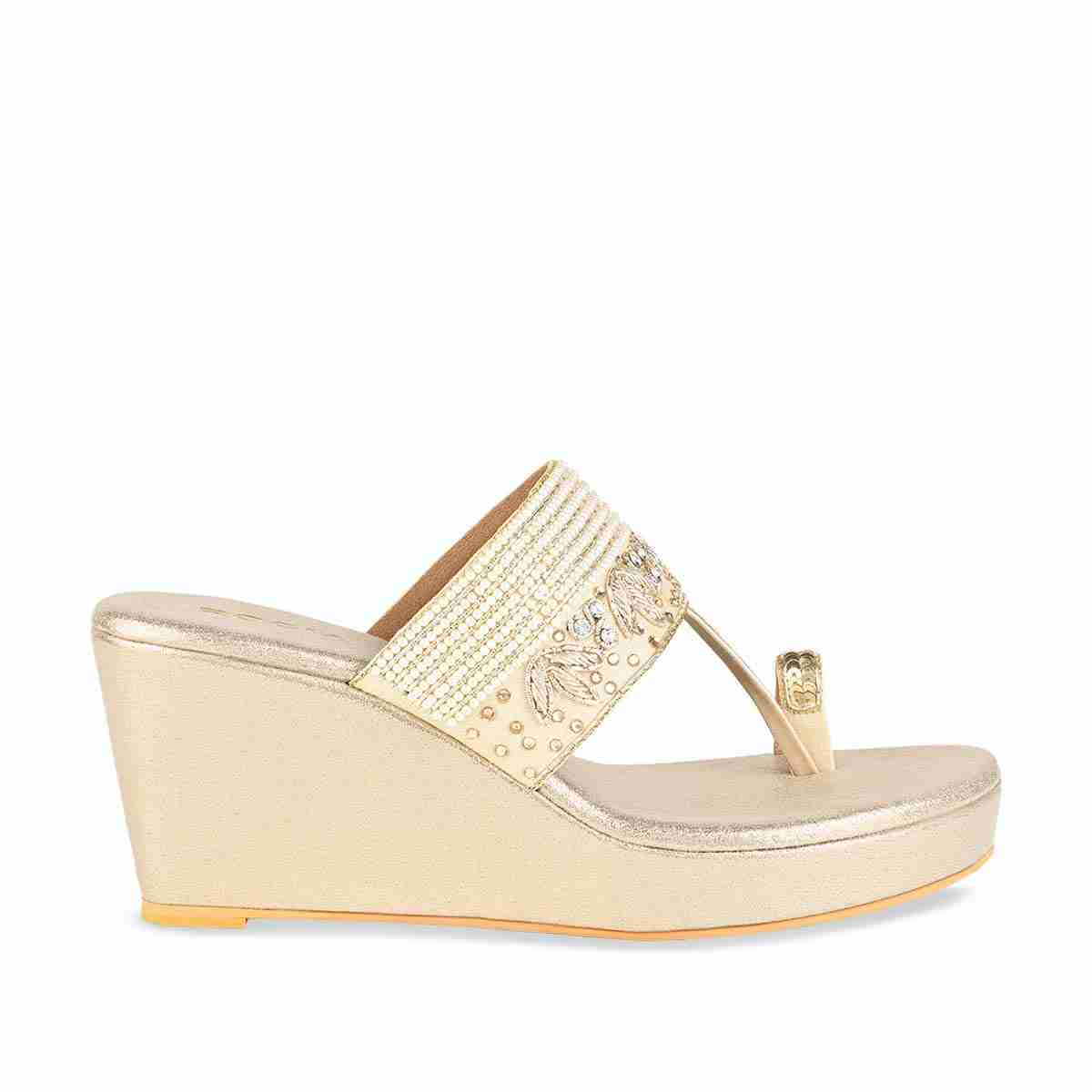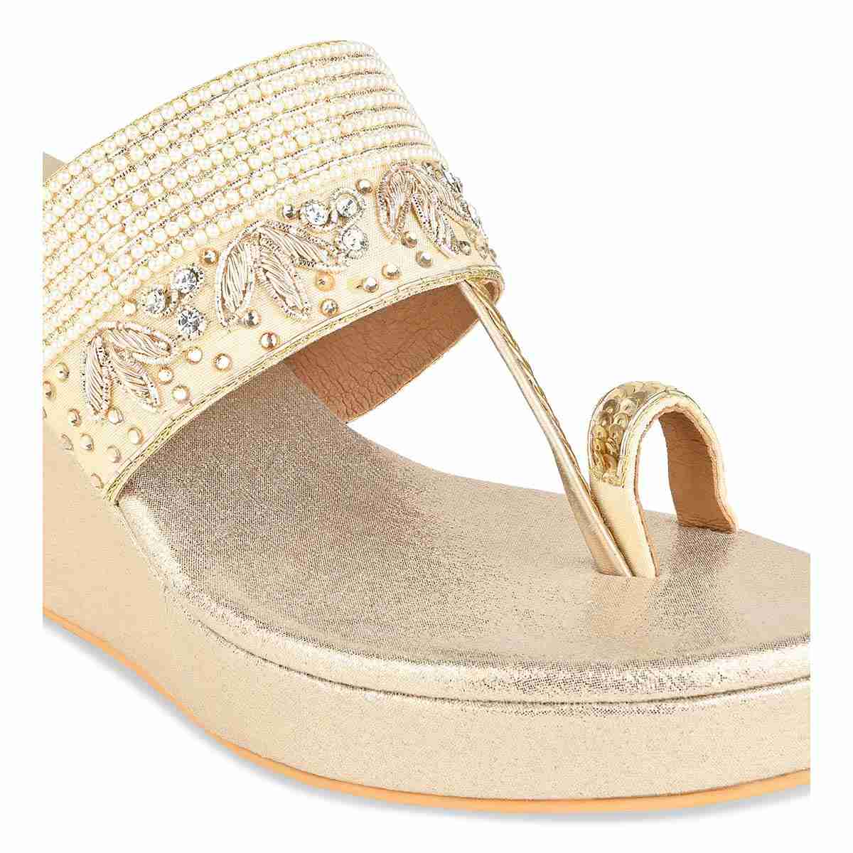 Rocia By Regal Gold Women One Toe Hand Embroidered Wedges