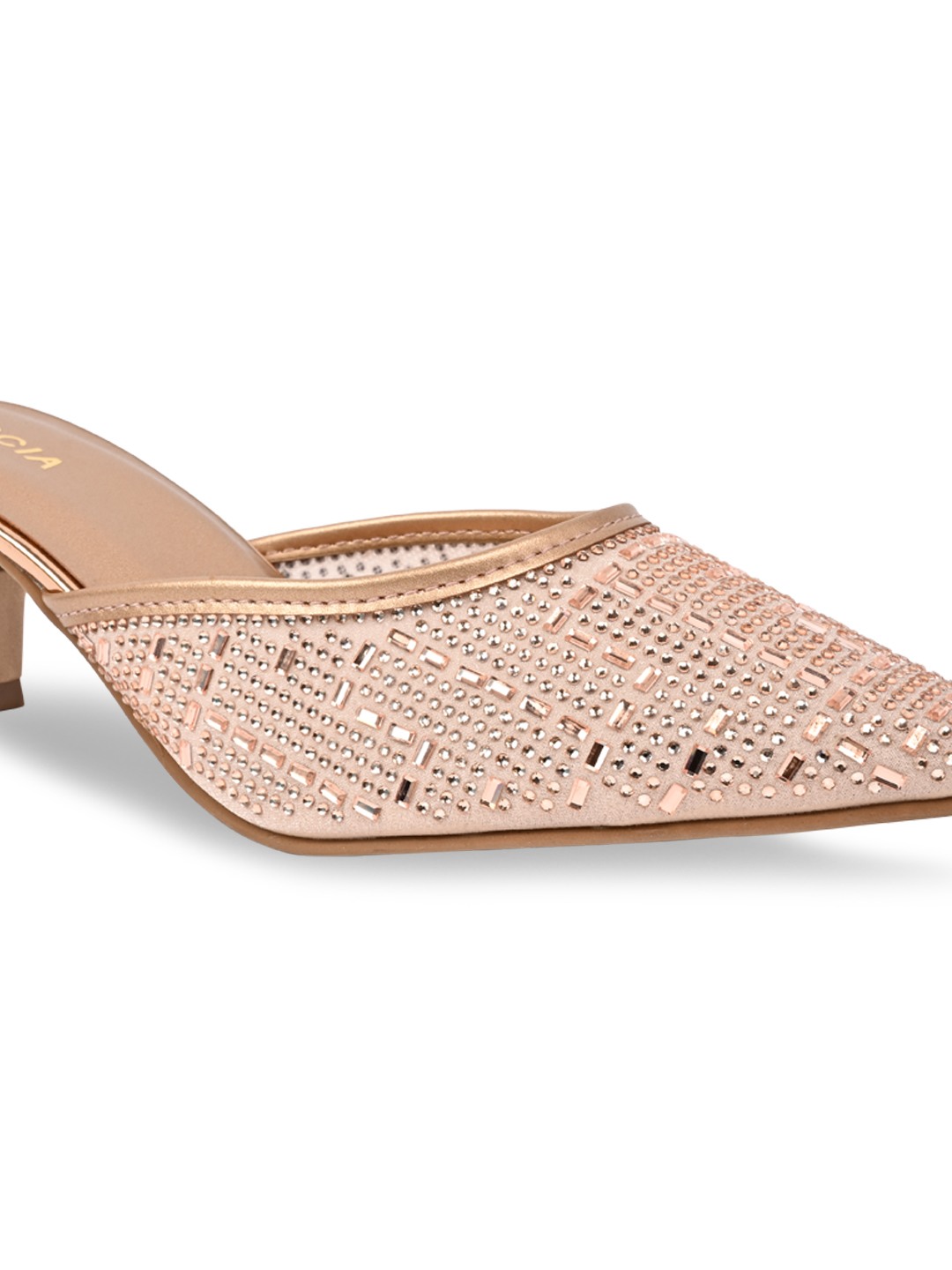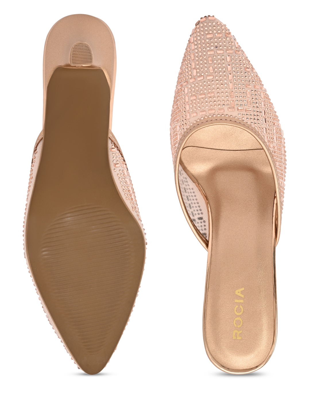 Crafted to add instant glamour to party-ready looks, Rocia by Regal Shoes Diamond Embellished Mules feature elegant detailing that enhances their festive appeal. The closed pointed-toe design adds a sleek and sophisticated character. A slip-on silhouette ensures effortless wear while maintaining elegance. Elevated with a 2-inch heel, they deliver the perfect blend of sparkle, comfort, and style.