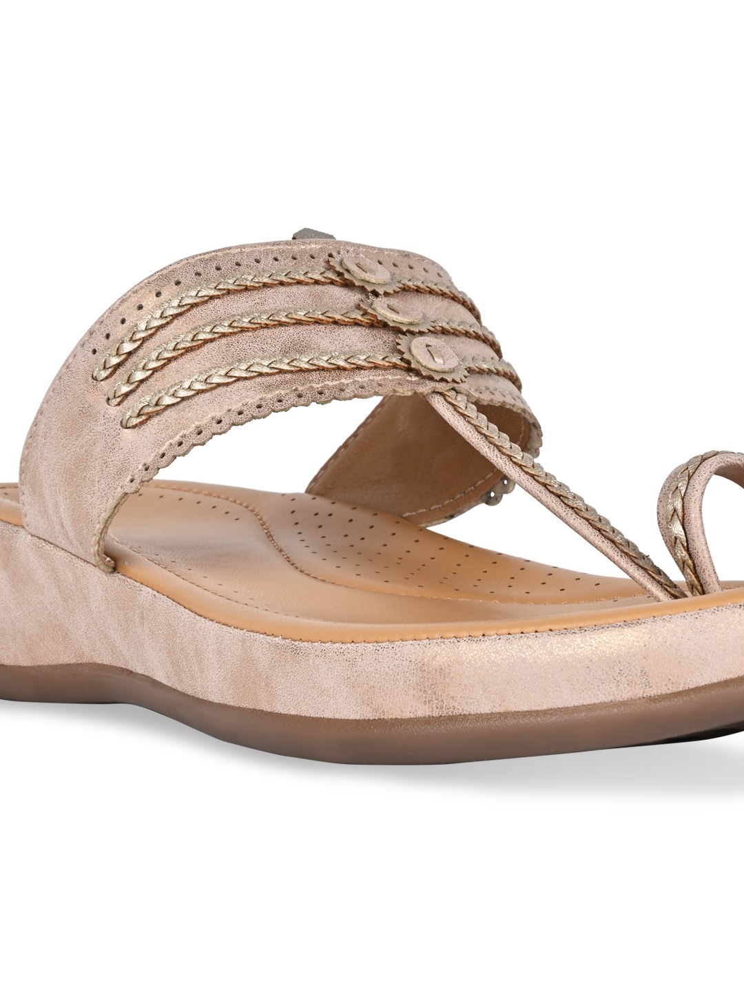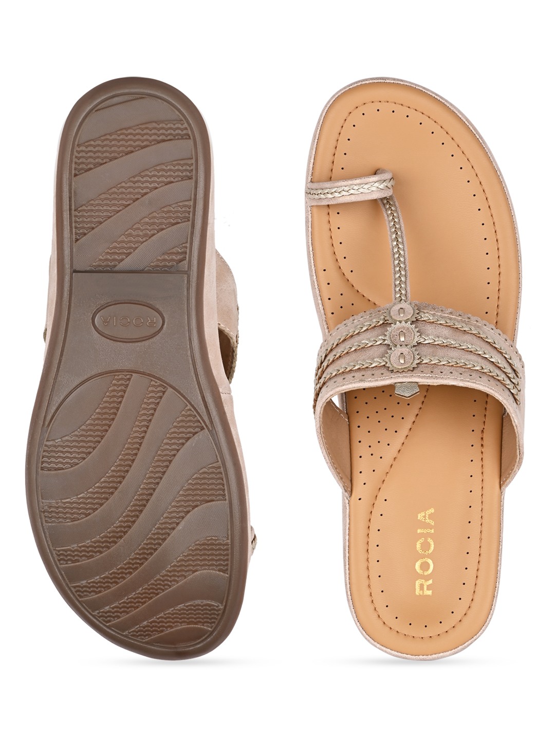 Experience the perfect blend of tradition and comfort with Rocia's Women Stitch-Down Comfortable Kolhapuris. These handcrafted flats pay homage to classic Indian footwear with a modern twist. Featuring intricate stitch-down detailing, they are designed for both durability and style. The cushioned footbed ensures all-day comfort, making them ideal for both casual wear and festive occasions. Their versatile design effortlessly complements ethnic wear as well as contemporary outfits, adding a touch of elegance to any look. Perfect for those who appreciate timeless craftsmanship combined with everyday comfort. Heel Height: 1.5 inches