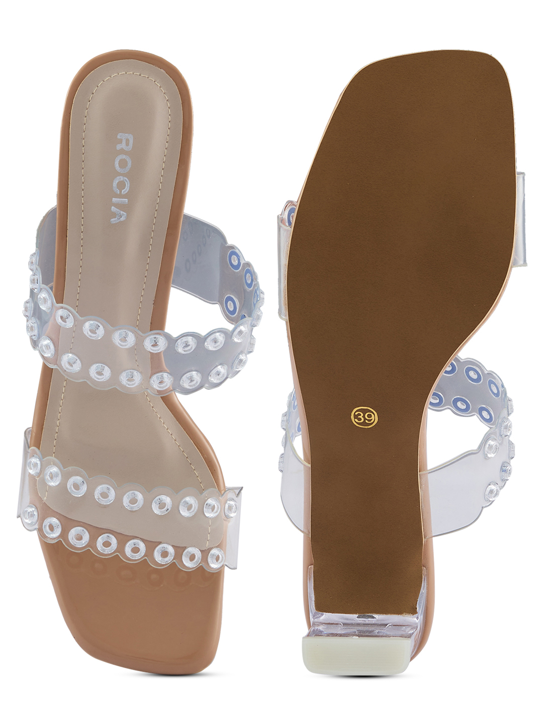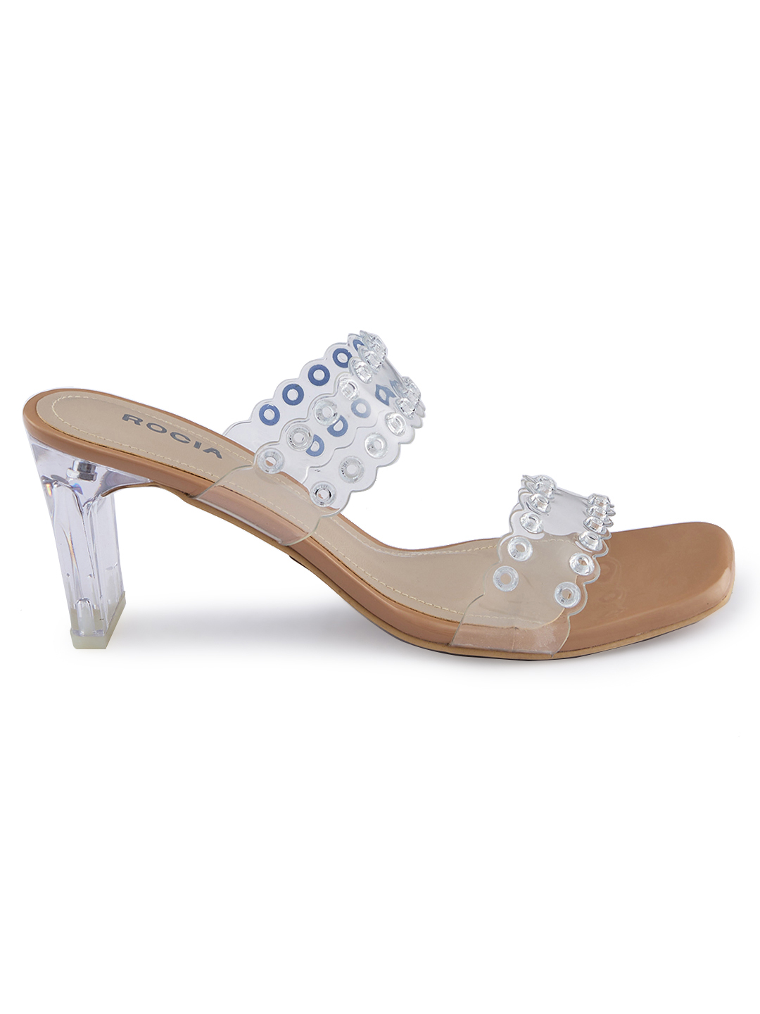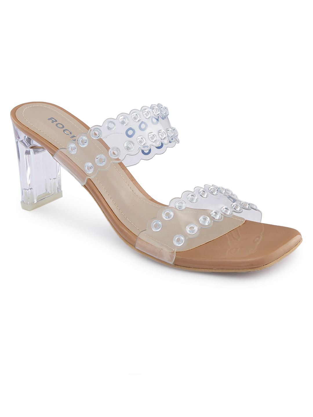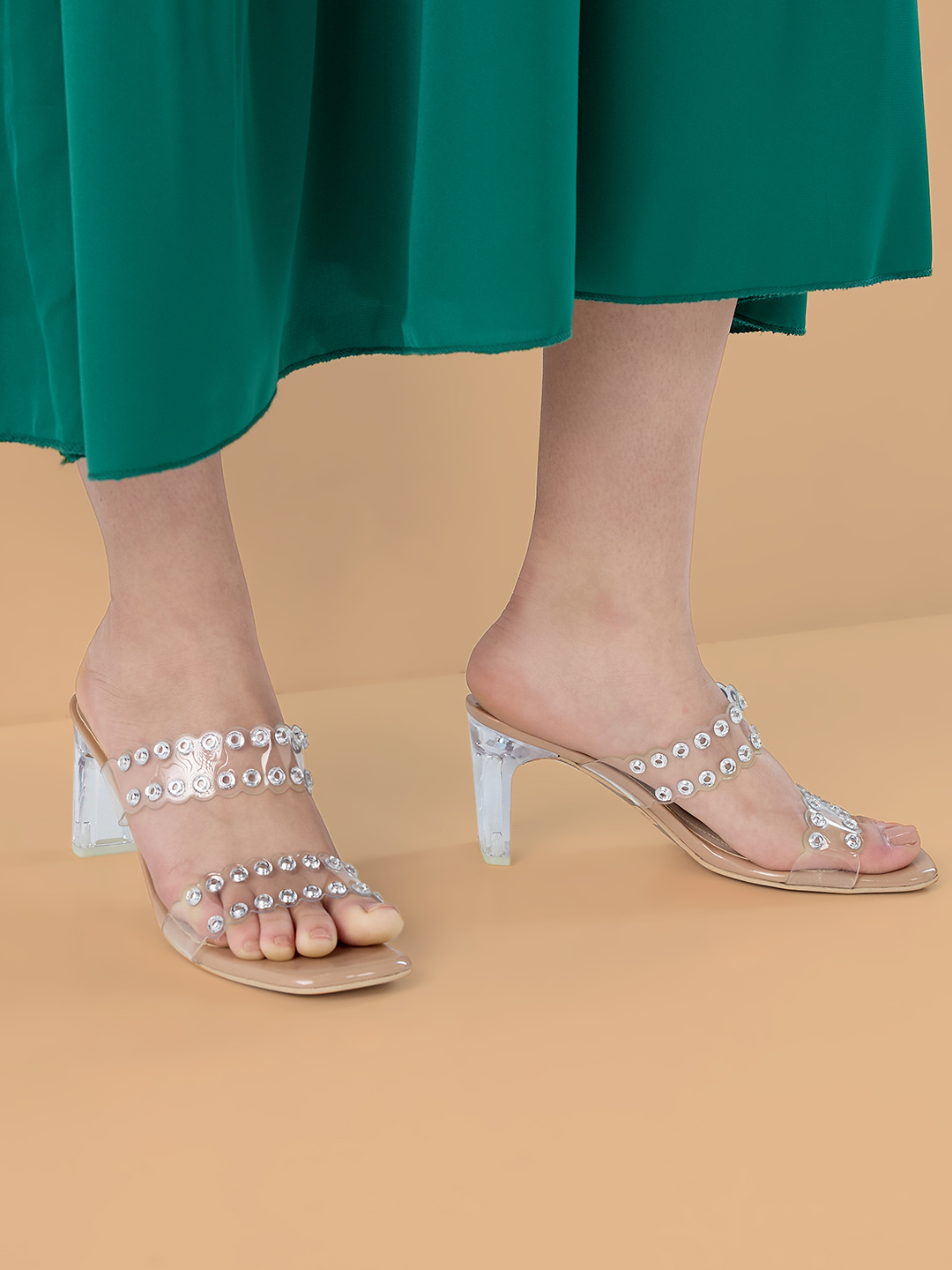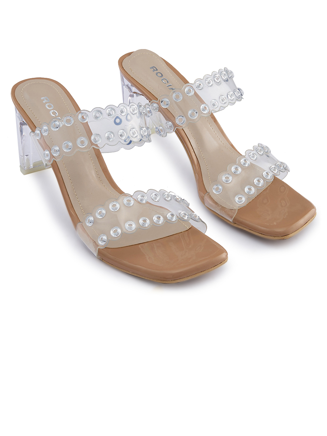 Step into the spotlight with these vinyl studded acrylic heels that command attention. The transparent straps and studded accents create a futuristic yet glamorous vibe. Designed for both comfort and statement-making style, they’re perfect for fashion-forward occasions. Own the room with every confident step.