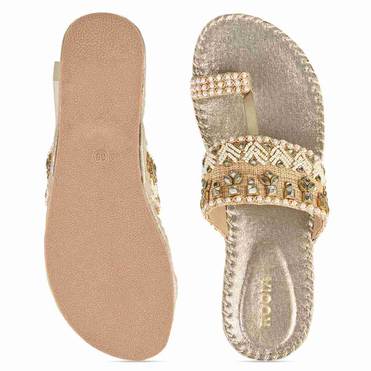 Elegant stone and bead embellished ethnic style flat sandals for women great for kurtas and saris.