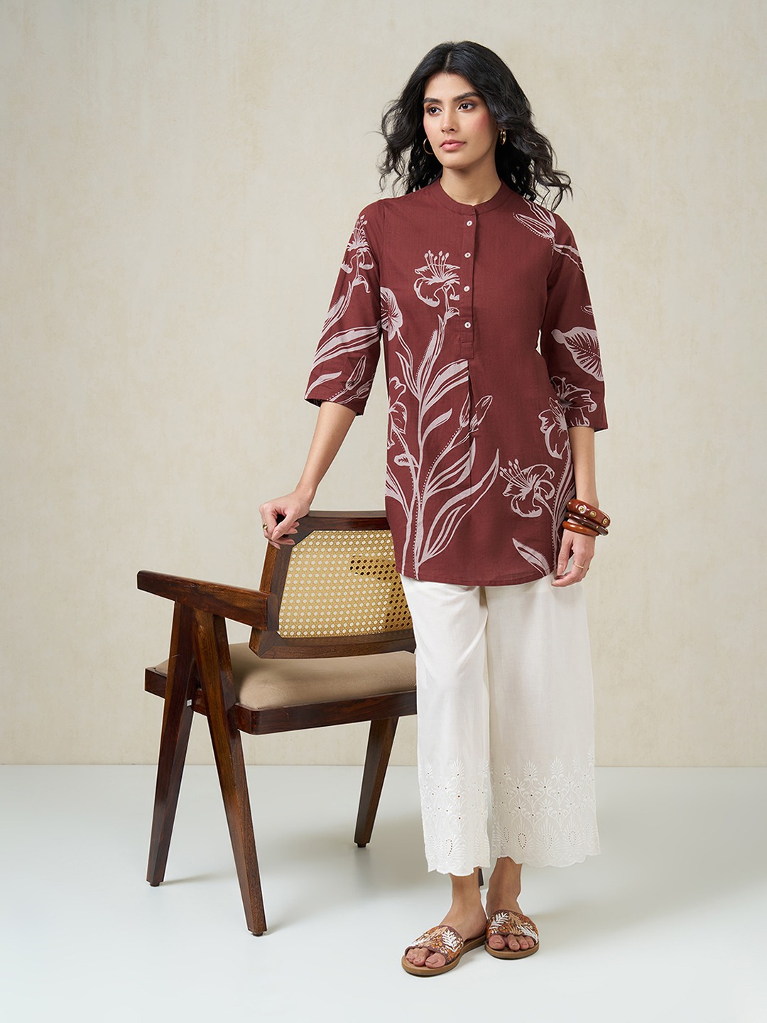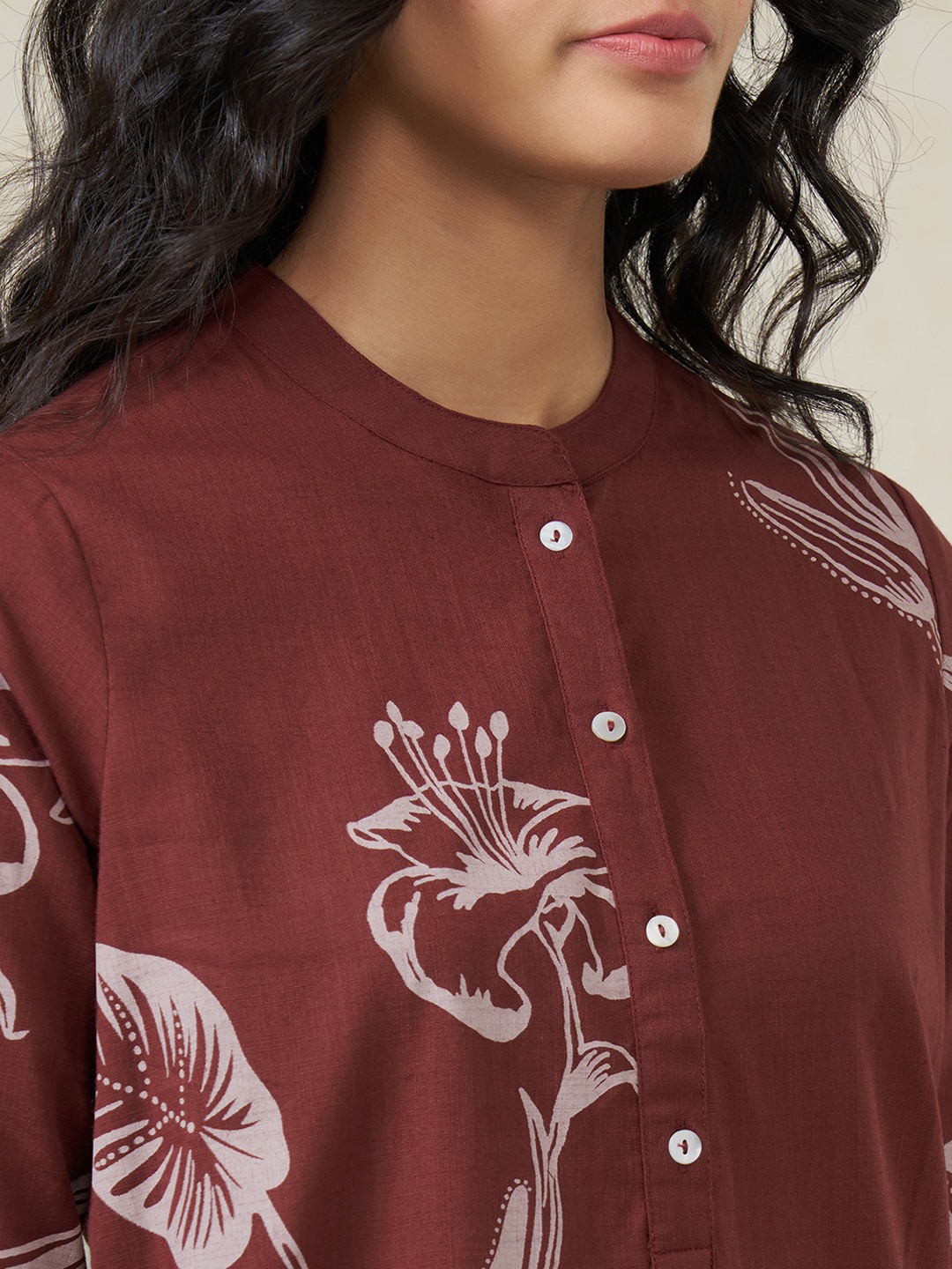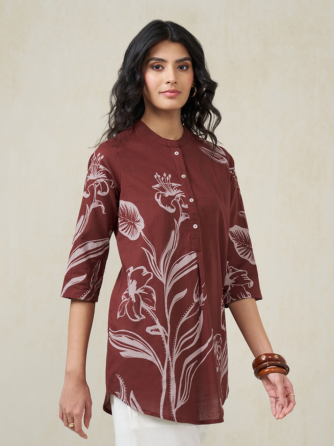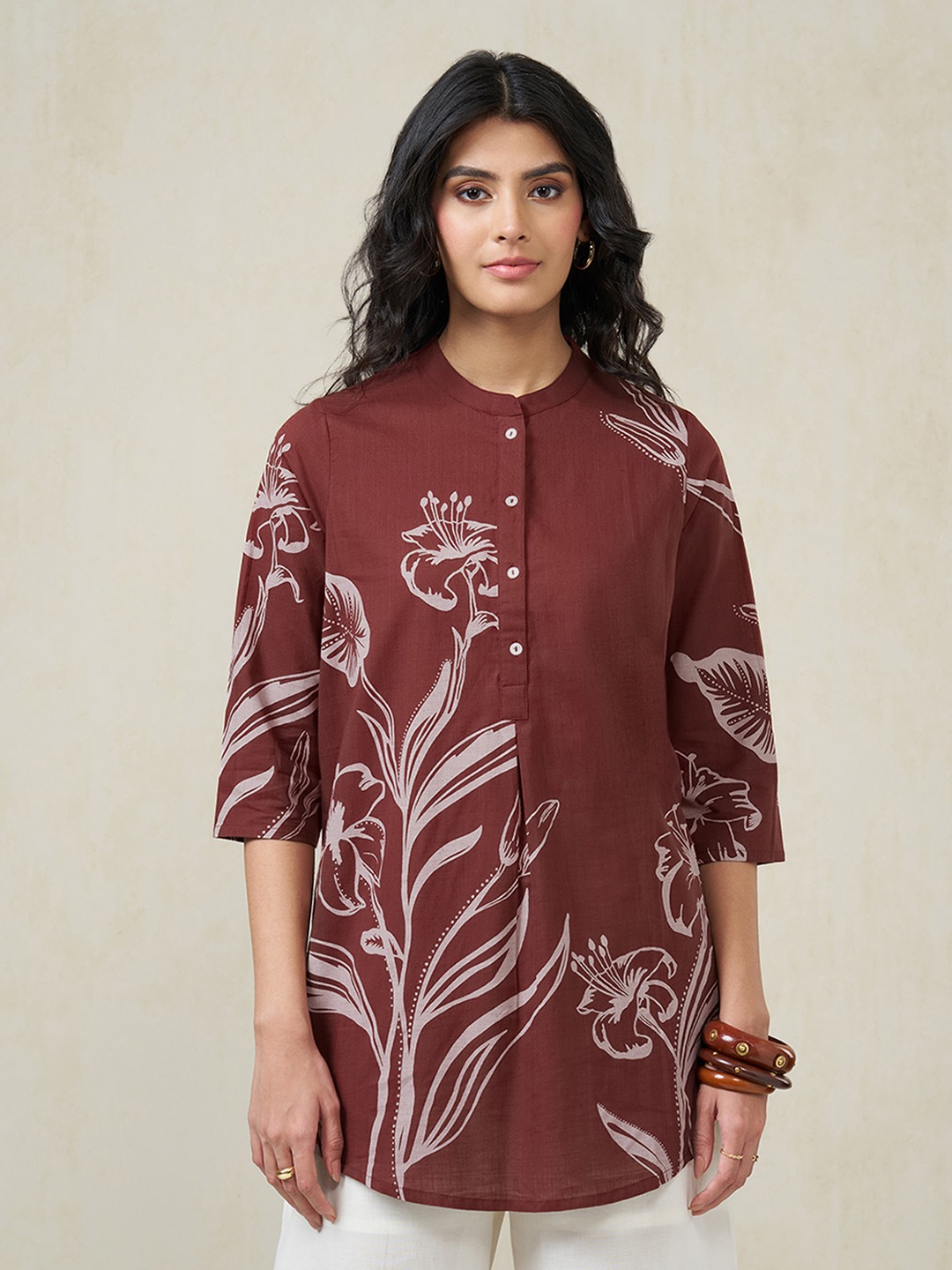 An easy refresh for everyday dressing. Designed with a mandarin collar, button placket and 3/4 sleeves, this tunic features a beautifully arranged floral print. The breathable fabric keeps it light and comfortable through long hours of wear.