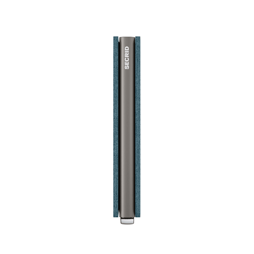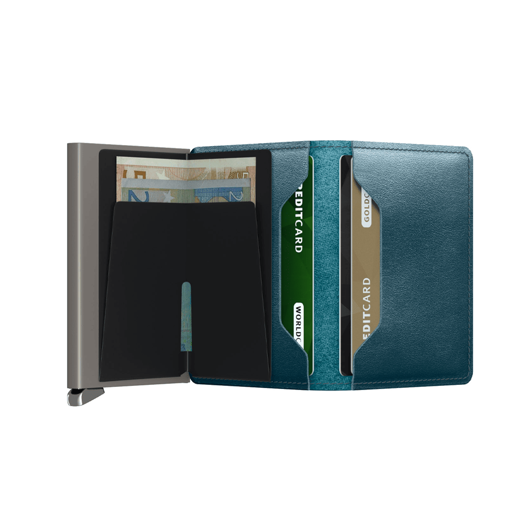 The Slimwallet is a modern take on the classic billfold. With its slim profile, it fits perfectly into every pocket. The Cardprotector mechanism allows you to slide your cards out with one simple motion, while the aluminium protects your cards from bending, breaking and unwanted wireless communication. The generously cut leather around it holds an additional six cards, banknotes and business cards.