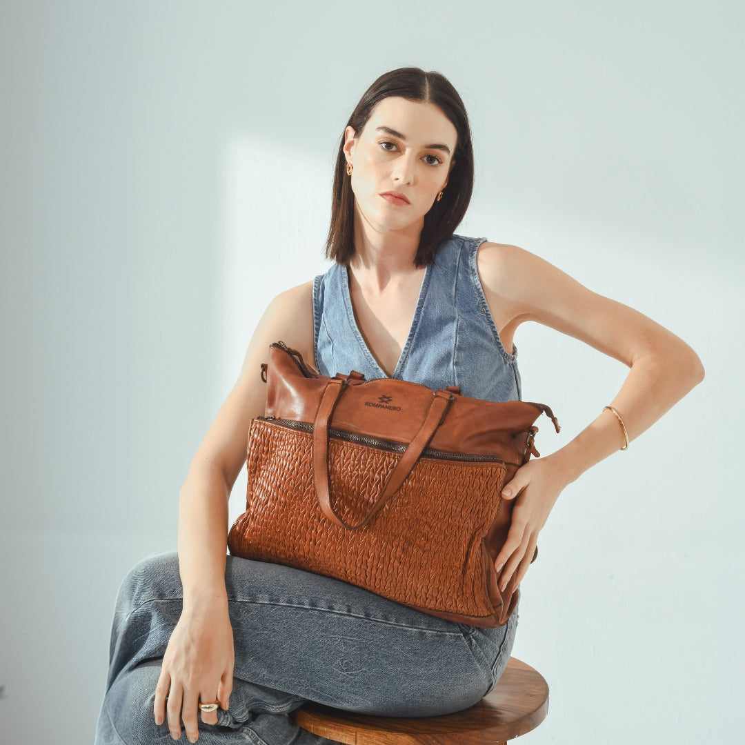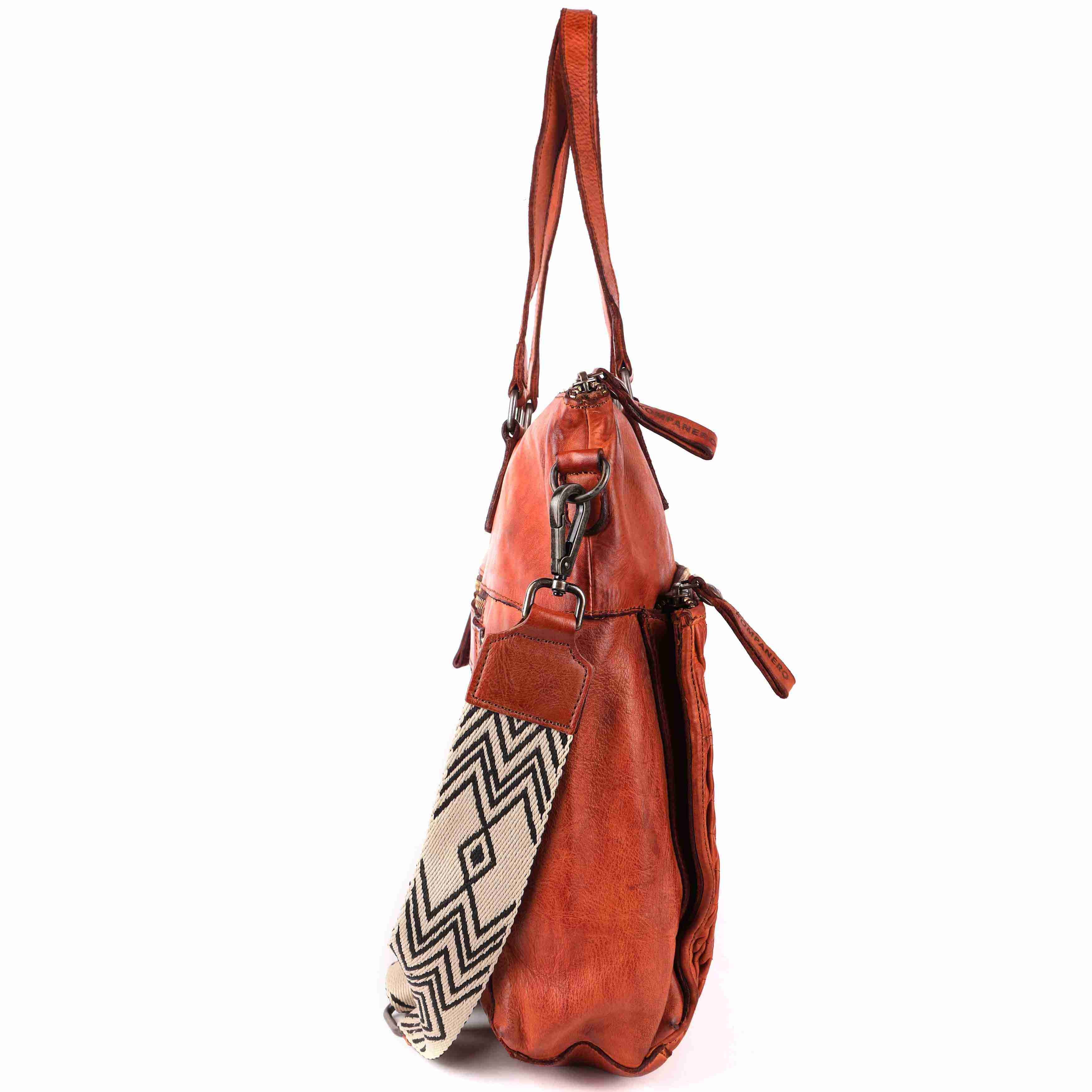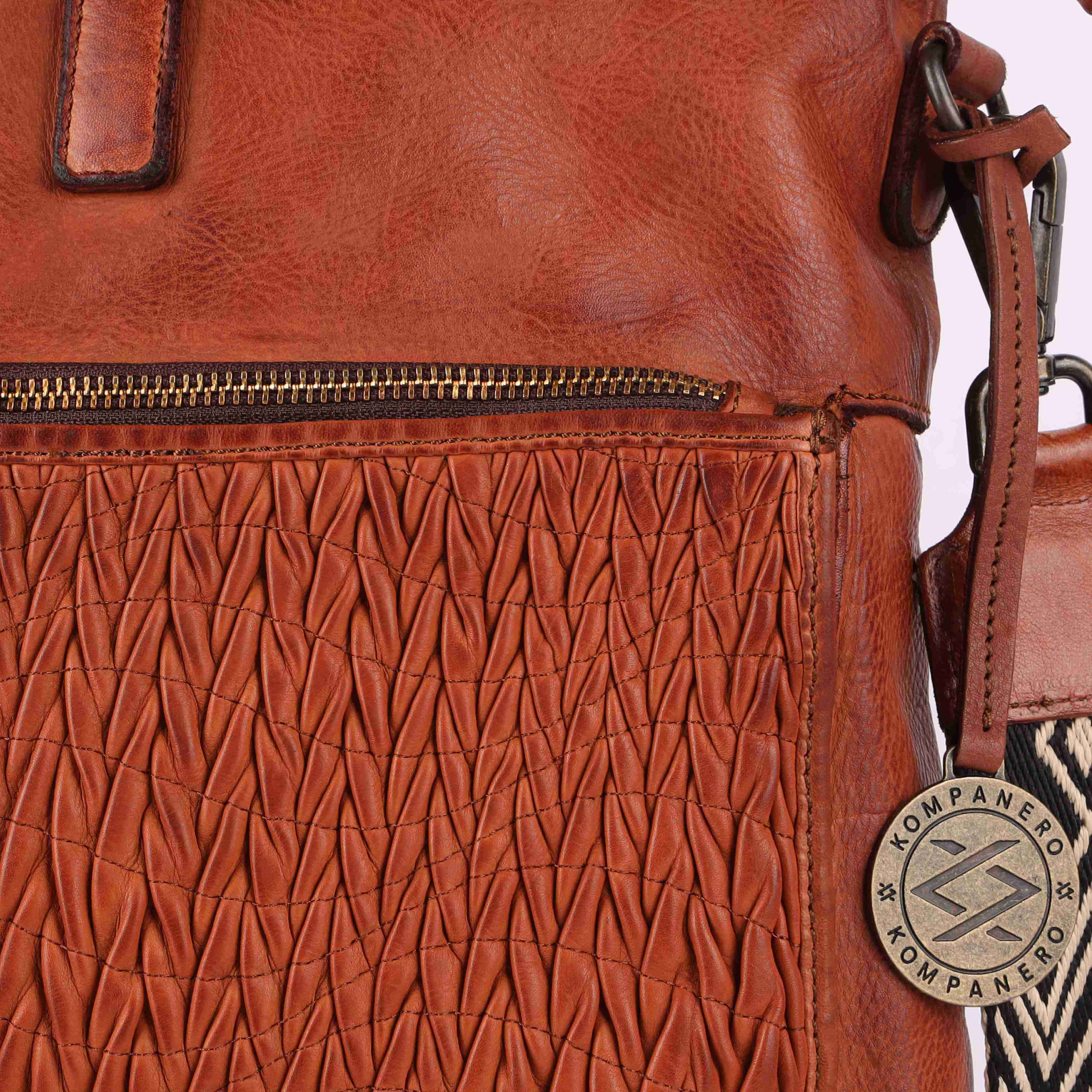 The Serena leather bags, made from LWG Gold certified vegetable-tanned leather, blend style and functionality. Featuring antique metal fittings and a multicolor jacquard strap, they are lined with cotton drill for protection.