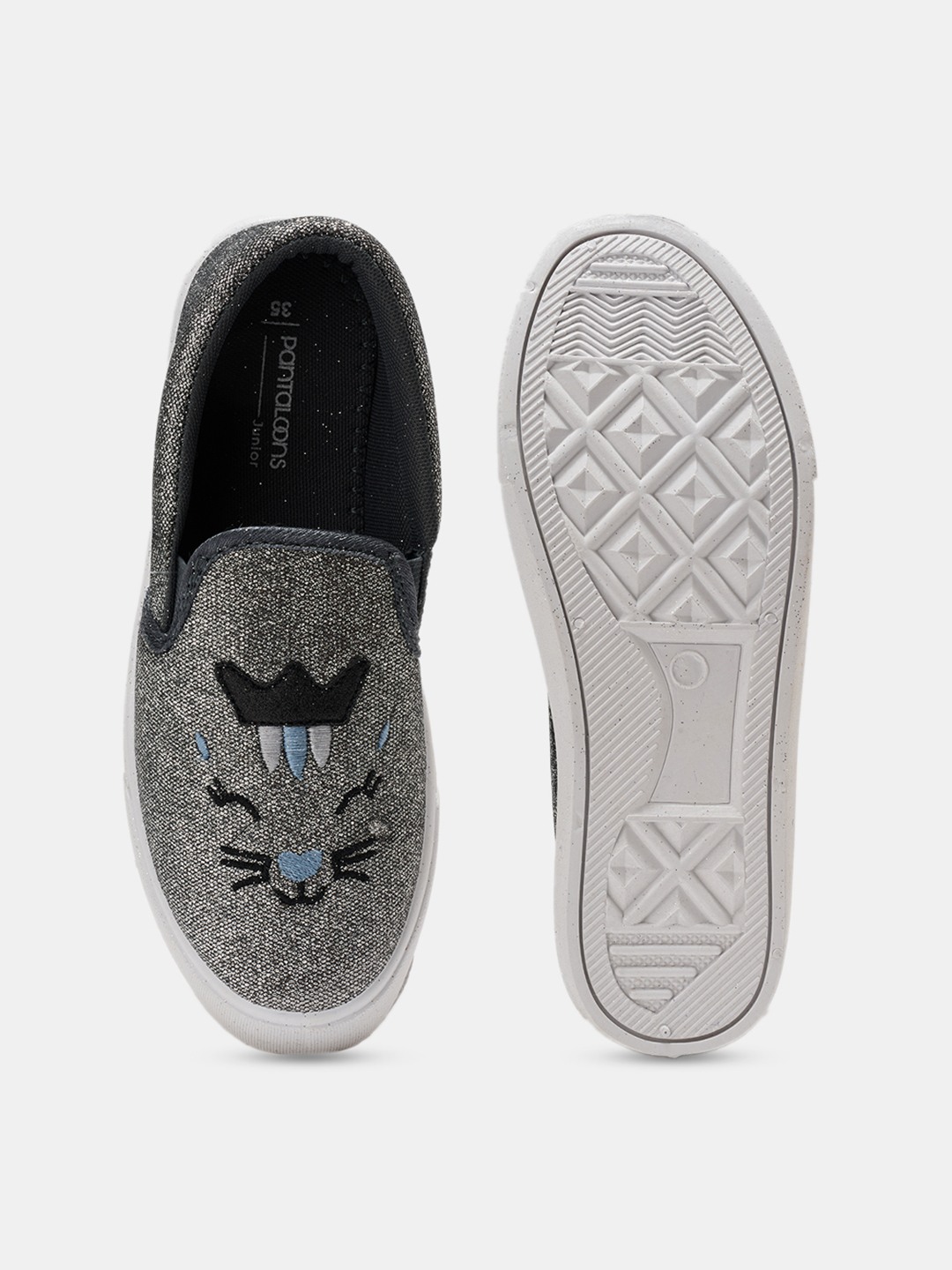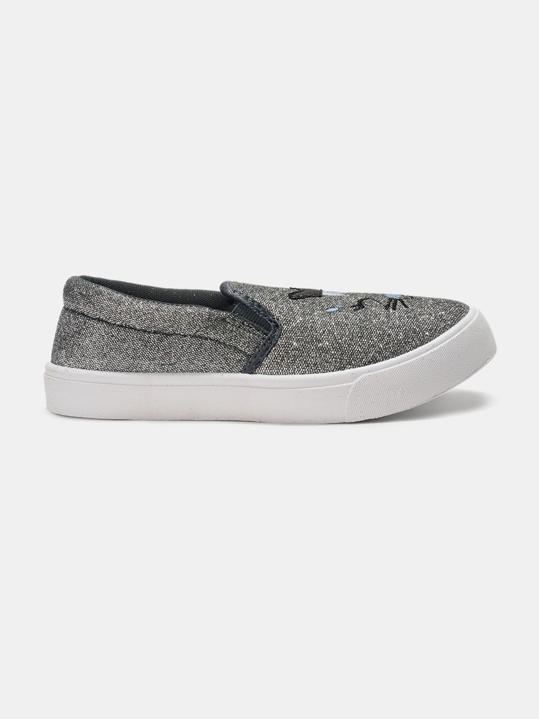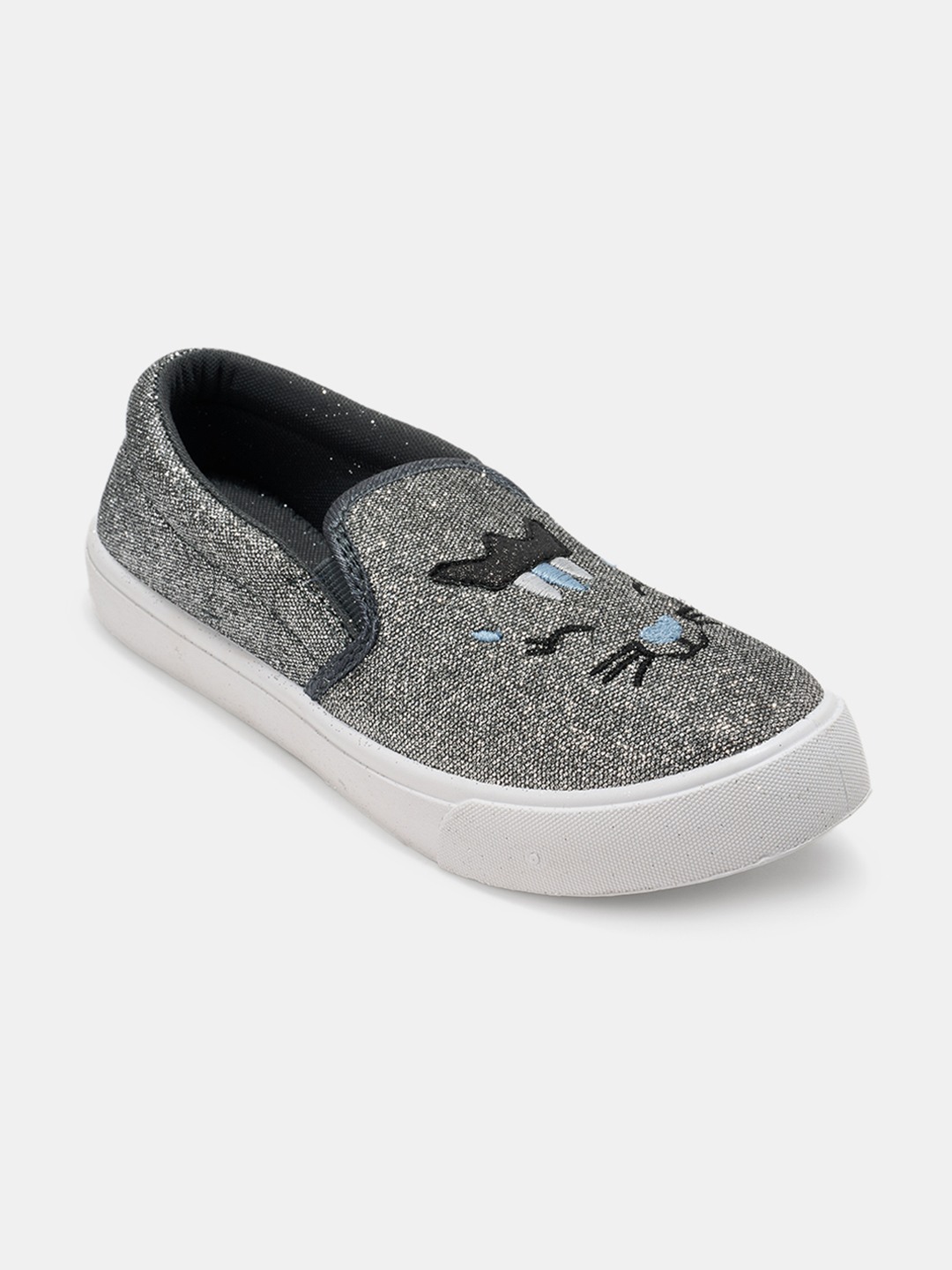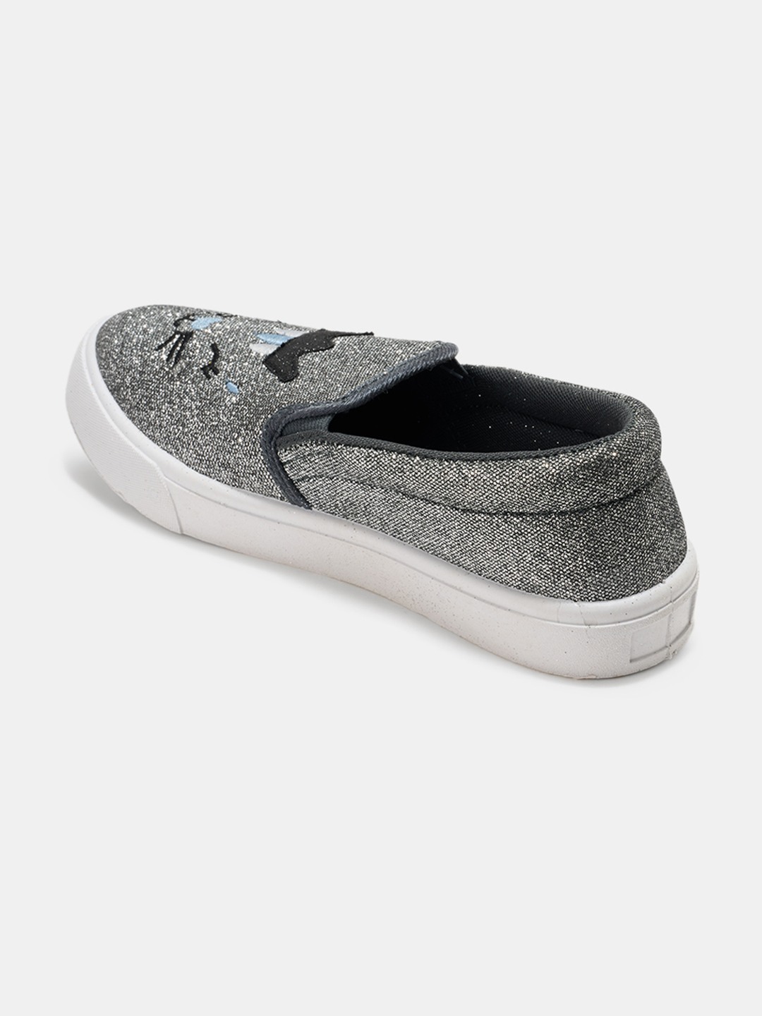 Sparkling and playful, these slip-ons feature a glitter finish with an embroidered cat face and crown motif. The easy slip-on style with cushioned insoles ensures comfort for all-day wear. A fun pair that adds shimmer and charm to casual looks.