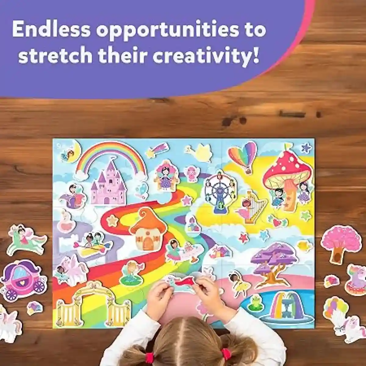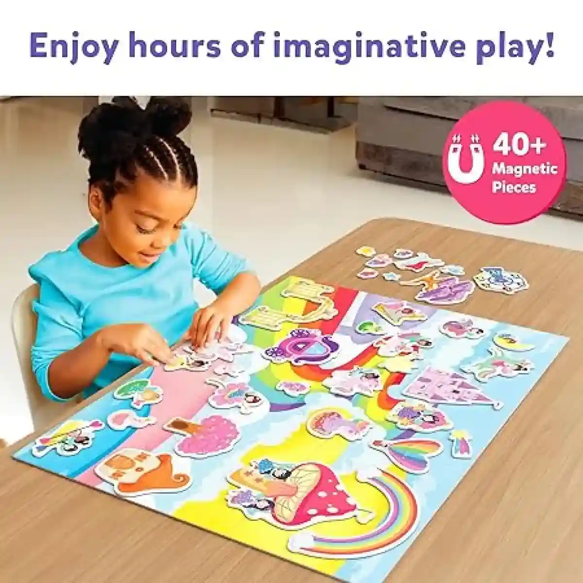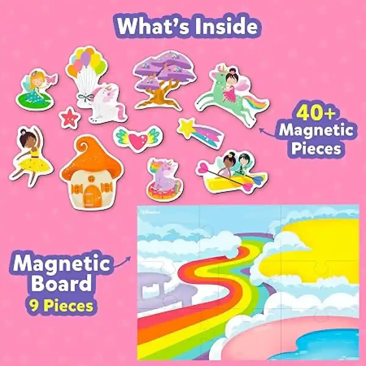 Build a world with 9 large puzzle pieces to create the backdrop for magical fun. Then add princesses, unicorns, castles, fountains, and more to create your very own world. With over 40 magnetic pieces, the possibilities are endless for hours of interactive pretend play.
