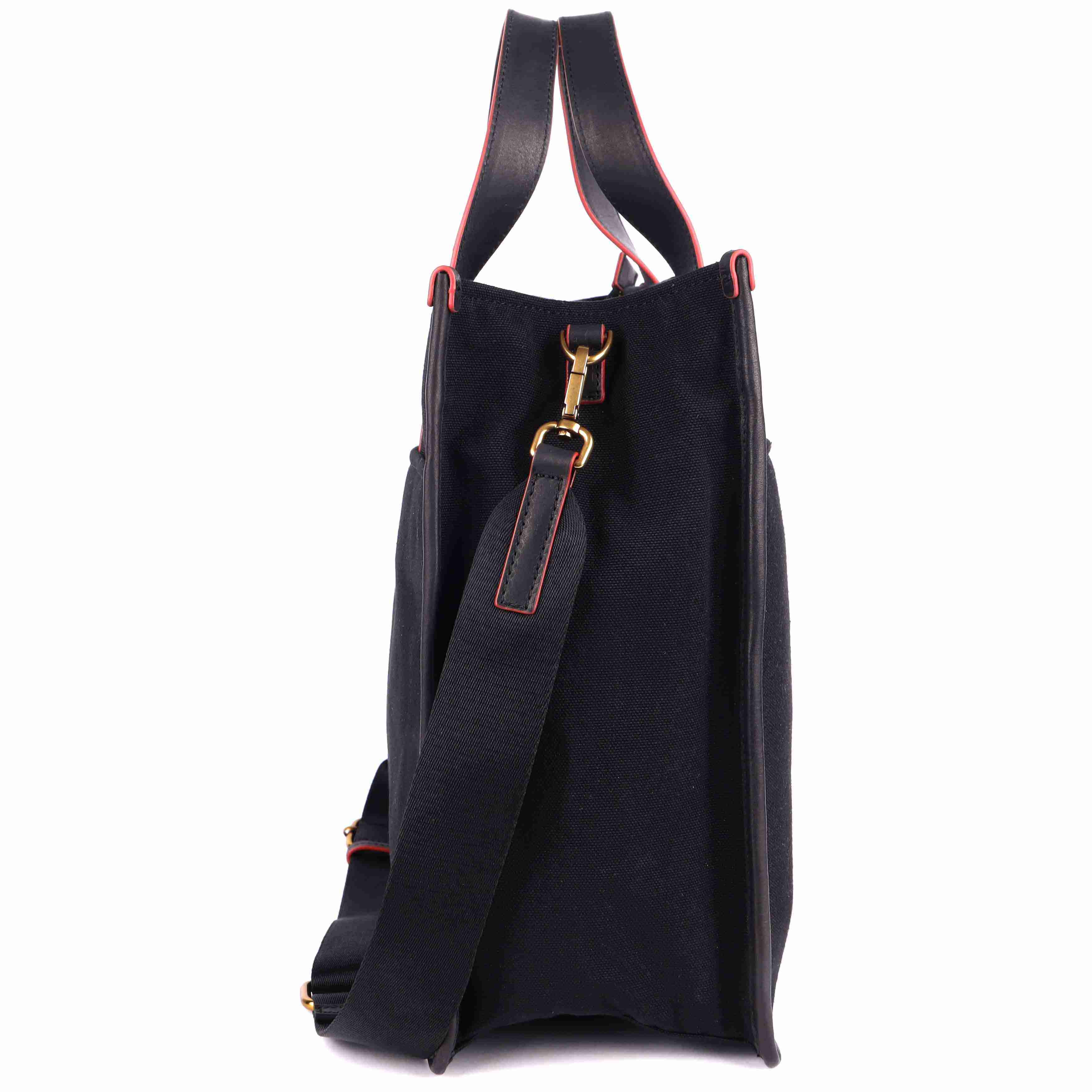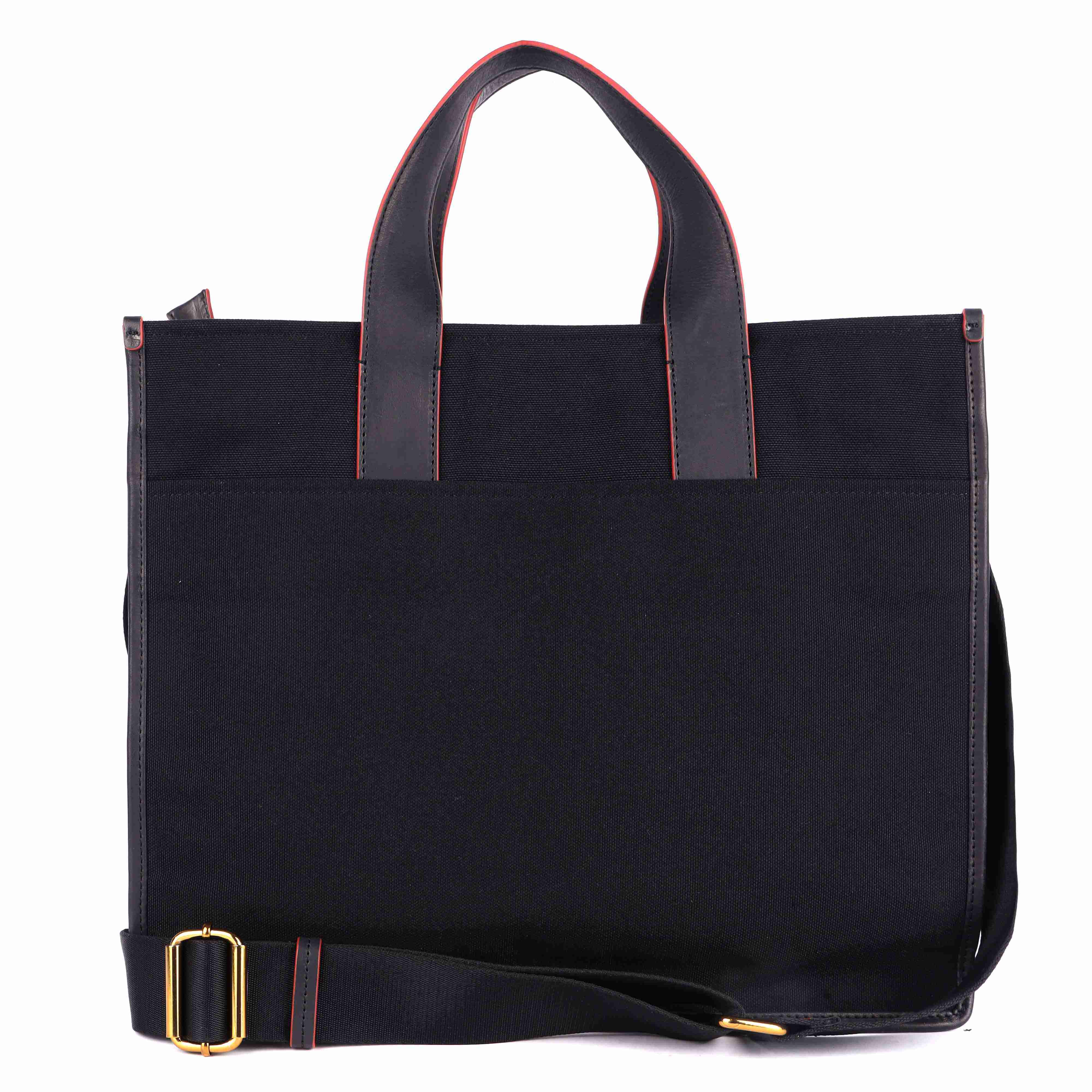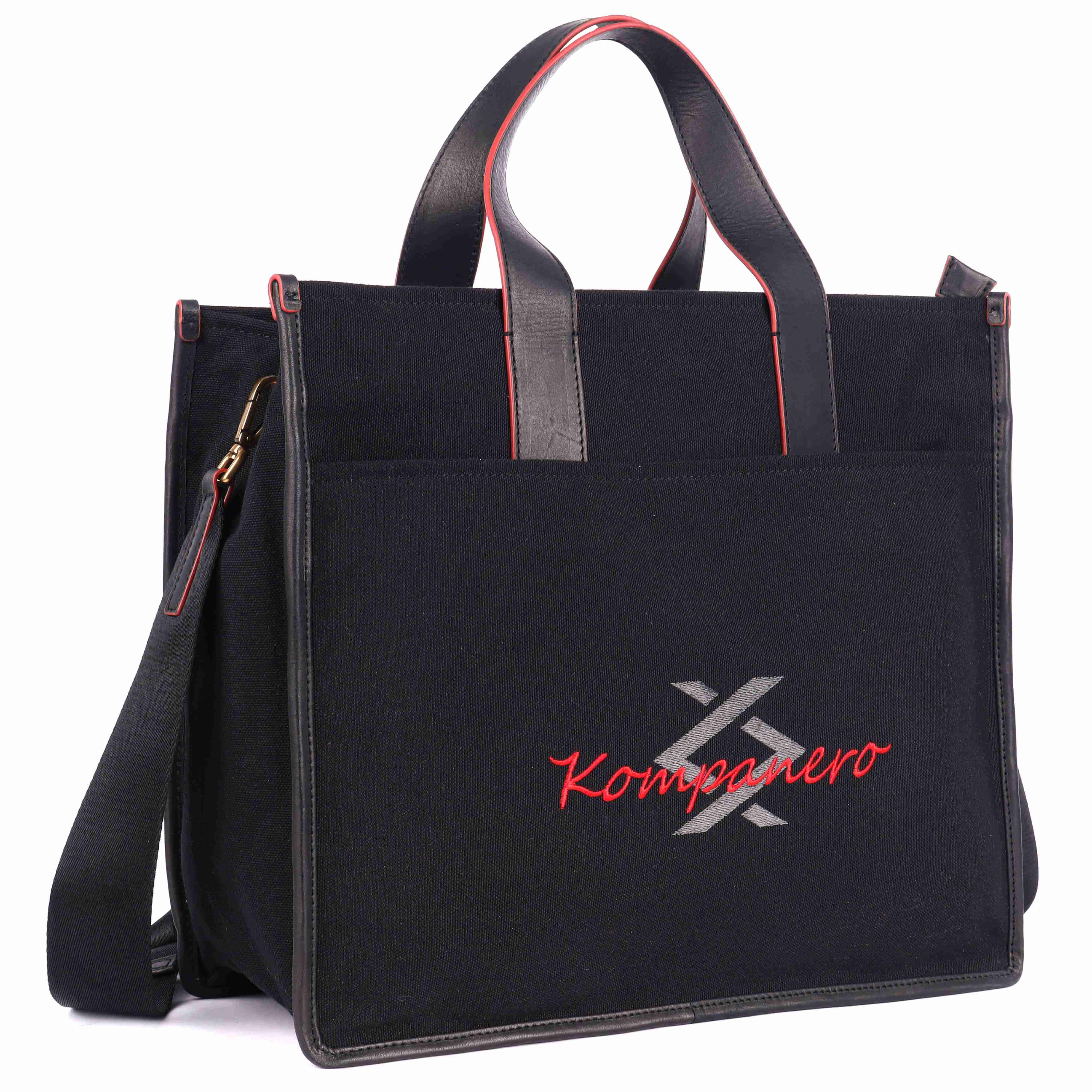 Crafted from solid black canvas and premium vegetable-tanned leather, this tote stands out with its striking red edge-inking that adds a bold finishing touch. The front embroidered branding elevates the design, making a unique and stylish statement that's both modern and timeless.
