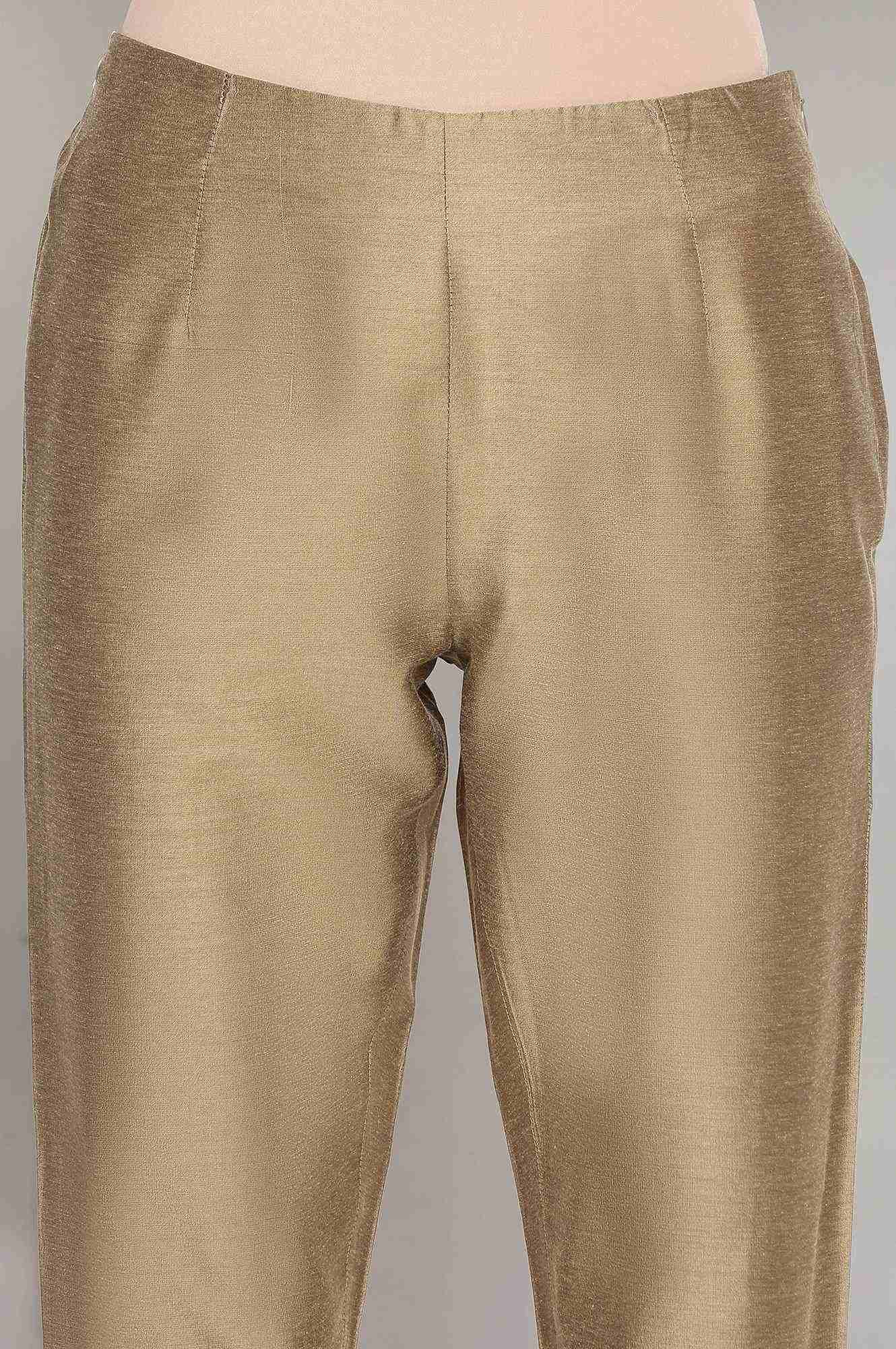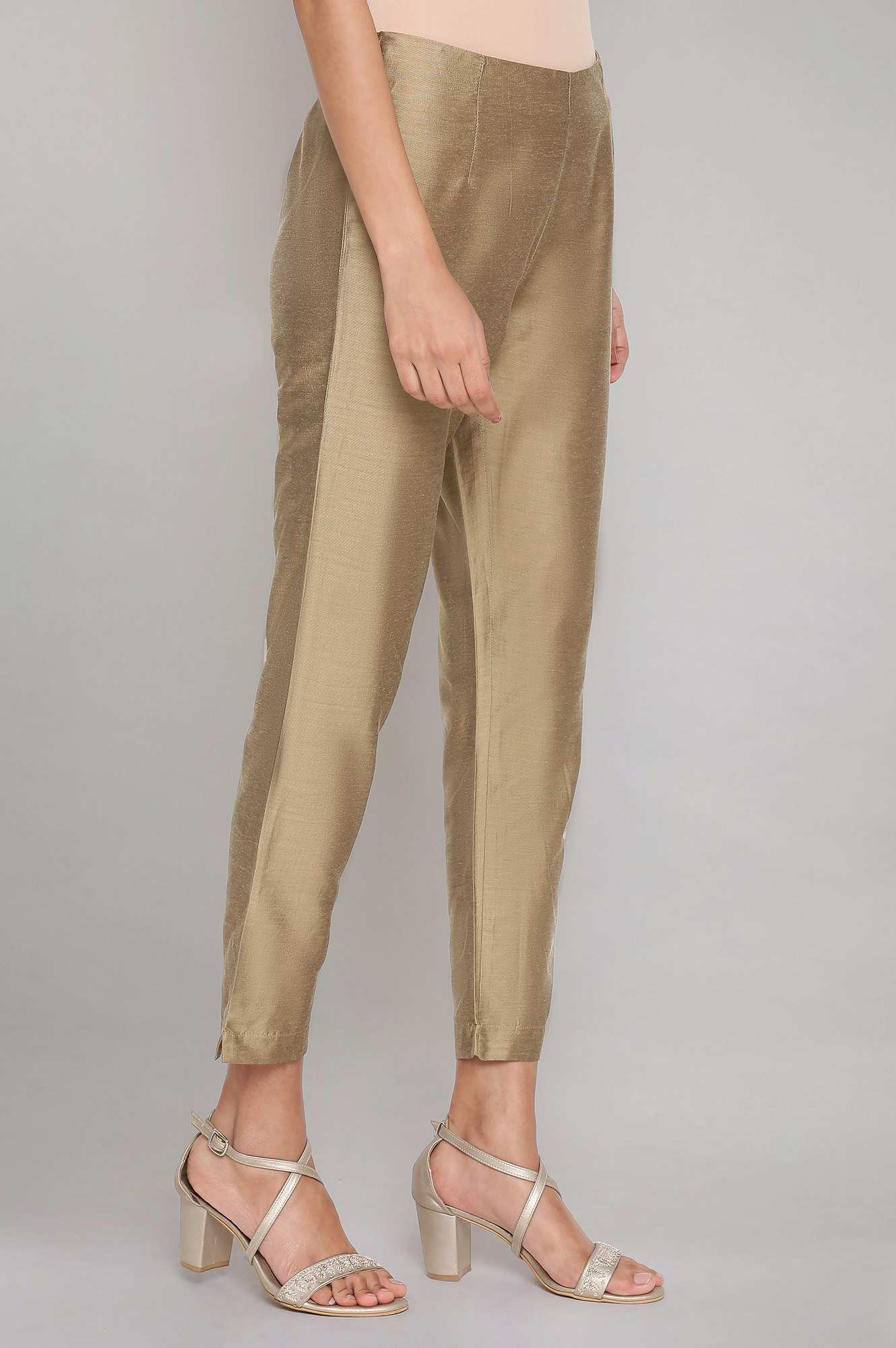 Golden fitted slim pants with zipper and button, and partially elasticated waistband.