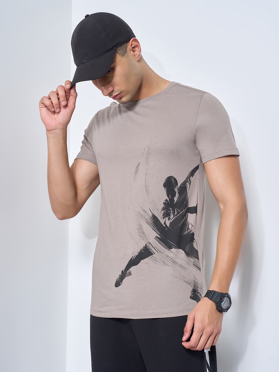 A modern tee that channels dynamic motion through its bold side graphic of an athlete in action. Designed with a crew neckline and clean half sleeves, it’s crafted from soft, breathable knit fabric for effortless comfort and structure. The sleek silhouette adds an edge of athletic energy to casual dressing.