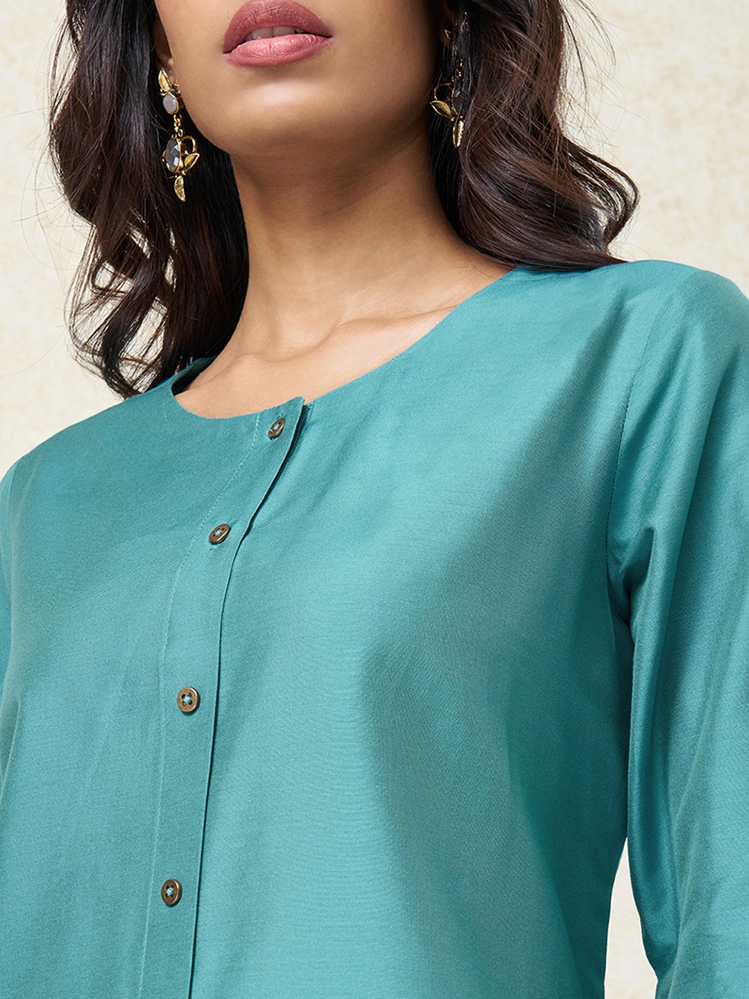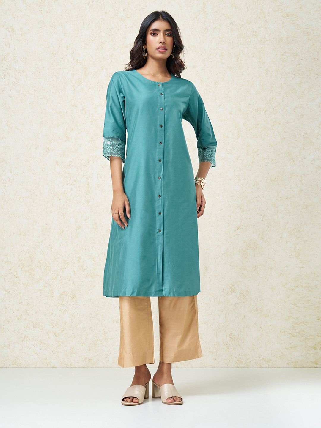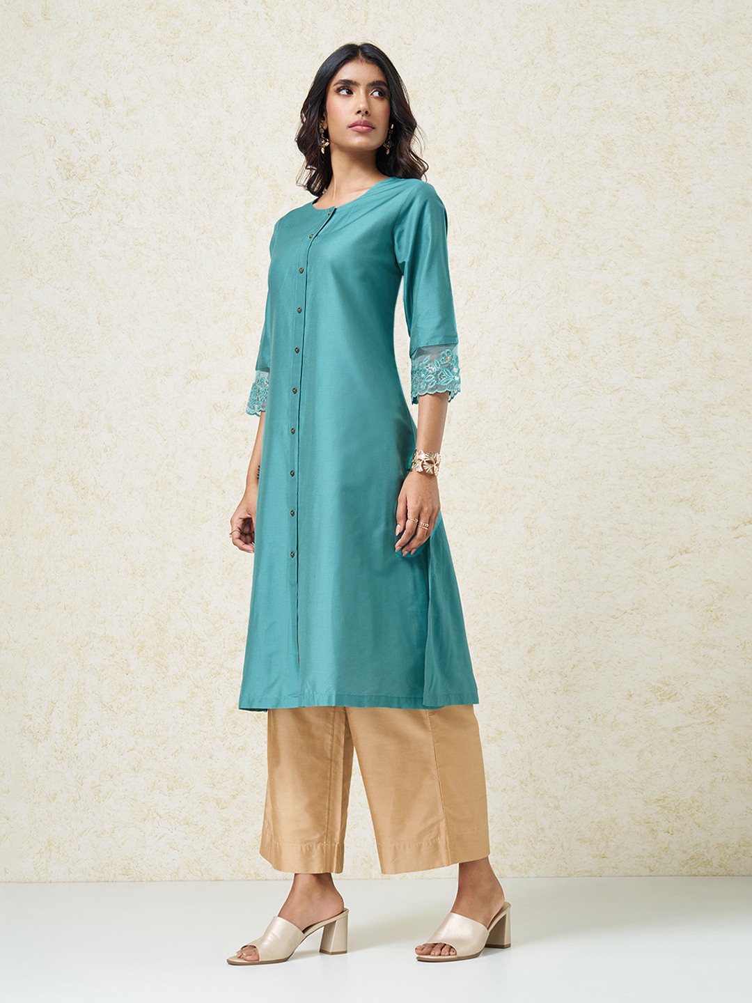 Designed for understated festive dressing, this kurta keeps the look clean while letting subtle details shine. It has a round neckline and full button placket and 3/4 sleeves finished with embroidered inserts that add a refined celebratory touch. Polished yet effortless, it’s ideal for intimate gatherings and elegant daytime occasions.