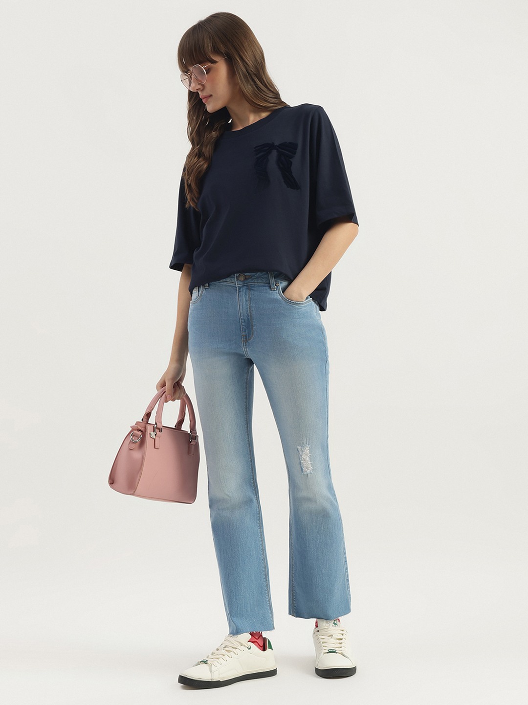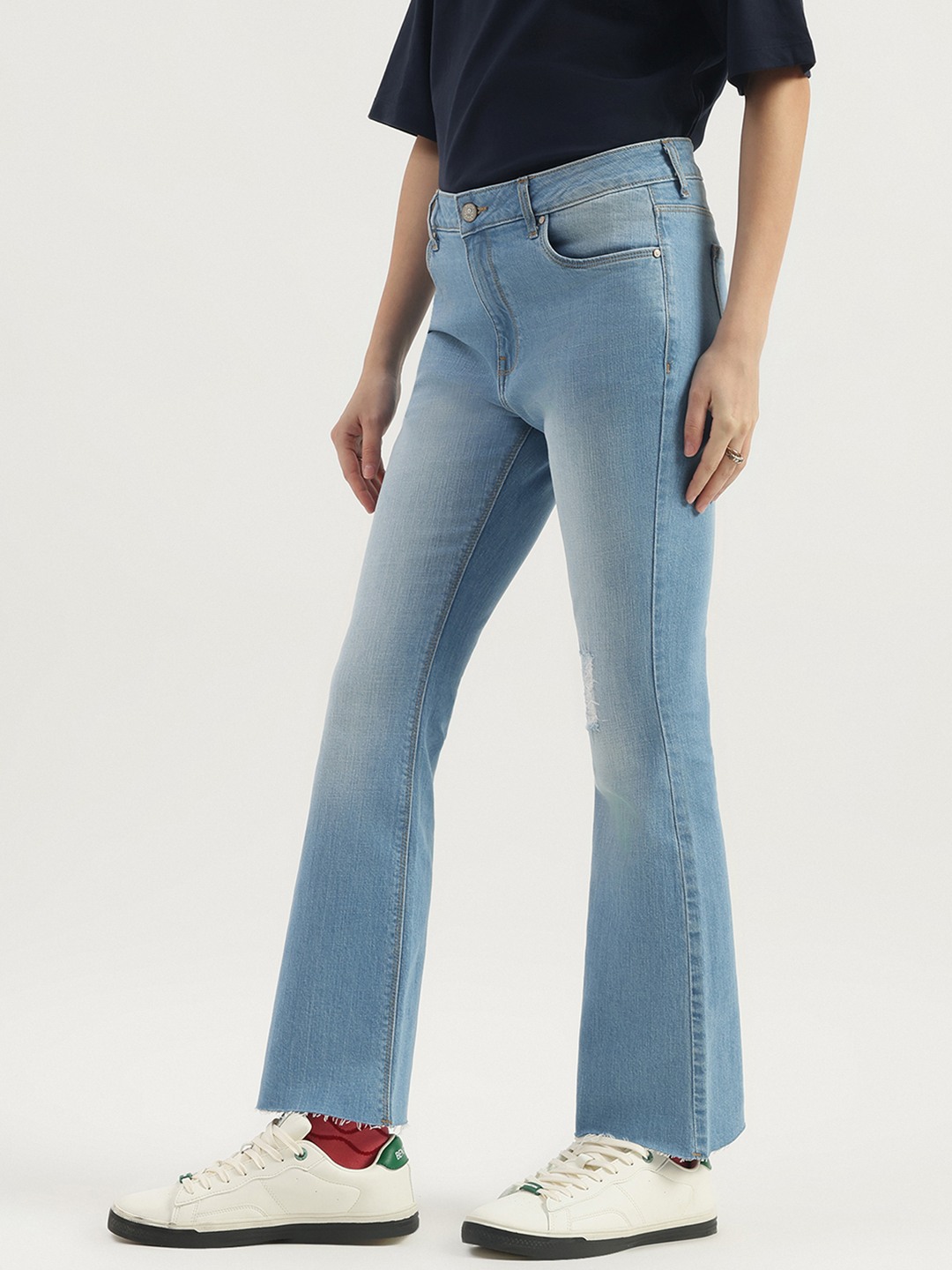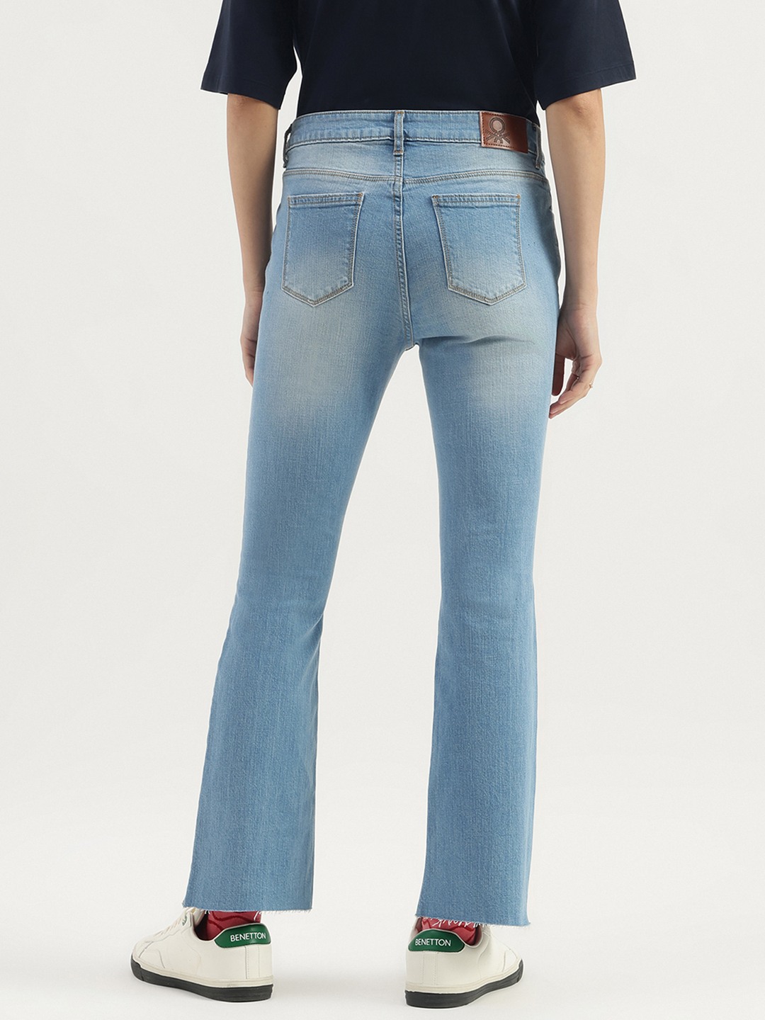 Elevate your style with our raw edges denim jeans in a stunning blue hue. Featuring a bootcut fit and solid pattern, these high-rise jeans offer a flattering silhouette. Crafted from durable polycotton fabric, they ensure comfort and longevity. The button closure adds a classic touch, perfect for the modern woman.