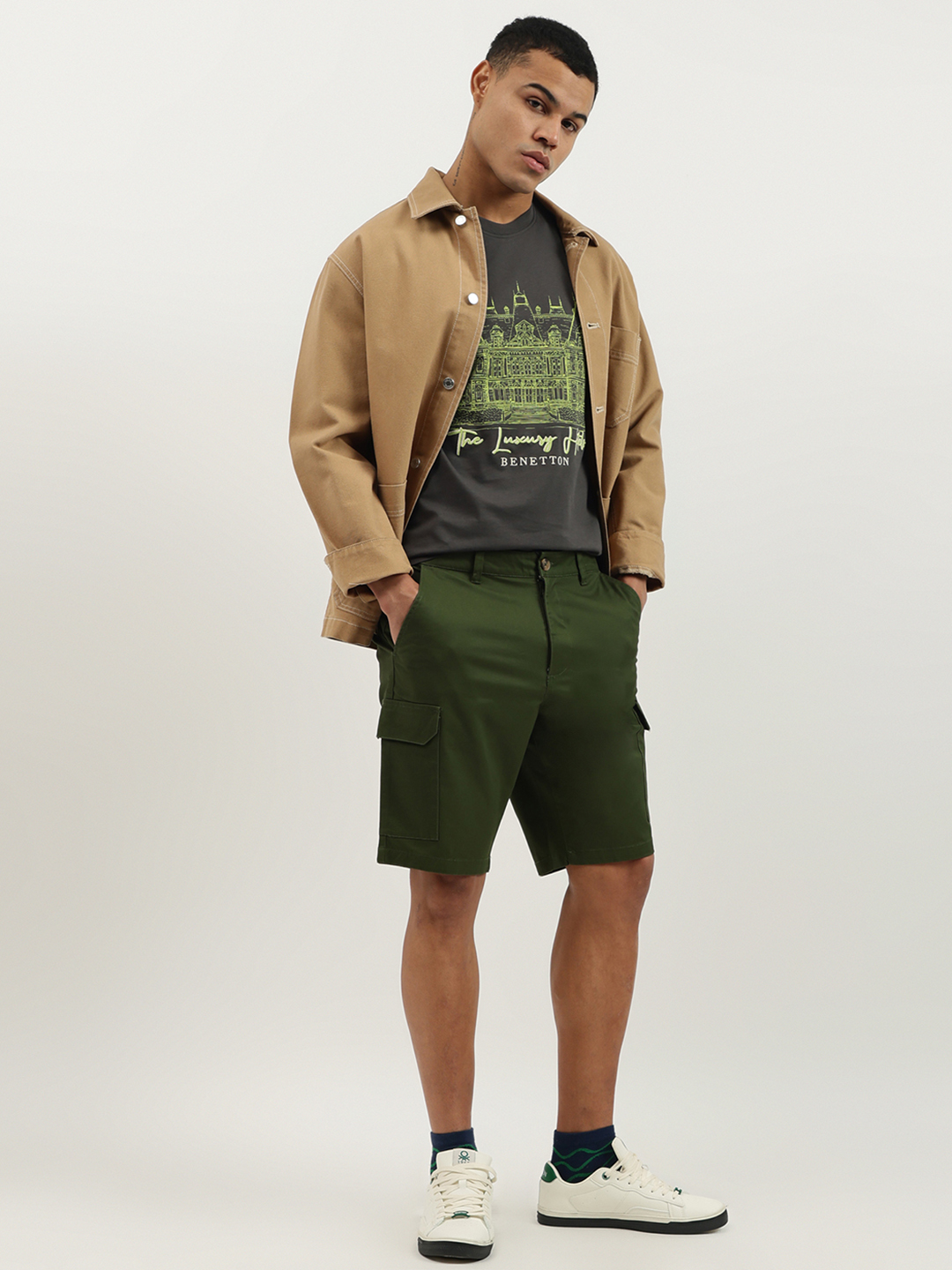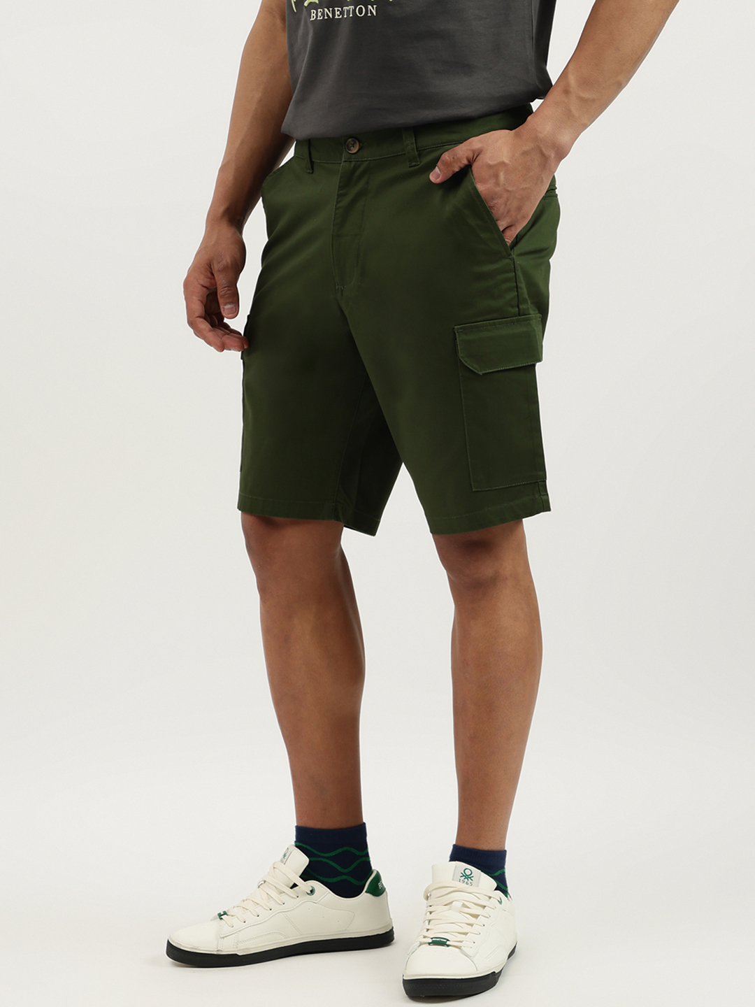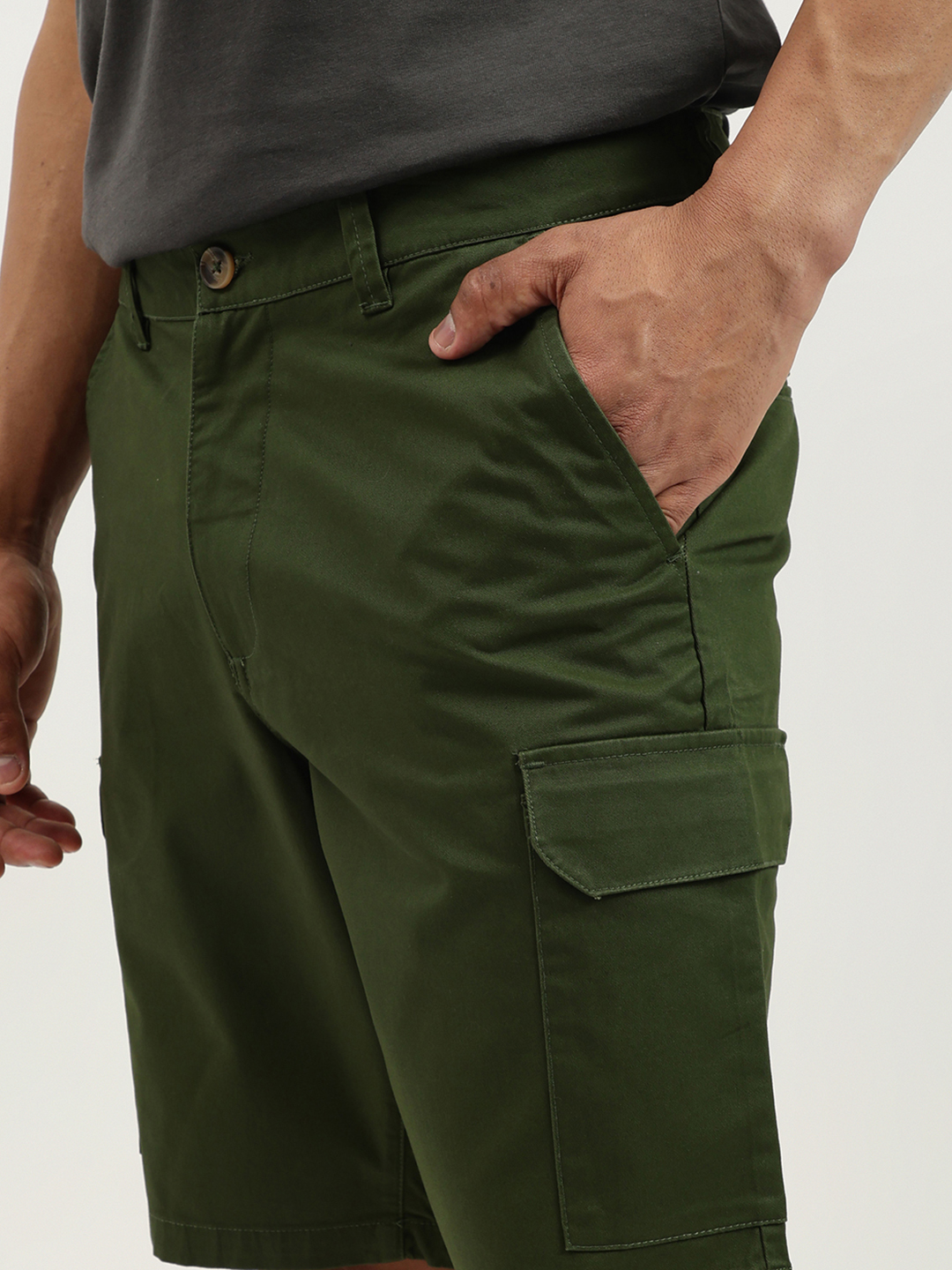 Discover ultimate comfort with our green cargo shorts for men. Crafted from a soft cotton blend, these mid-rise shorts feature a solid pattern, button and zip closure, and a relaxed fit. Perfect for casual outings, they offer ample pocket space for essentials, combining style and functionality effortlessly.