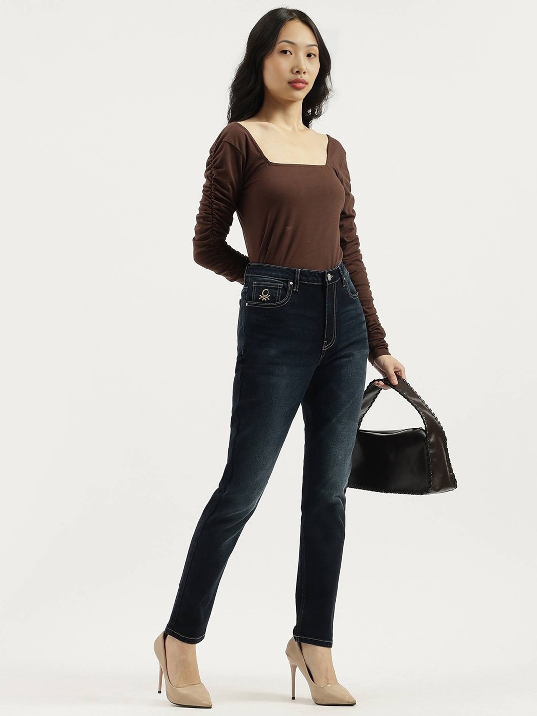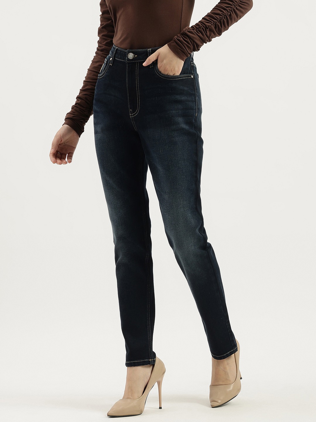 Discover the perfect blend of style and comfort with our blue skinny fit denim jeans for women. Crafted from durable polycotton fabric, these high-rise jeans feature a sleek solid pattern and convenient zipper closure. Ideal for any occasion, they offer a flattering silhouette and versatile wardrobe essential.