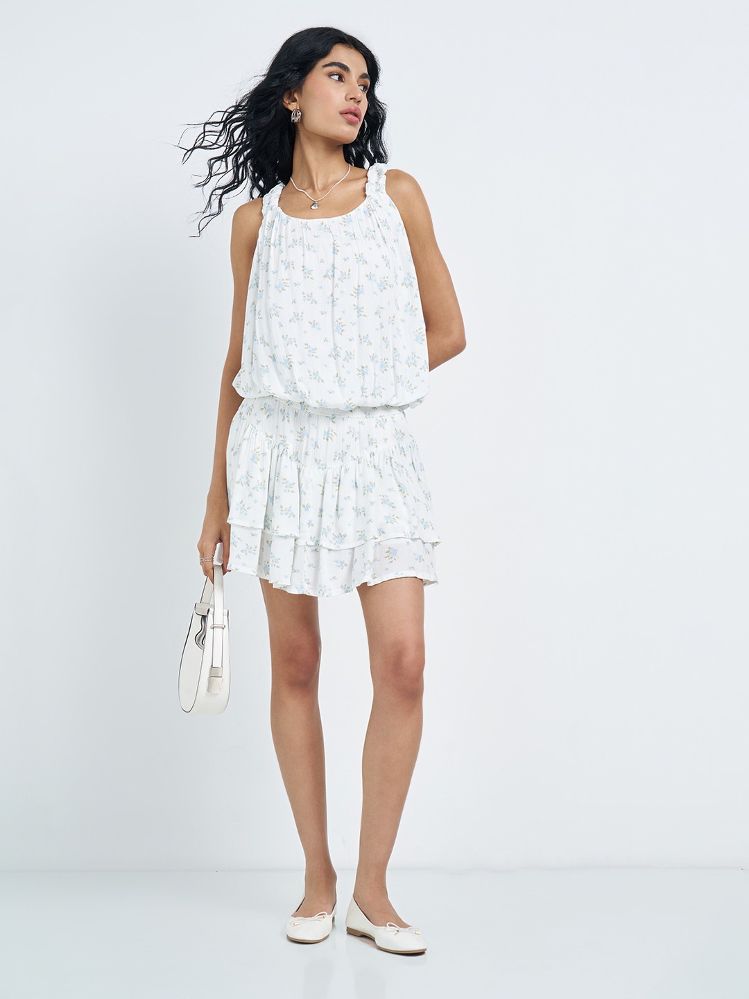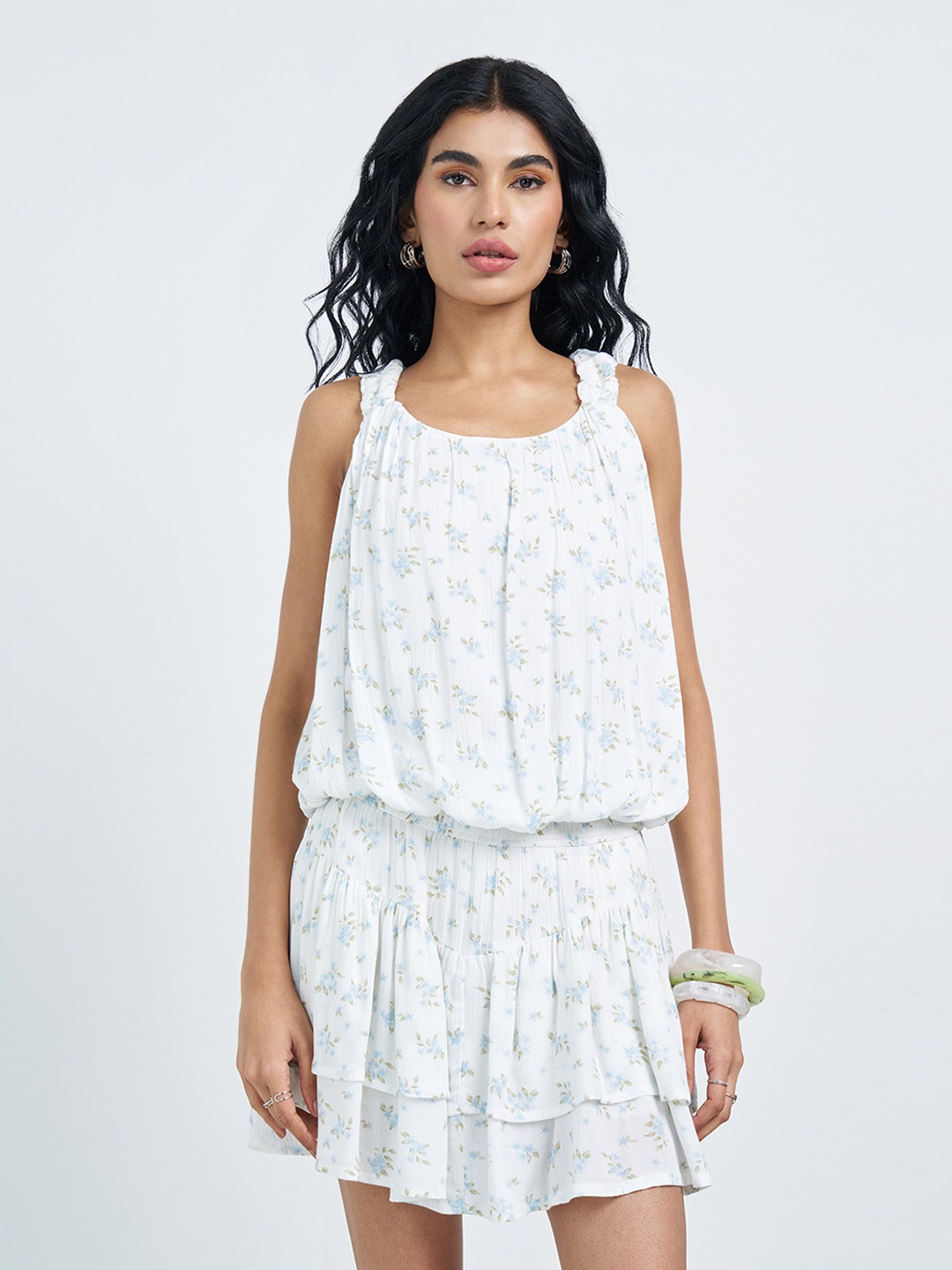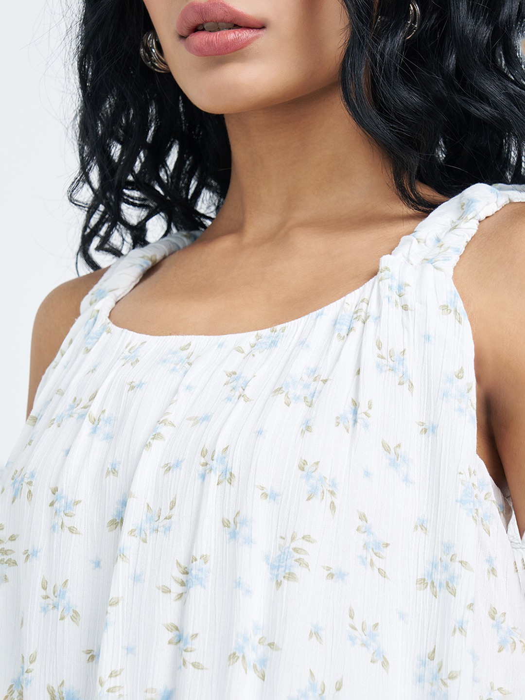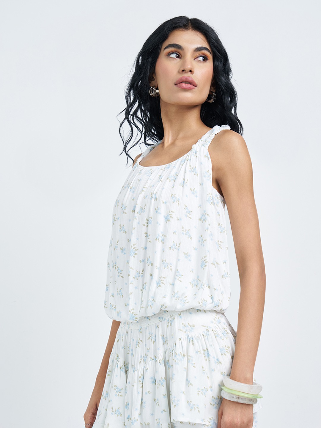 Light and breezy with a soft, feminine flow. This sleeveless top features a gathered neckline, ruched shoulder straps and an elasticated waist that creates a relaxed blouson silhouette, finished with an all-over delicate floral print. Easy to wear yet thoughtfully detailed, it brings effortless movement to warm-weather looks.