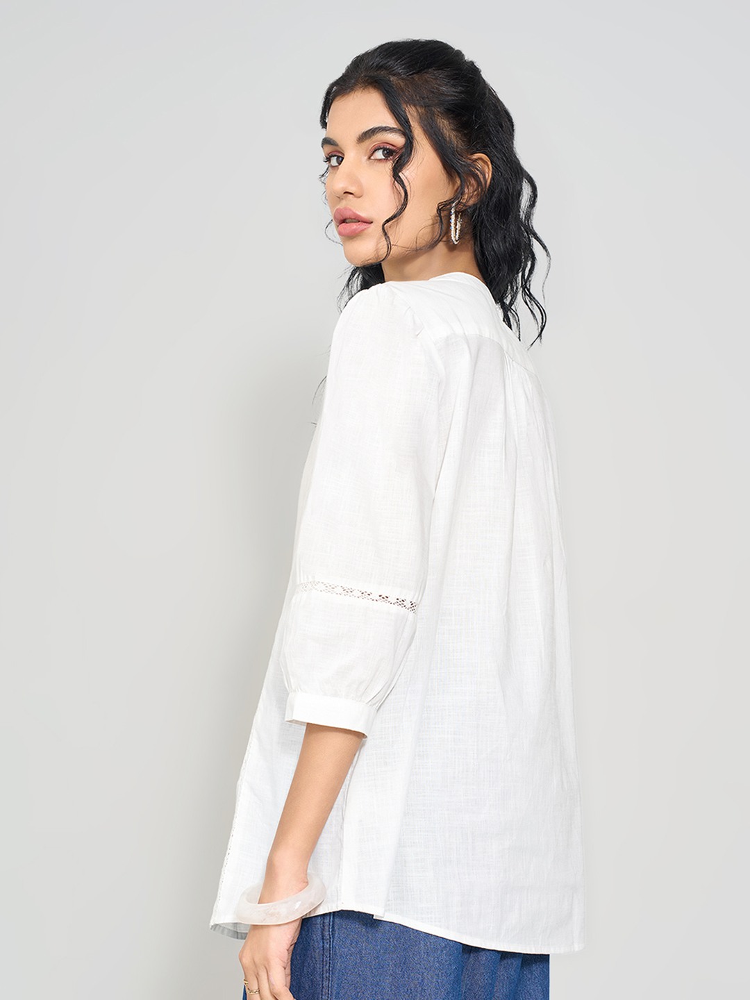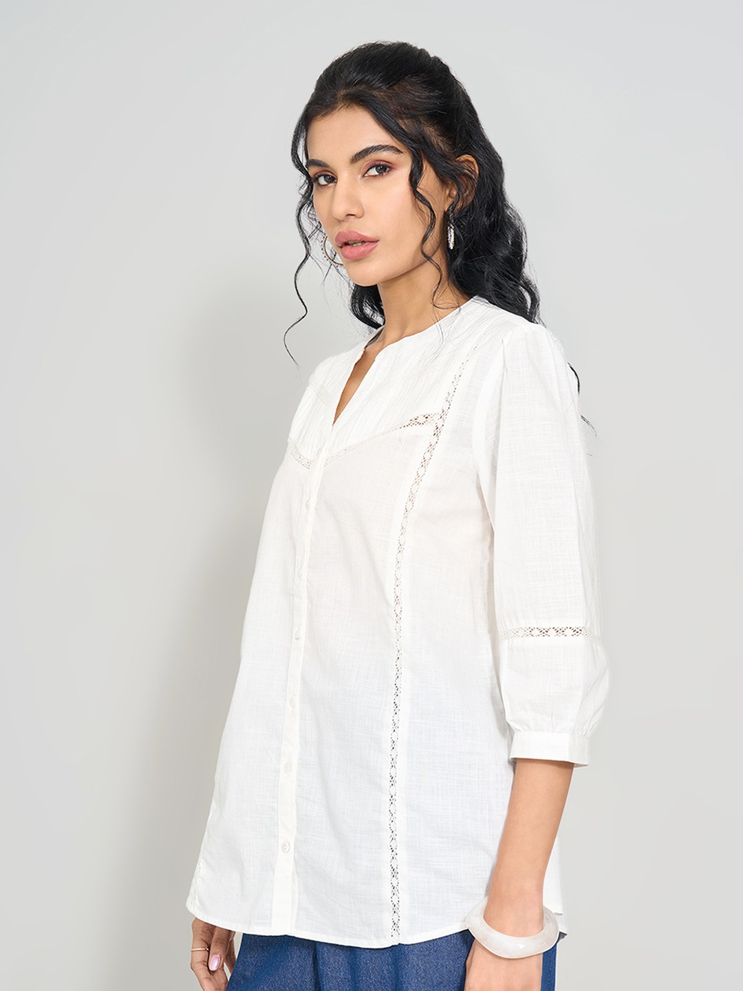 Effortlessly chic in every detail. This airy tunic is designed with pintuck accents on the yoke, lace inserts along the front and sleeves, and a buttoned placket. Featuring a banded neckline and 3/4 sleeves, it balances simplicity with crafted detail. The lightweight fabric gives it a relaxed, breathable drape.
