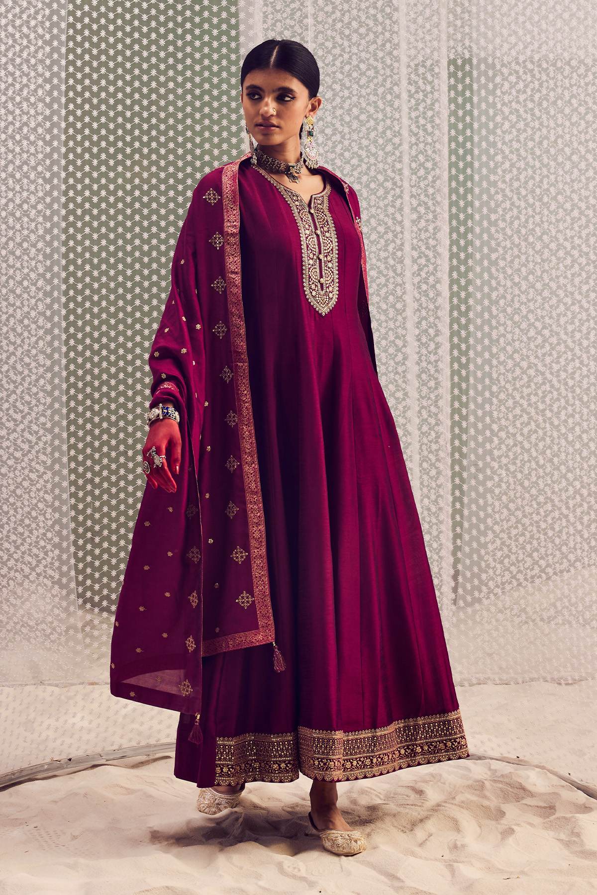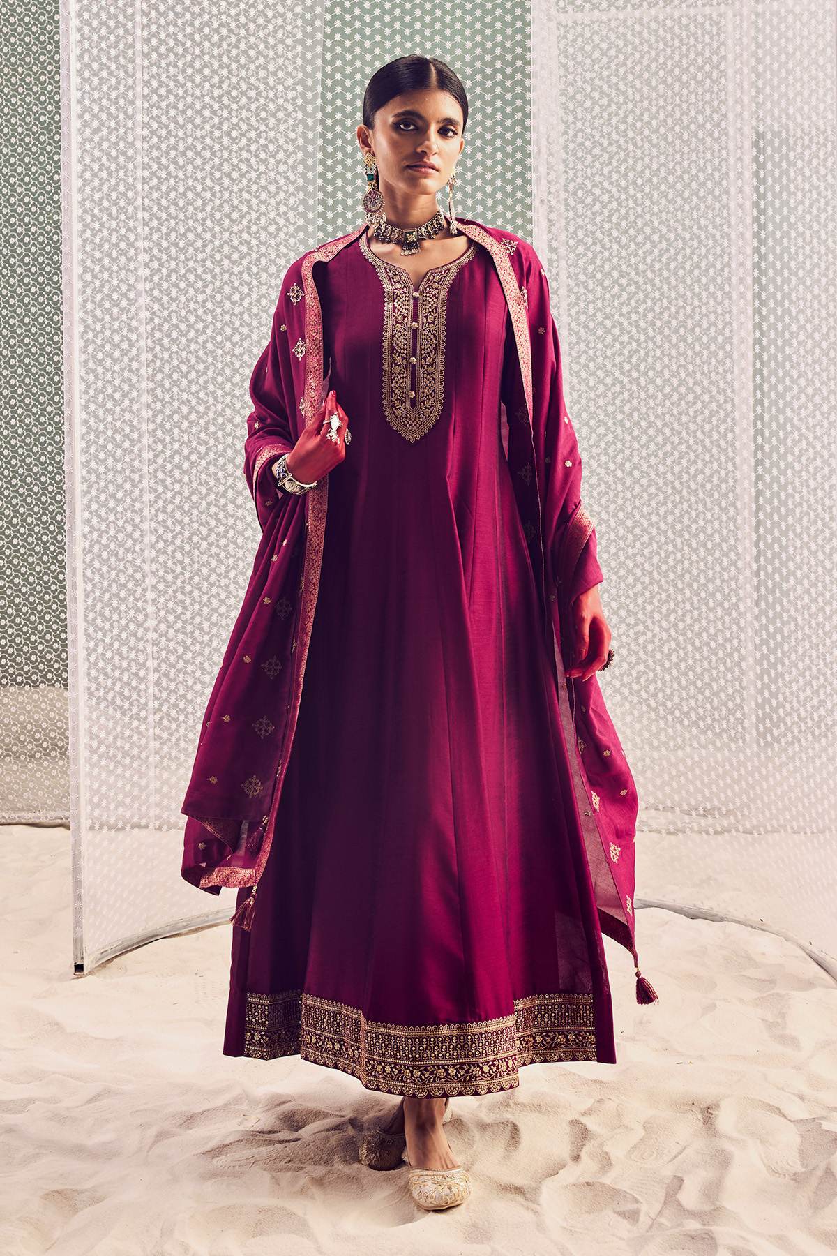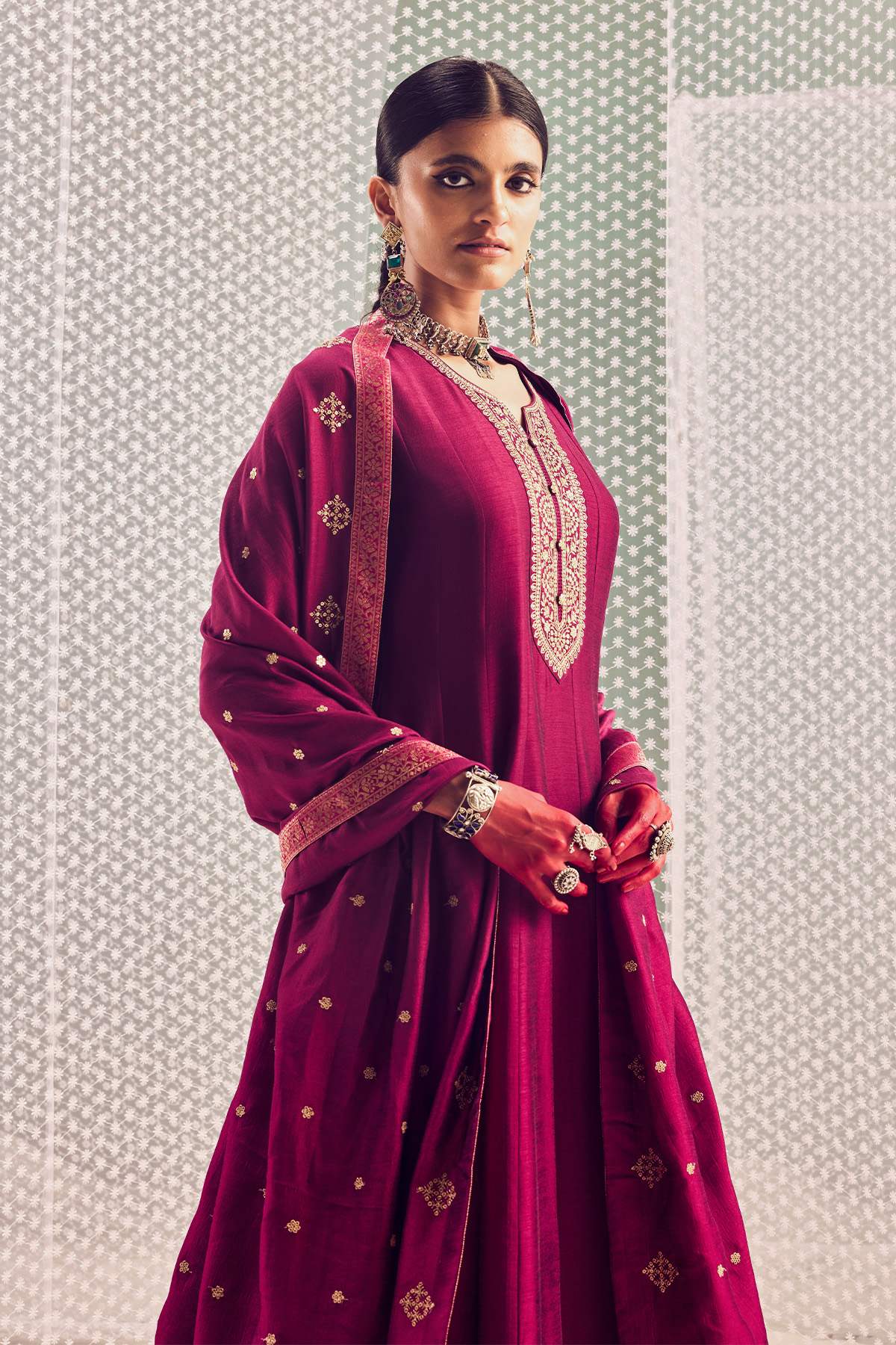 Introducing our stunning wine yoke zari embroidered solid flared dress with dupatta set. this exquisite ensemble features a portrait neckline, long sleeves, and a flared hemline that reaches ankle length. crafted from luxurious banglori silk, it offers both elegance and comfort for any special occasion.