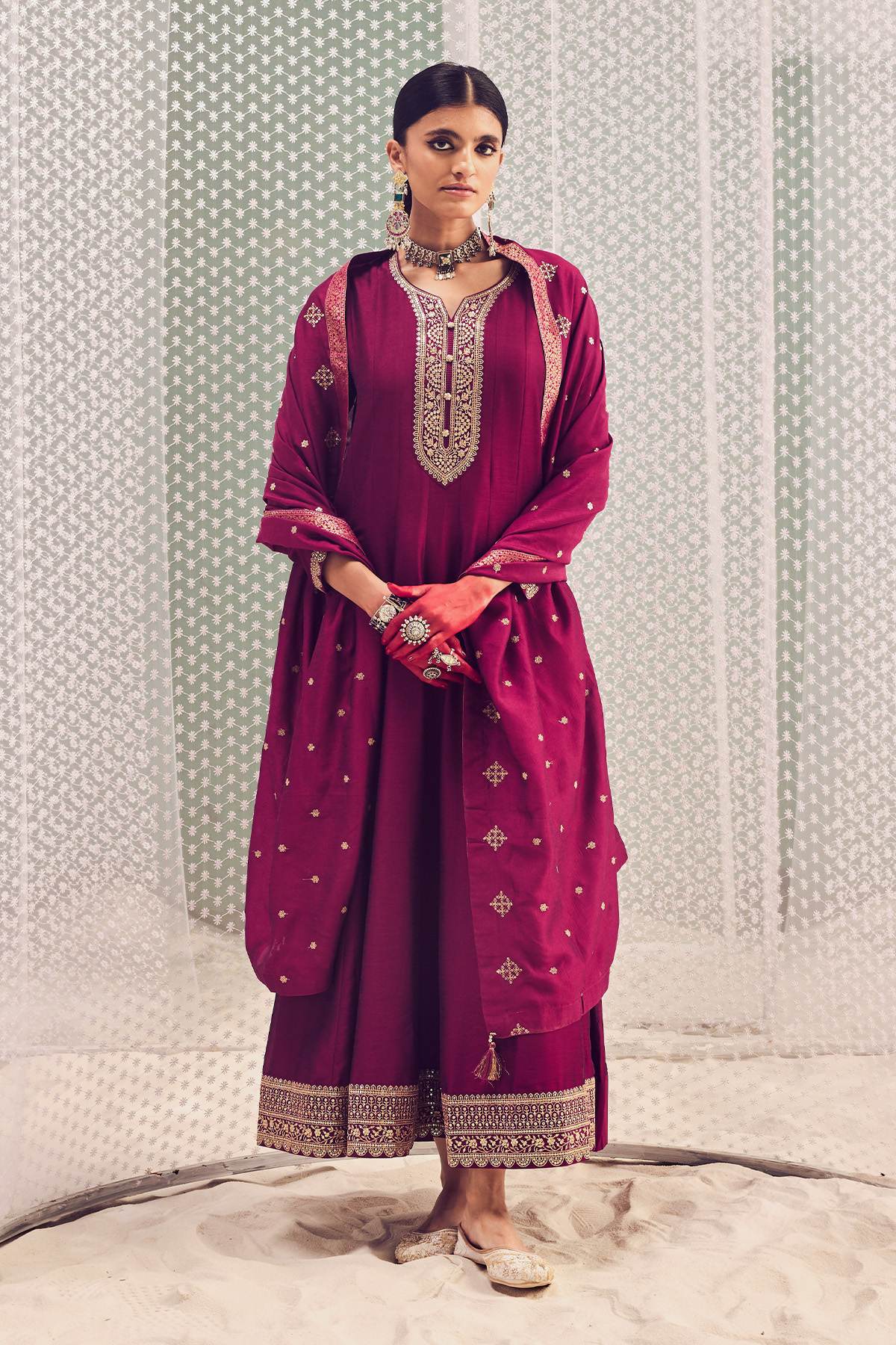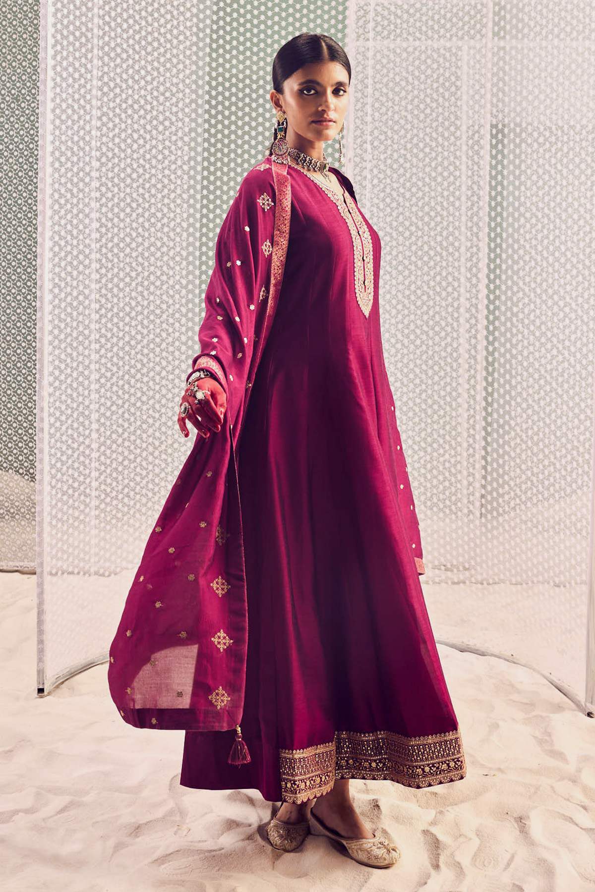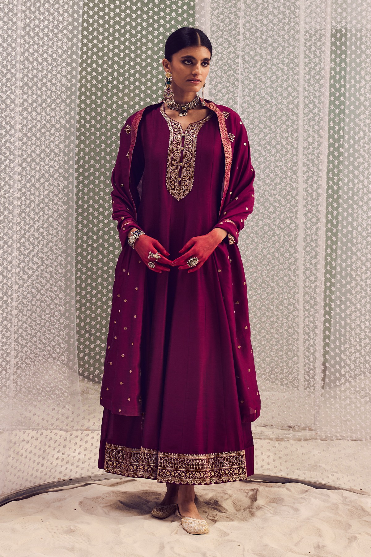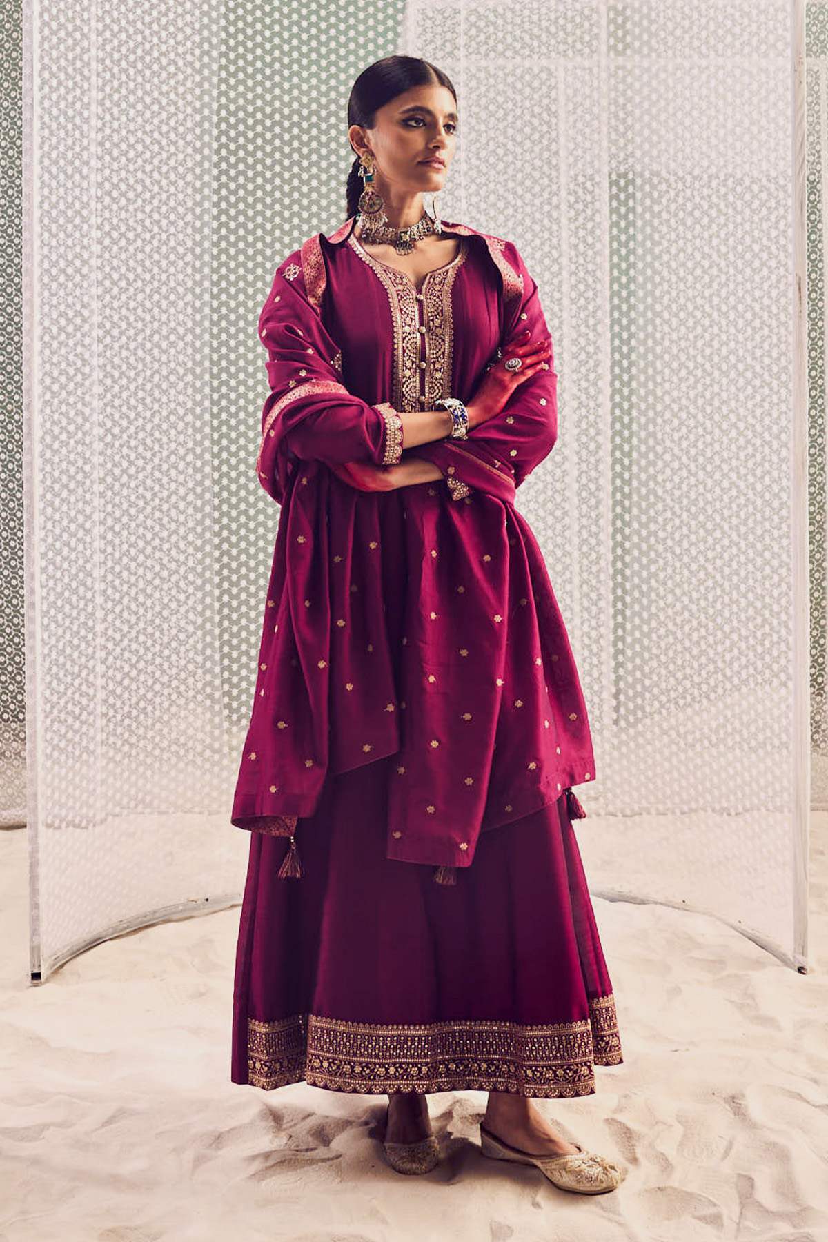 Introducing our stunning wine yoke zari embroidered solid flared dress with dupatta set. this exquisite ensemble features a portrait neckline, long sleeves, and a flared hemline that reaches ankle length. crafted from luxurious banglori silk, it offers both elegance and comfort for any special occasion.