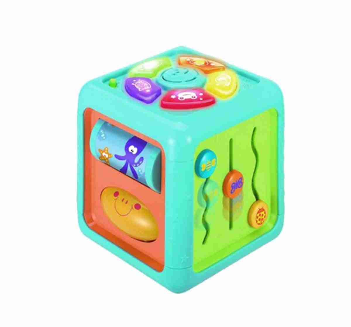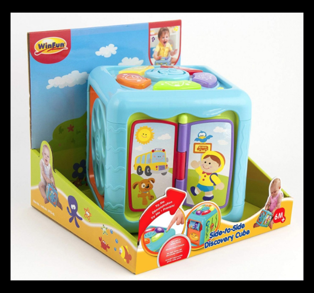 Side to side discovery cube. Five light-up animal buttons with sounds and melodies. Two moving page book has sounds and melodies. Five sides of sounds, motion and lights makes this side-to-side discovery cube a truly entertaining and educational partner. Five sided activity cube with melodies encourages basic development skills. For ages six months and up. Includes: -3AA batteries included. Colorful dial wheel and wiggly sliding insect buttons.