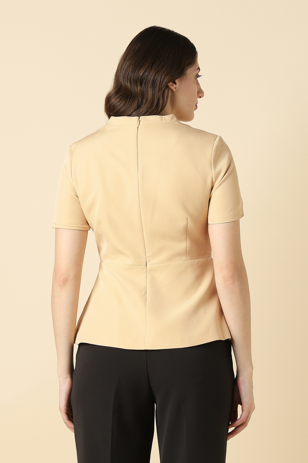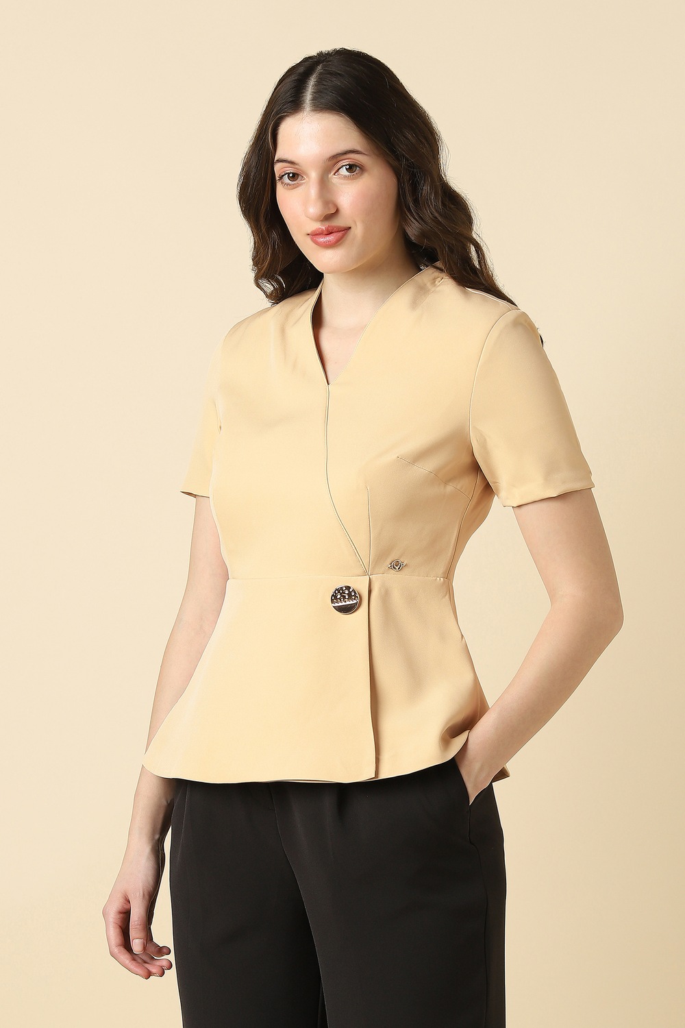 Elevate your formal wardrobe with this Allen Solly women's top, crafted from a luxurious blend of polyester and spandex. The solid beige color and flattering V-neck design exude sophistication, making it perfect for office wear or elegant occasions. Its comfortable fit ensures you look polished while feeling at ease. Experience a blend of style and comfort that complements your professional attire seamlessly.