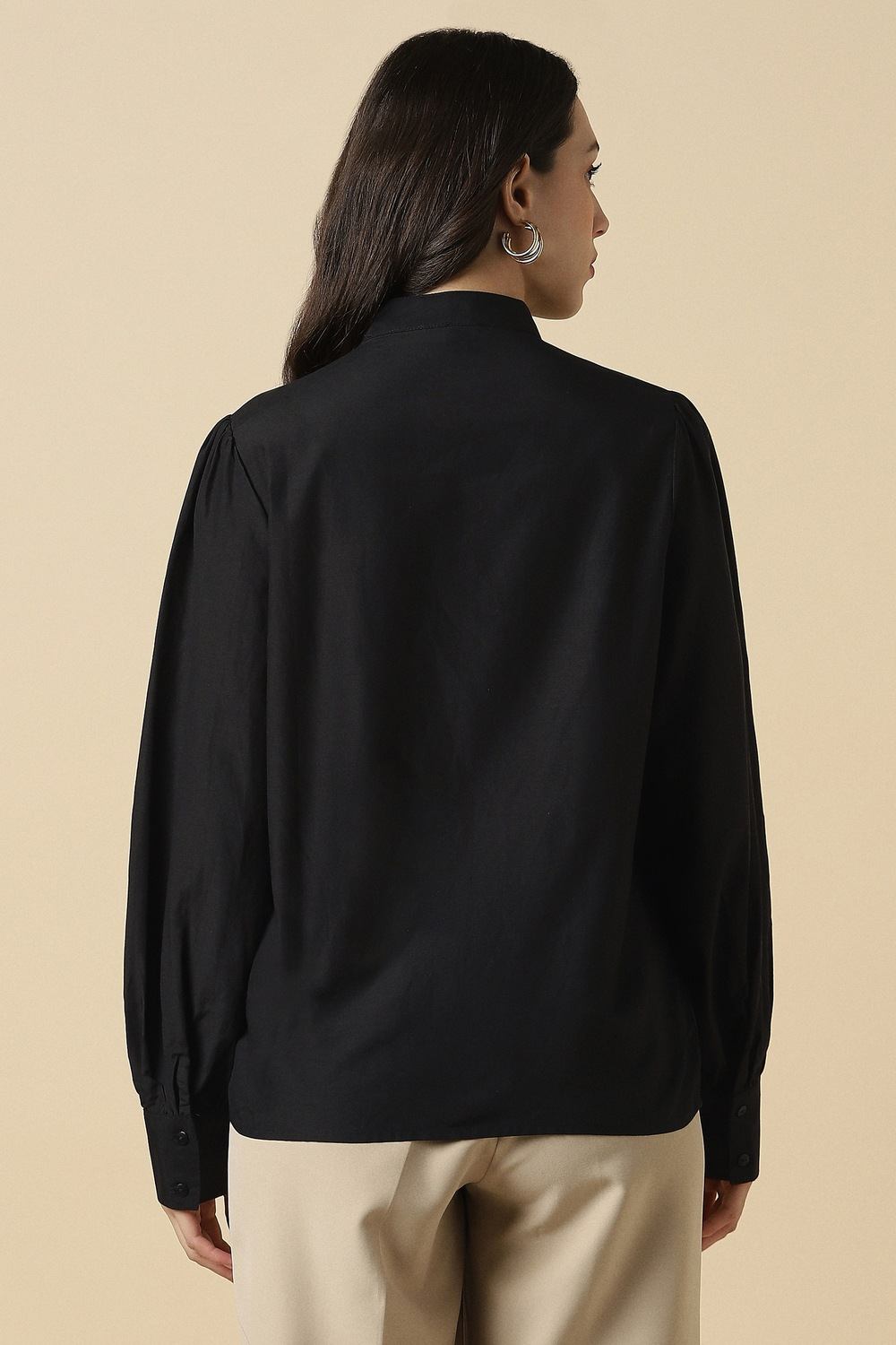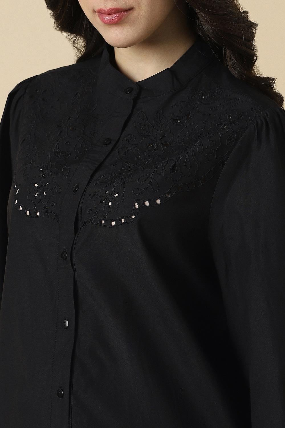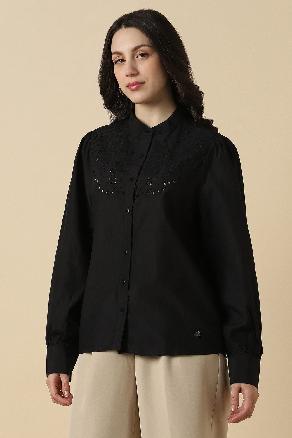 Elevate your formal wardrobe with the Allen Solly women's shirt in classic black, beautifully adorned with intricate embroidery. Crafted from a luxurious blend of viscose and nylon, it promises comfort without compromising on style. The detailed pattern adds a sophisticated touch, making it perfect for professional settings or elegant events. Experience timeless elegance that stands out effortlessly. Embrace this unique piece and redefine your formal attire.