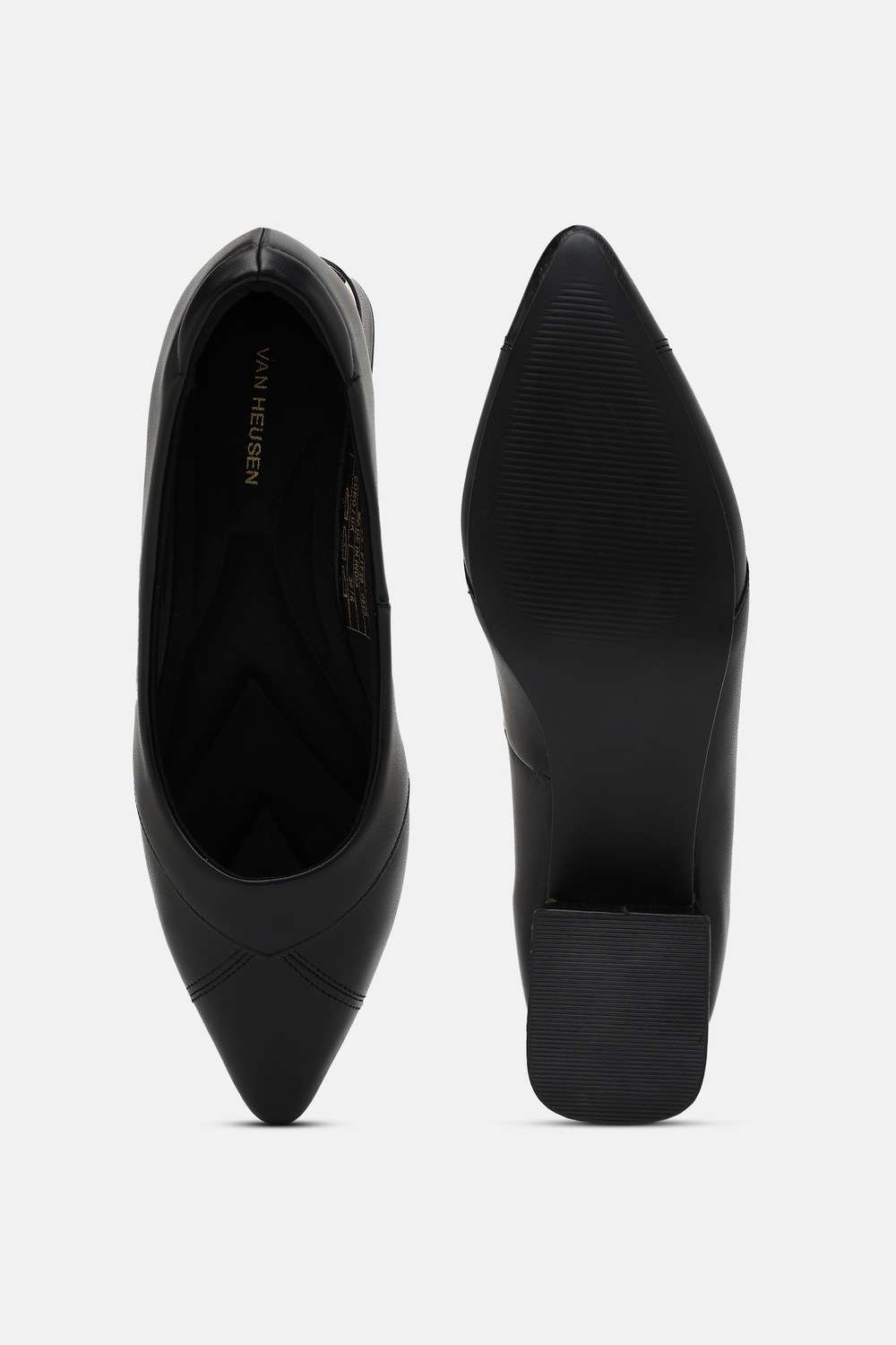 Step into elegance with these Van Heusen women's heels in a timeless black solid design. Crafted from premium vegan leather, they ensure a sophisticated look for formal occasions. The durable EVA sole provides lightweight comfort, allowing for easy movement as you make a statement. These heels are an essential addition to your wardrobe, seamlessly blending style with eco-friendly materials. Elevate your ensemble today with this chic footwear.