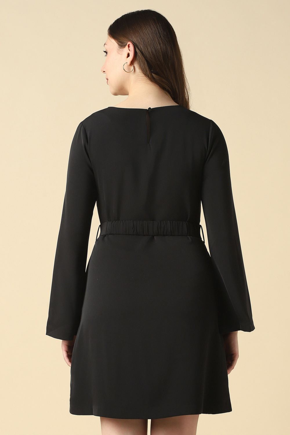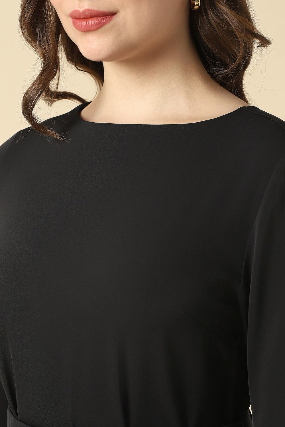 Embody sophistication with this chic black dress from Allen Solly. Crafted from an exquisite blend of cotton and elastane, it guarantees unmatched comfort for casual outings. The elegant boat neckline adds a touch of refinement, ensuring you make a style statement effortlessly. Perfect for day-to-night transitions, this solid-patterned piece effortlessly pairs with your favorite accessories. Elevate your everyday ensembles with a timeless silhouette that complements your modern lifestyle.