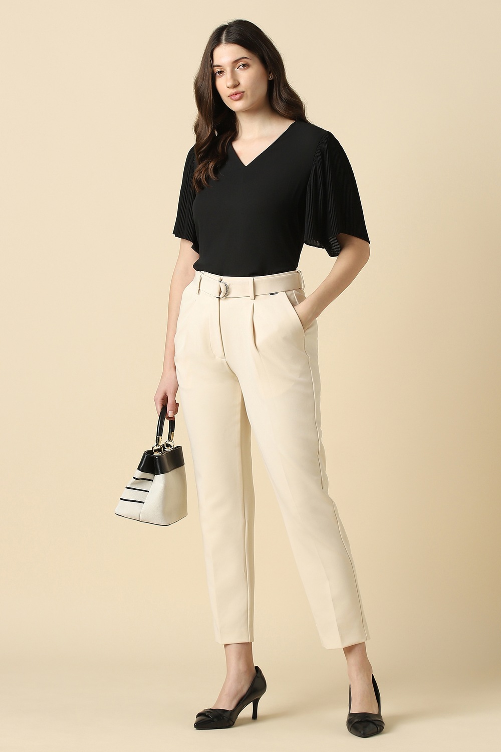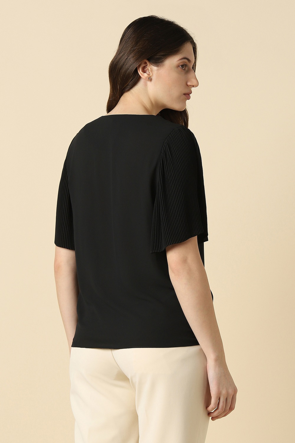 Elevate your formal wardrobe with this sophisticated black top from Allen Solly. Crafted from premium polyester, this solid V-neck design offers a polished look while ensuring all-day comfort. Its versatile style seamlessly transitions from office meetings to evening events, making it a must-have piece. Experience the perfect blend of elegance and functionality, ideal for any professional setting. Embrace timeless style that reflects your confidence.