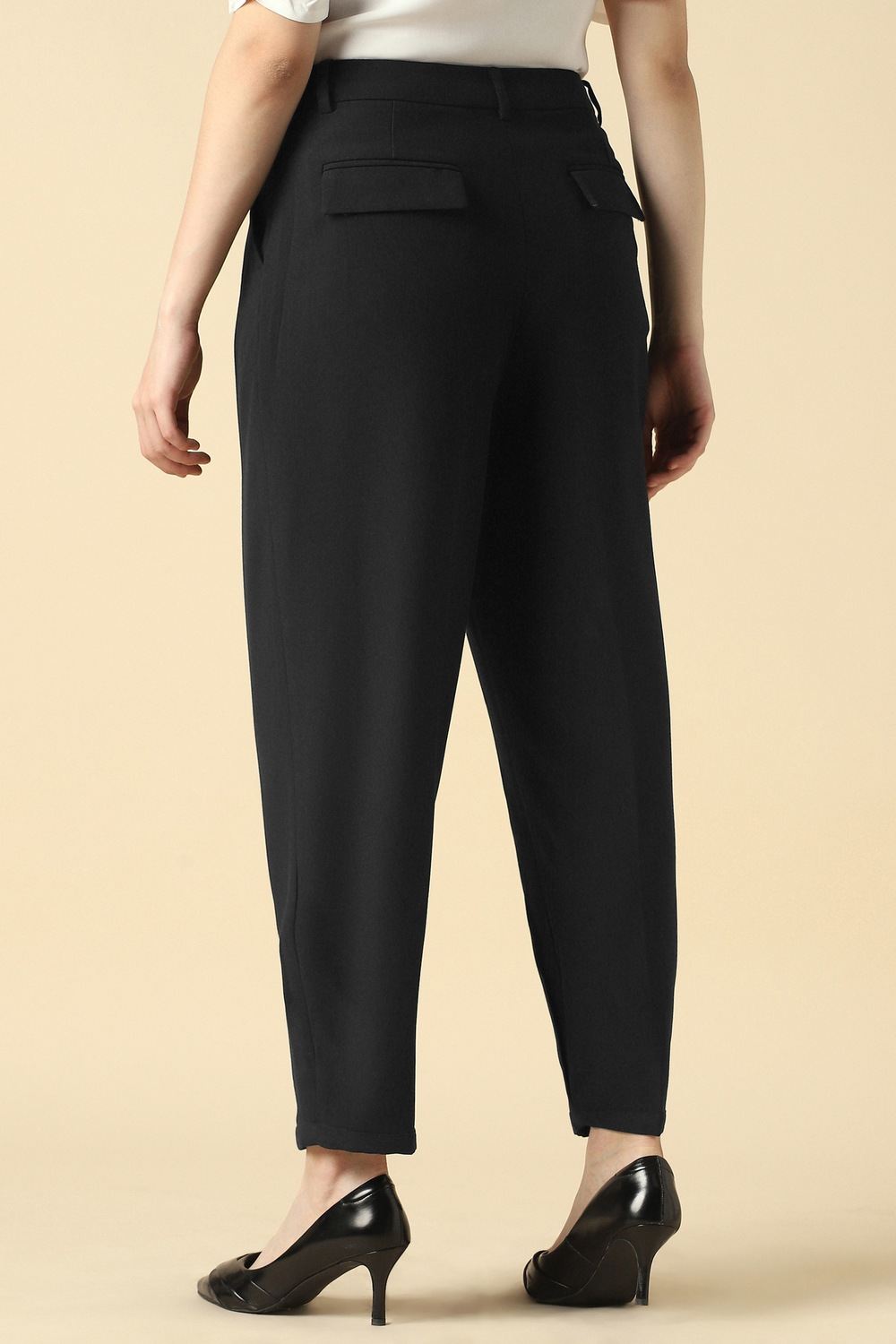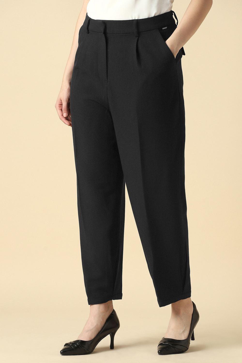 Elevate your work week with these exquisite black trousers from Allen Solly, tailored for the modern woman. The solid design offers a polished aesthetic suitable for formal occasions, while the cotton fabric delivers breathability and ease. Effortlessly transition from boardroom meetings to evening engagements, maintaining poise and sophistication. Designed for versatility, these trousers are a refined addition to your wardrobe, ensuring you always look effortlessly chic and confident.