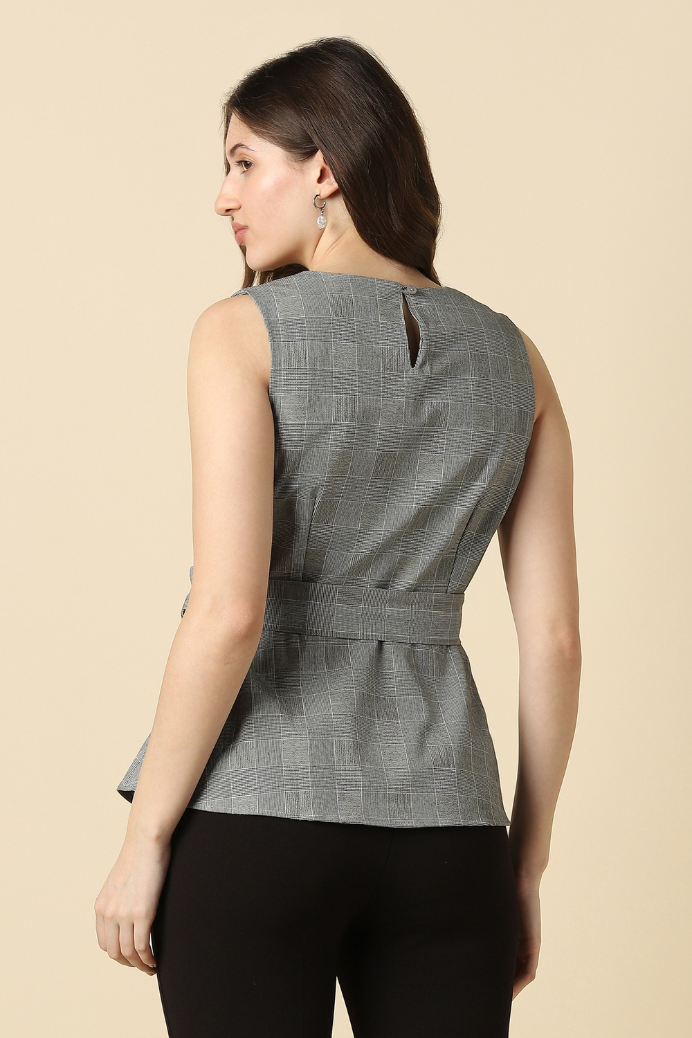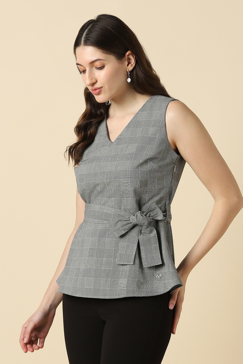Elevate your formal wardrobe with this Allen Solly women's top in a sophisticated grey check pattern. Designed with a stylish V-neckline, it's crafted from a blend of polyester, viscose, and spandex for a comfortable, flattering fit. Perfect for professional settings, this top seamlessly combines elegance and functionality, making it a versatile addition to your collection. Explore the unique charm and sophistication that this piece brings to your attire.