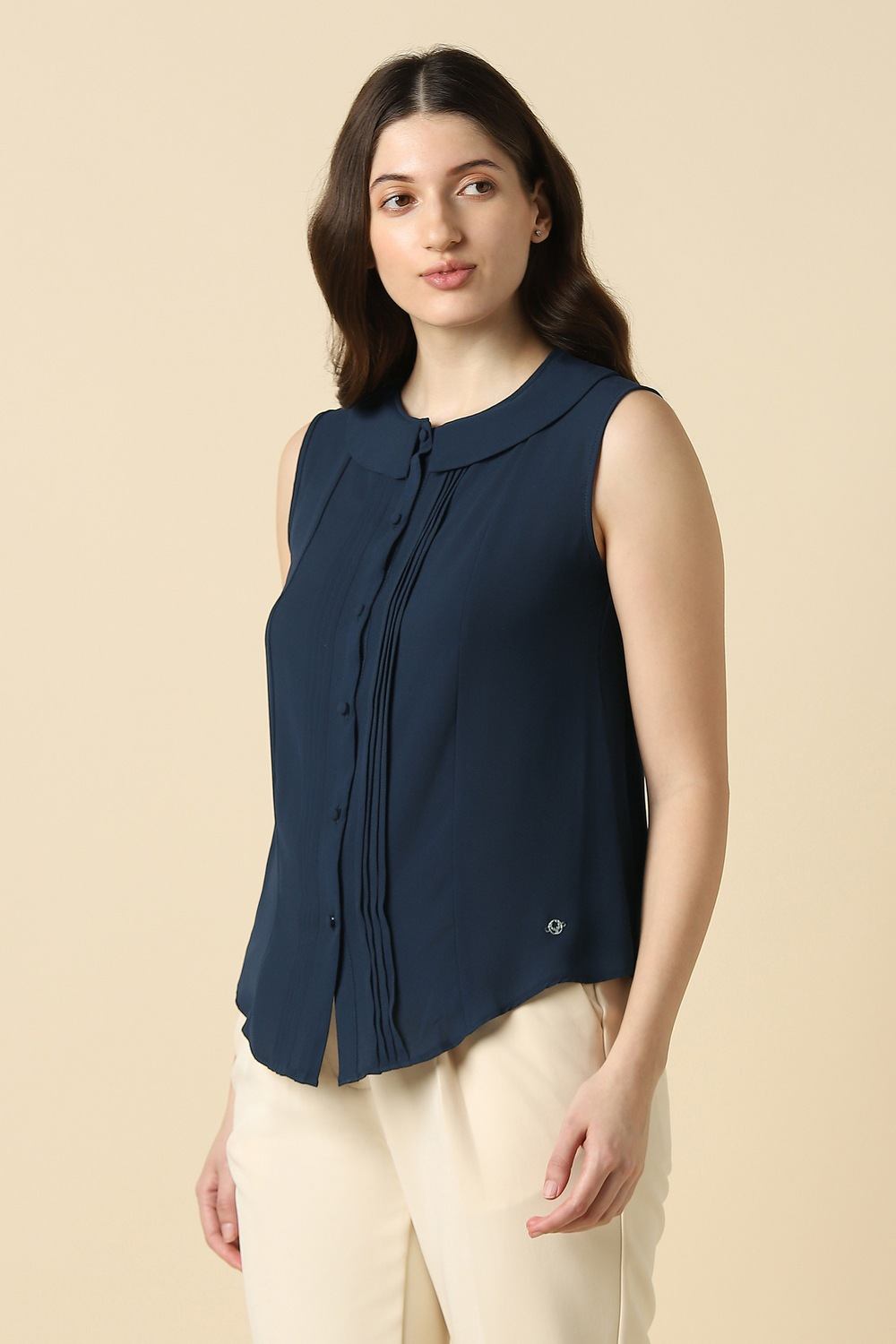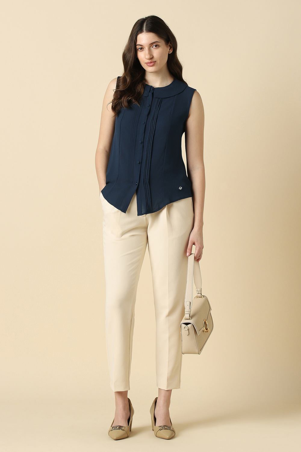 This Allen Solly women's top in navy features a refined stylized neckline that enhances its elegant appeal. Crafted from high-quality polyester, it ensures a comfortable fit perfect for formal occasions. The solid pattern adds to its versatility, making it an essential piece for your sophisticated wardrobe. Embrace timeless elegance with this top, ideal for those who appreciate both style and comfort. Transform your look effortlessly and enjoy the compliments that follow.