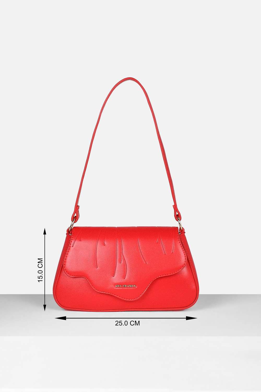 Experience effortless style with the Van Heusen women`s sling bag in a striking red hue. Crafted from sustainable vegan leather, this solid-patterned accessory adds a pop of color to any casual outfit. Its sleek design combines elegance with functionality, making it perfect for daily errands or casual outings. Elevate your accessory collection with this chic piece that effortlessly complements your personal style.