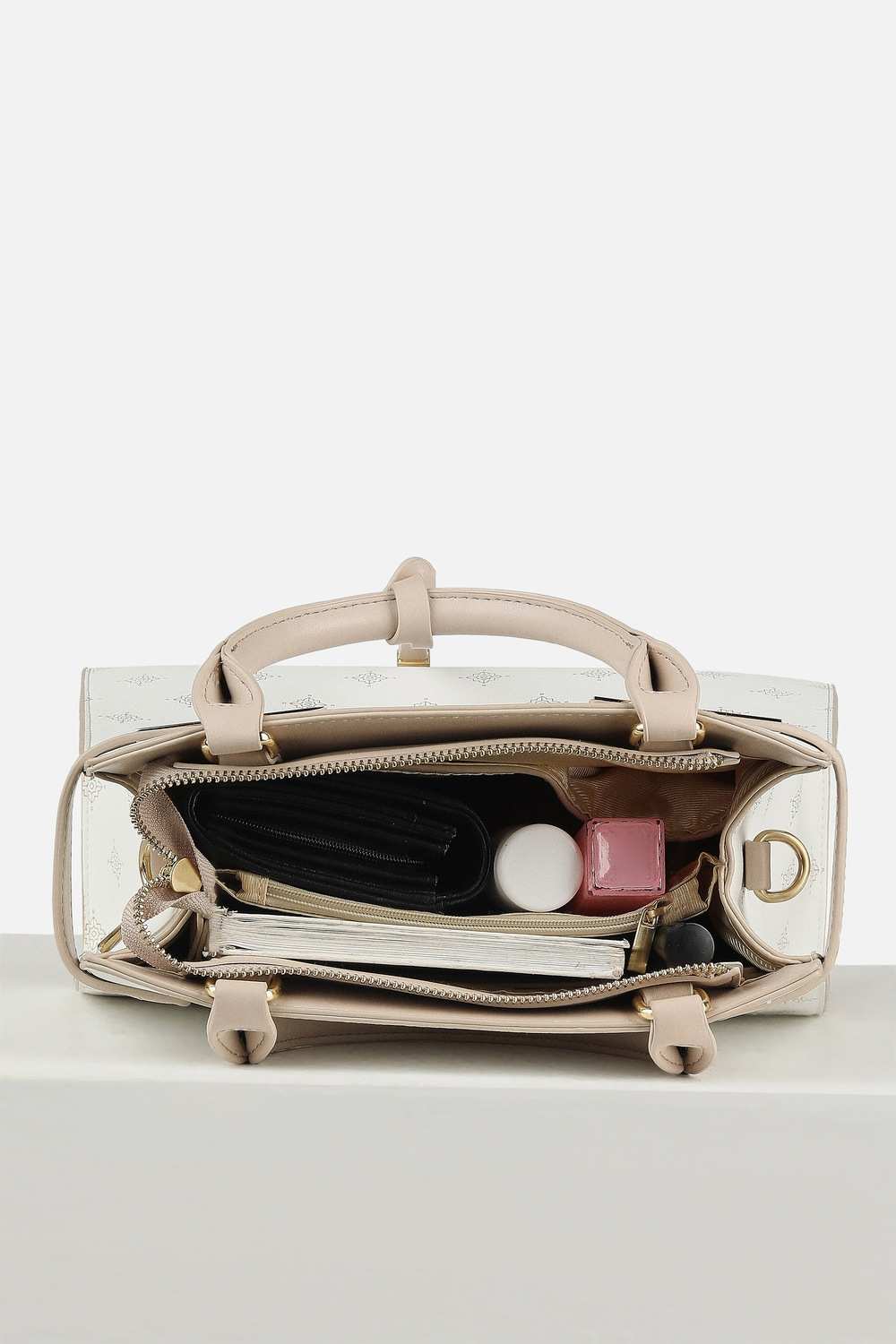 Elevate your casual style with the Van Heusen women`s handbag, designed in a chic white shade featuring a playful print. Crafted from durable polyester, this handbag effortlessly combines functionality with fashion. Its spacious interior allows for easy organization, making it perfect for daily outings or weekend adventures. Add a touch of sophistication to your look and embrace practicality without compromising on style.