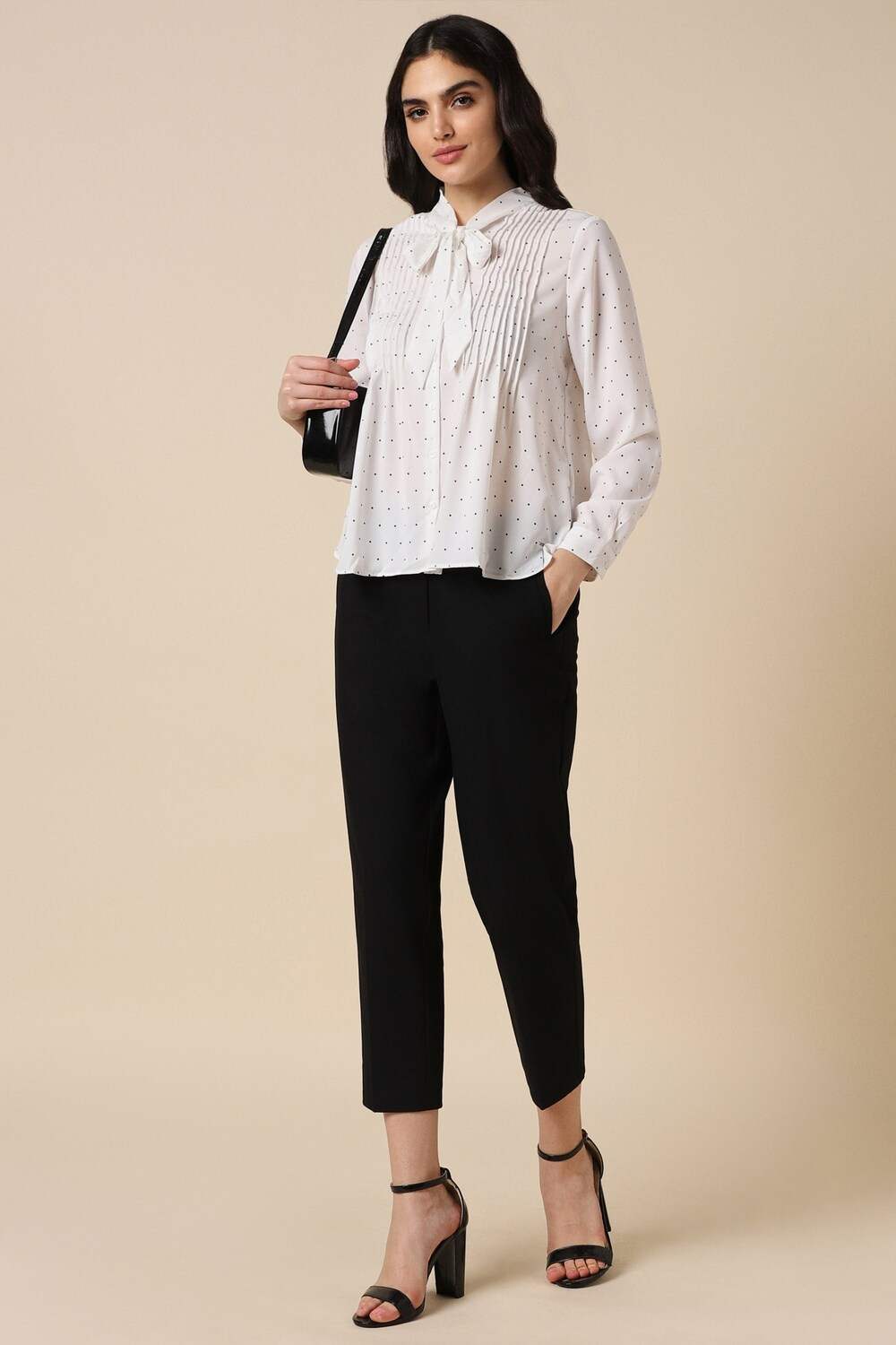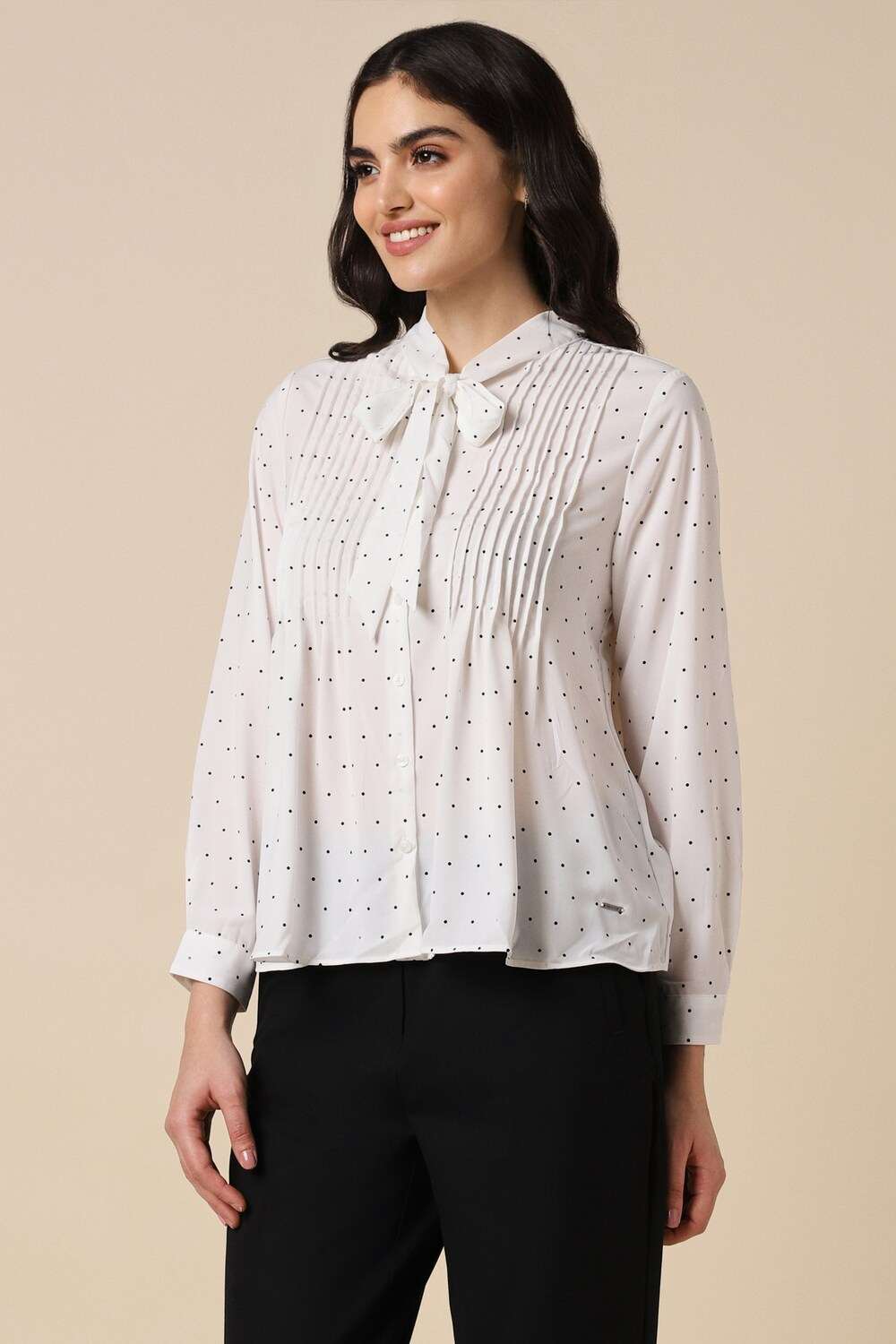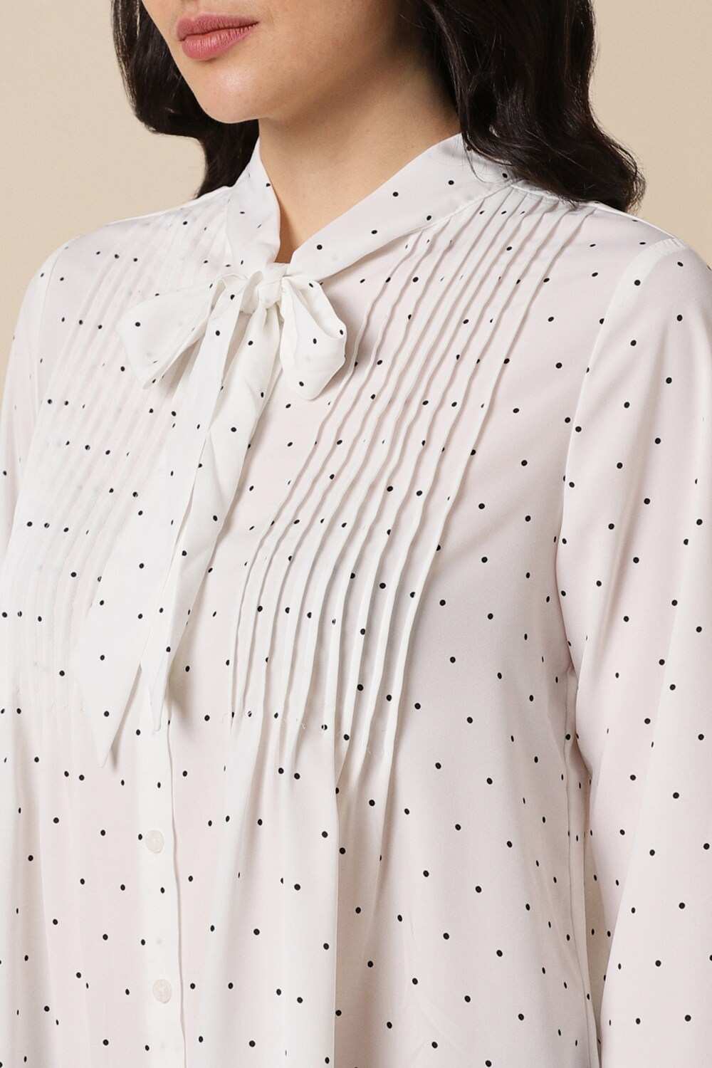 This Allen Solly women`s shirt combines elegance and sophistication for formal occasions. Crafted from high-quality polyester, it features a chic white base adorned with subtle dot patterns. The regular fit and long sleeves ensure comfort without compromising style, making it a versatile choice for office wear or special events. Elevate your wardrobe with this timeless piece that balances professionalism with modern flair.