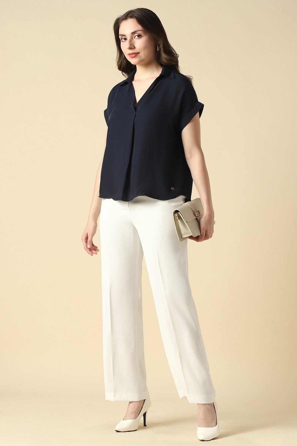 Transform your formal attire with these impeccably designed trousers by Allen Solly, featuring a timeless solid white color. Meticulously constructed from premium cotton, they offer an ideal blend of elegance and comfort, ensuring you always look poised for business meetings or special events. Their tailored fit enhances your silhouette while allowing effortless movement. Versatile and sophisticated, these trousers are a must-have addition to your wardrobe for a polished, contemporary appearance.