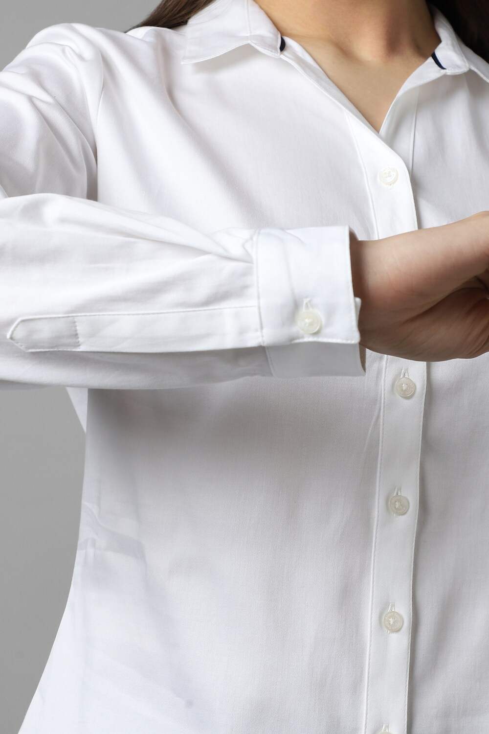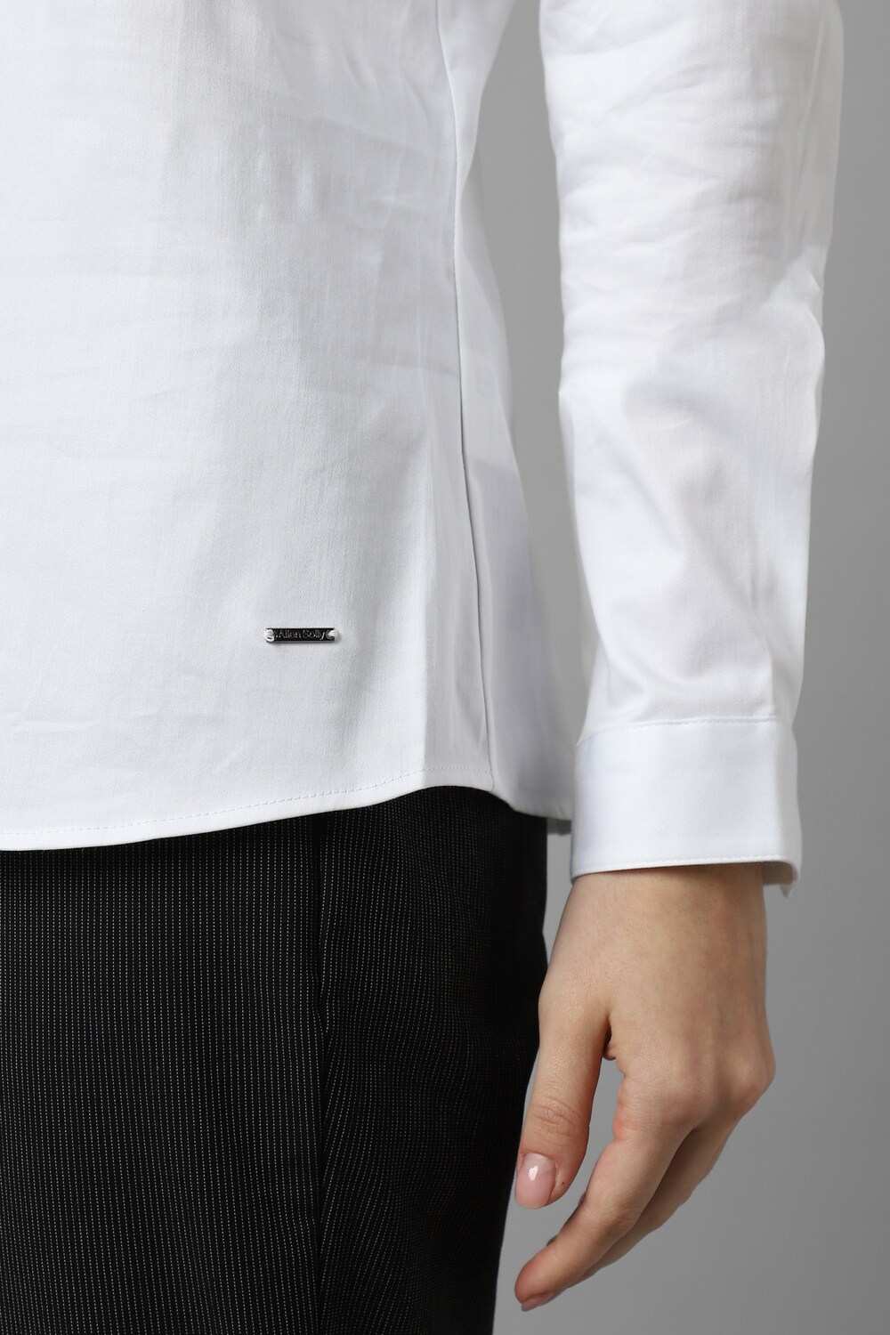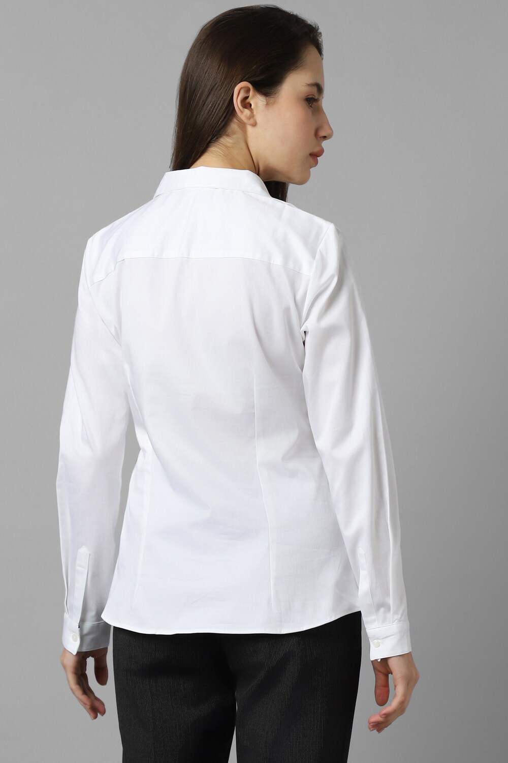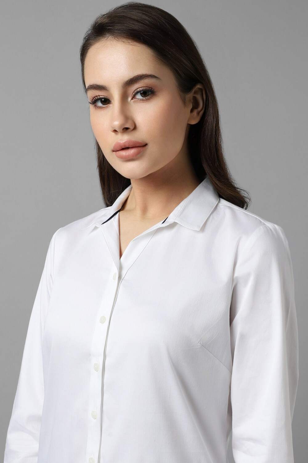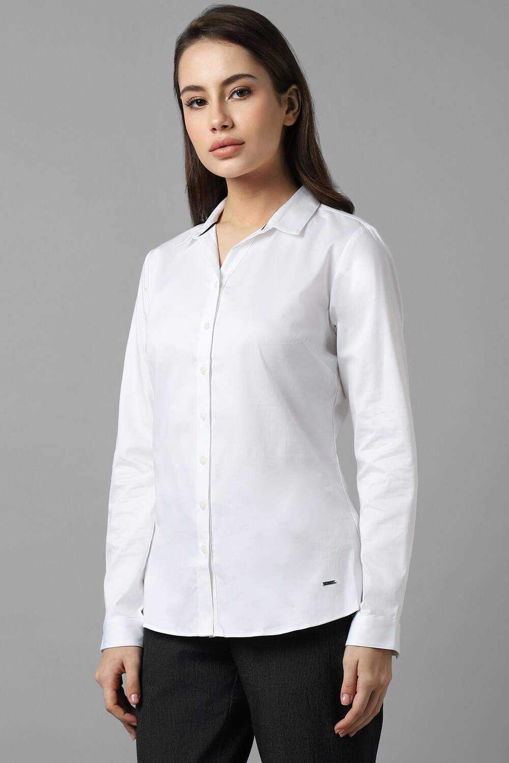 Elevate your formal wardrobe with this Allen Solly womens shirt, crafted from a soft cotton-spandex blend. Featuring a sleek, solid white design, it offers a regular fit with long sleeves for a polished appearance. Perfect for professional settings, this versatile shirt combines comfort and elegance, making it an essential staple for any sophisticated occasion. Experience the perfect harmony of style and comfort today.