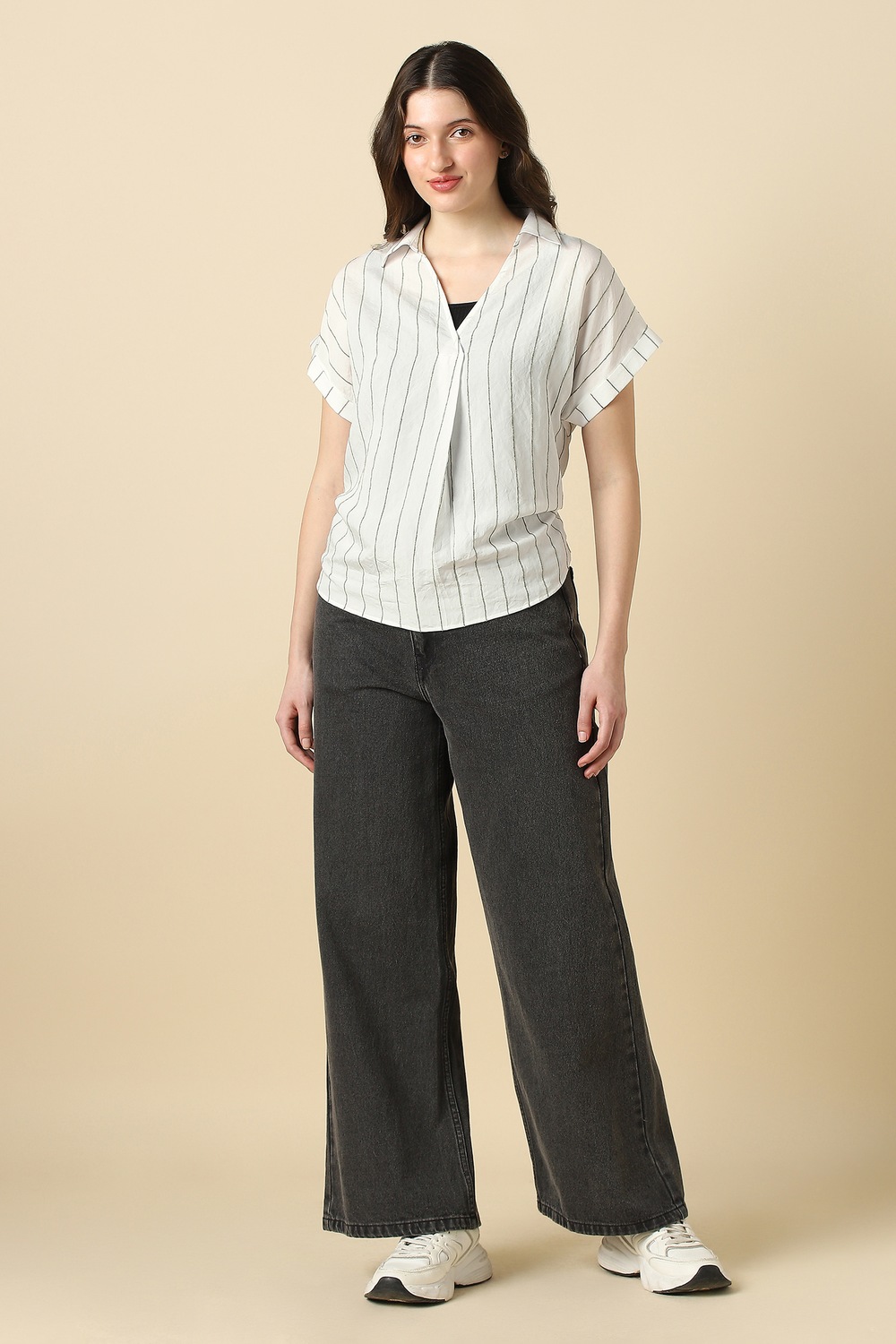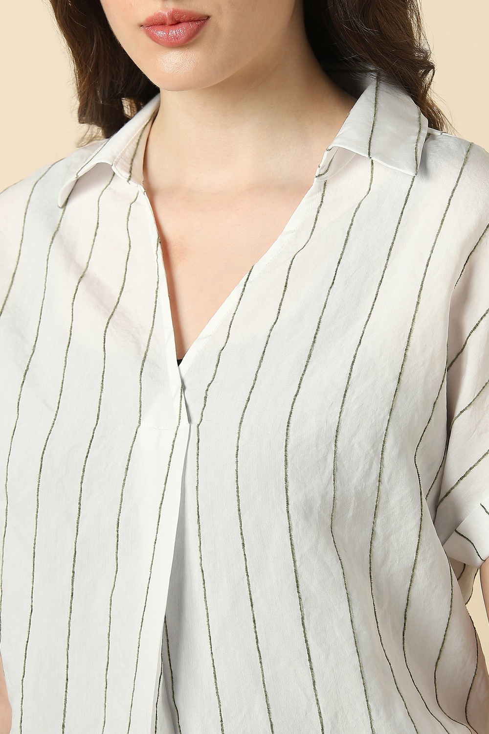 Elevate your casual wardrobe with this Allen Solly top in a fresh white hue. Featuring a stylized neckline and chic striped pattern, it fuses contemporary style with comfort. Crafted from a blend of modal and polyester, this top ensures breathability and a soft touch for all-day wear. Ideal for outings or relaxed gatherings, this piece effortlessly blends sophistication with casual flair, making it a must-have addition for fashion-forward women.