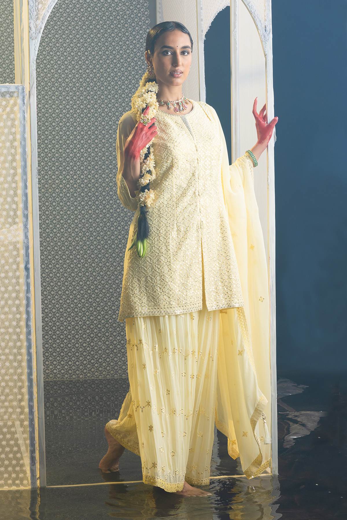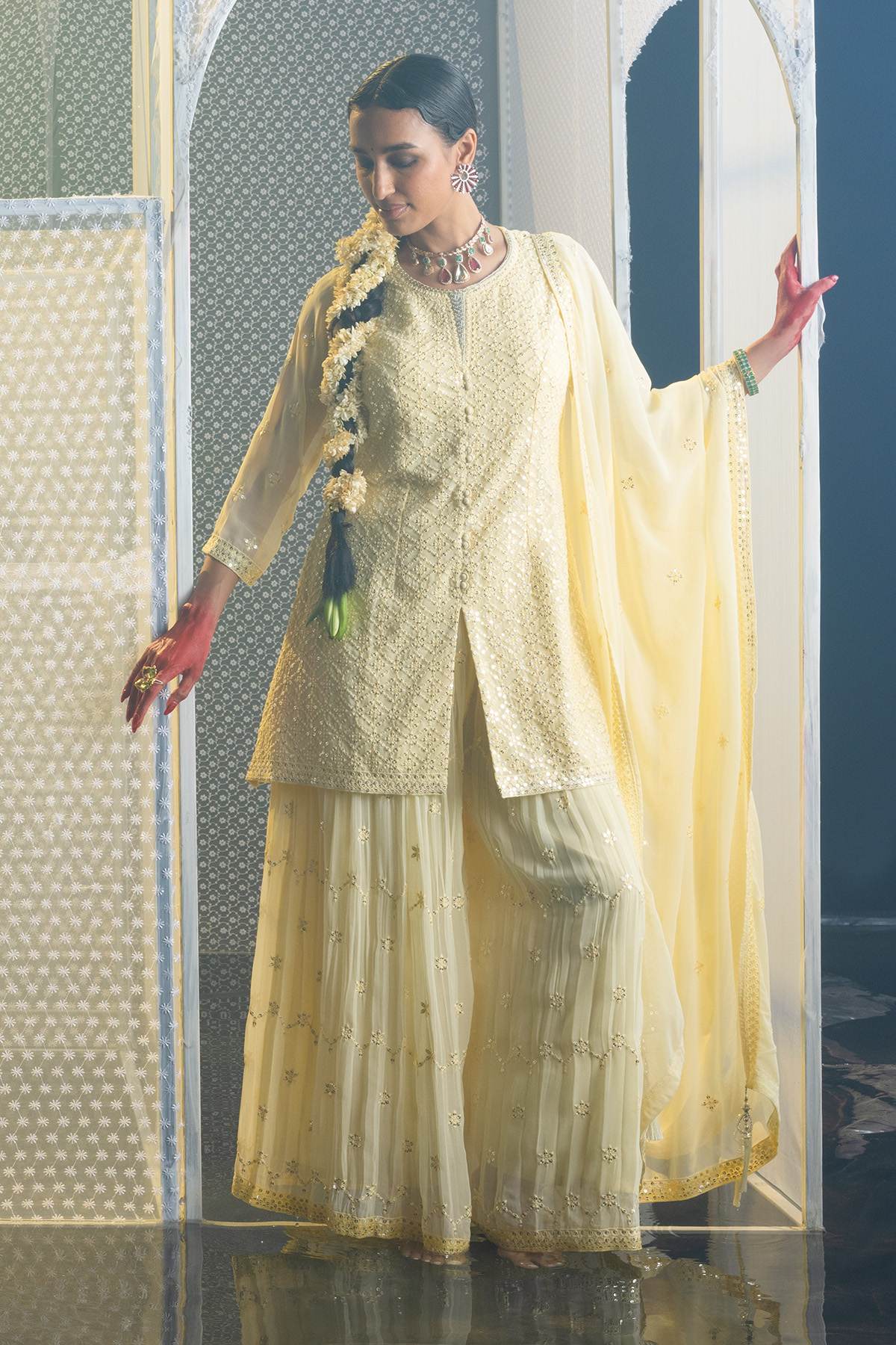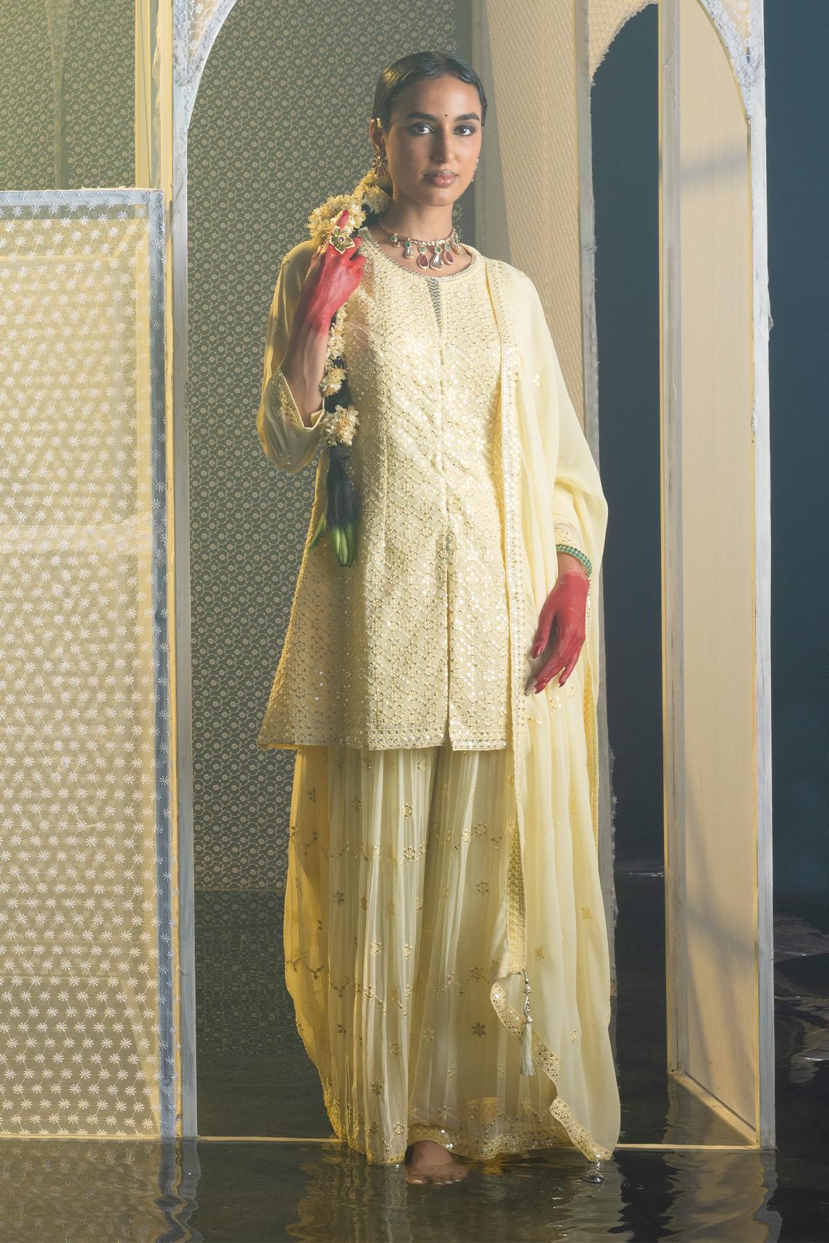 Yellow, this embellished embroidered kurta set is perfect for festivities. featuring a round neck, front slit, and three-quarter sleeves, it combines traditional charm with contemporary elegance, making it an ideal choice for celebratory occasions.