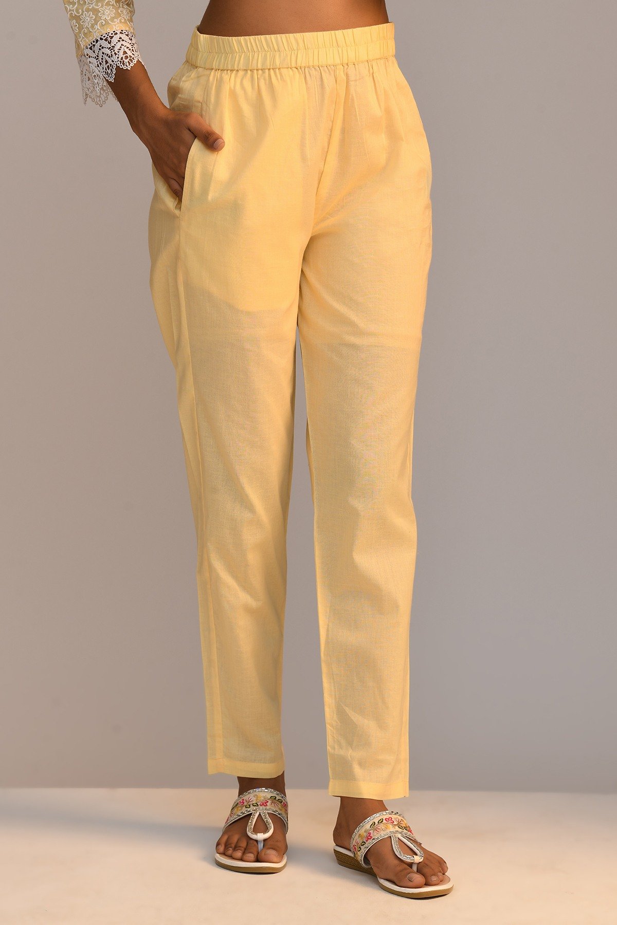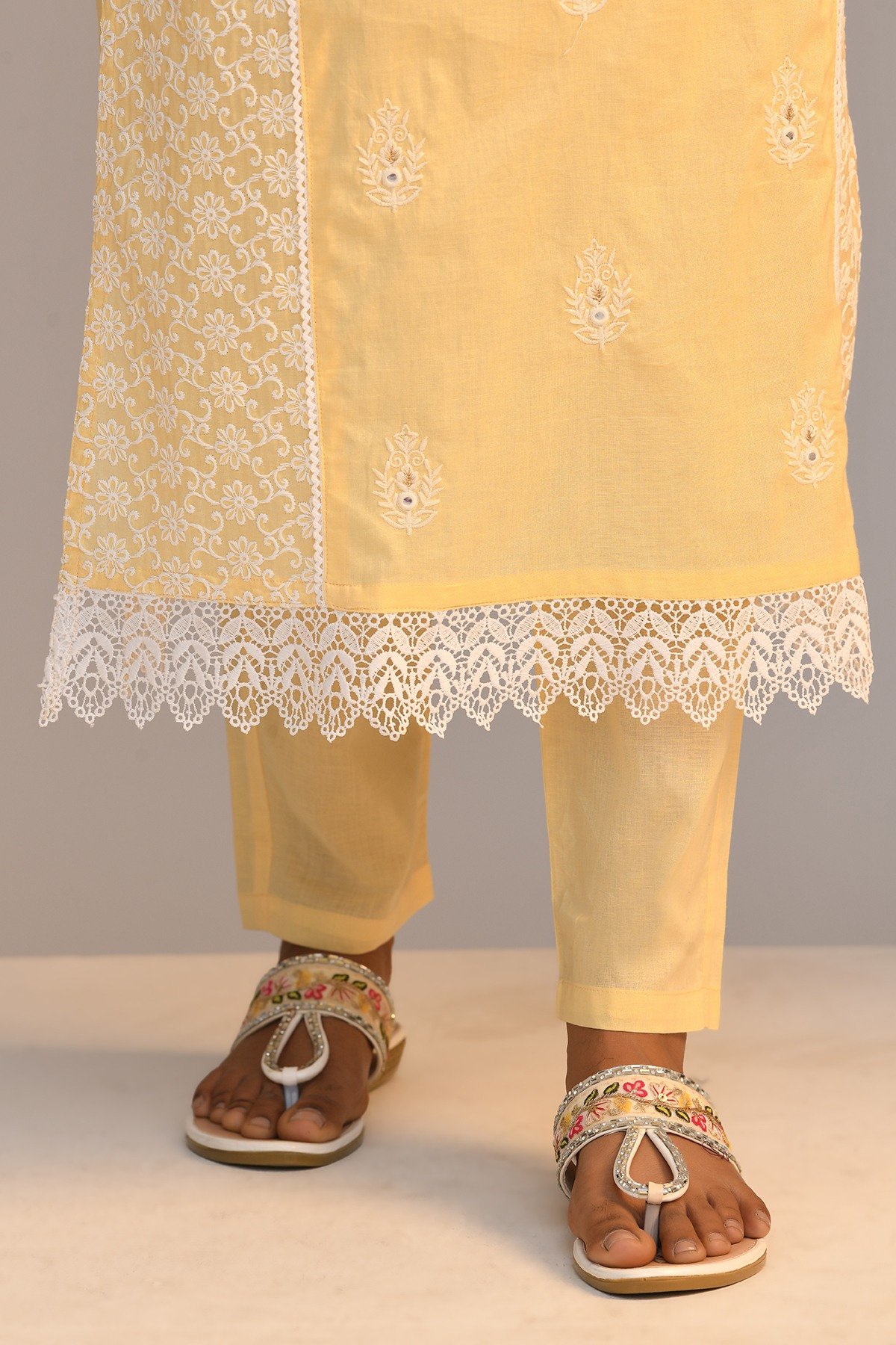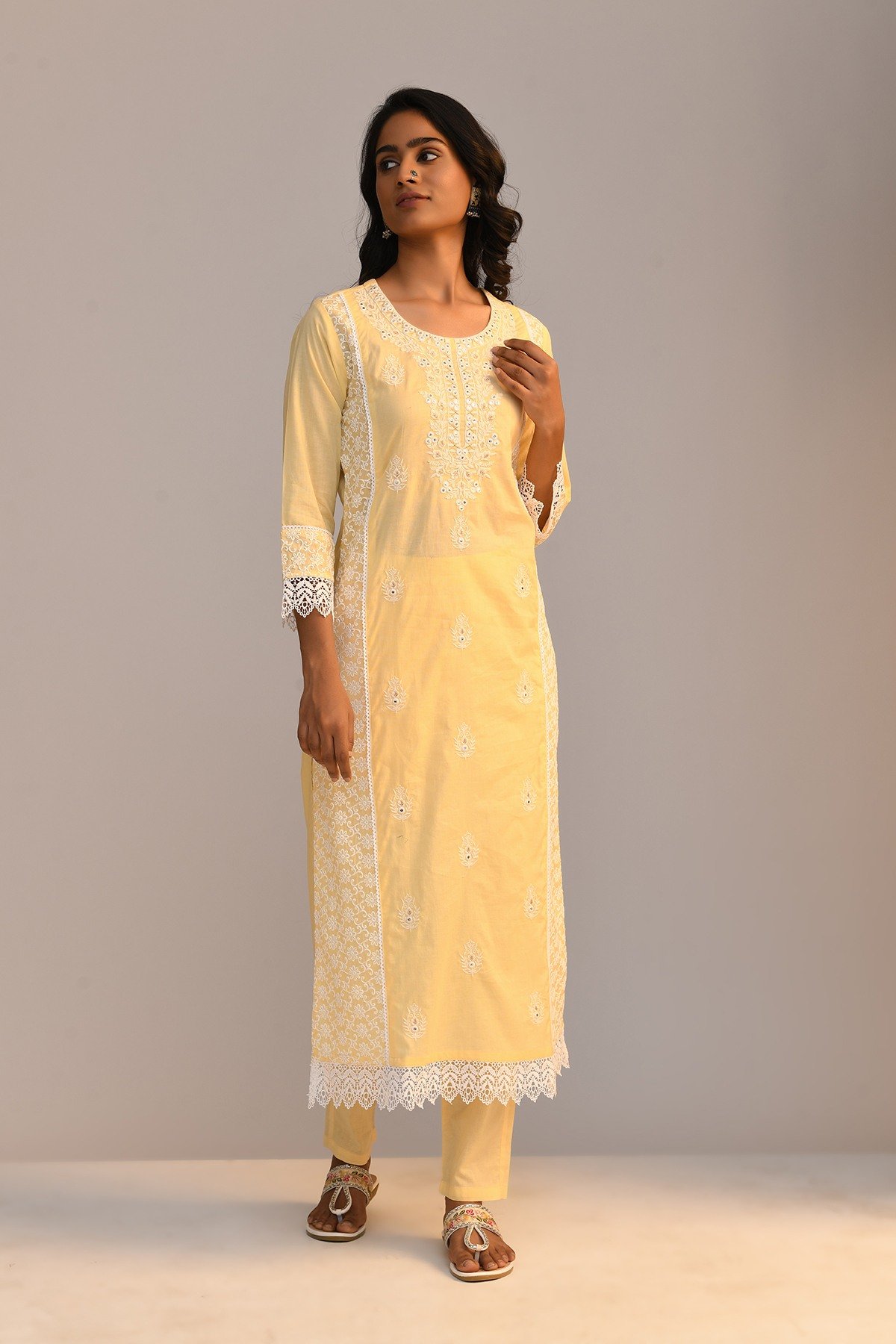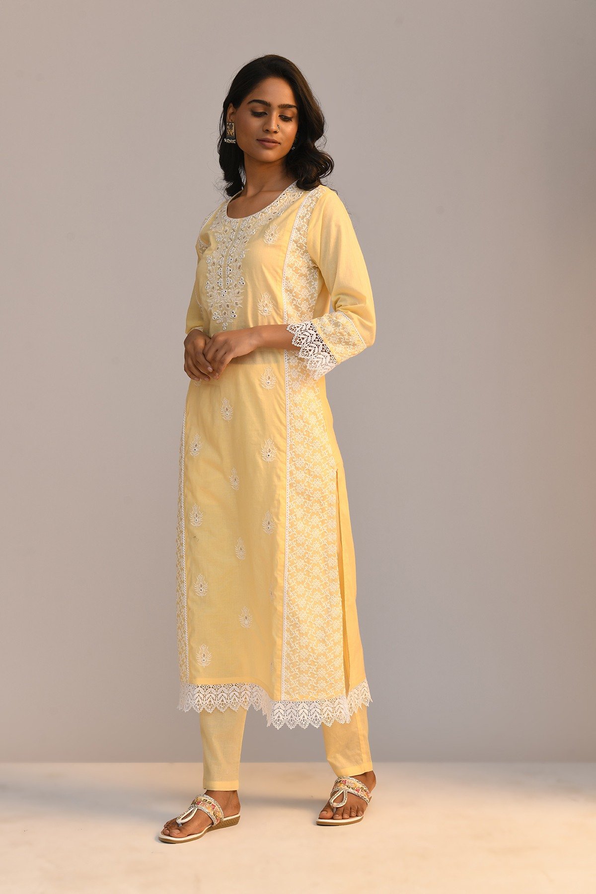 This outfit features a yellow embroidered with mirror work straight kurta with a round neck, three-quarter sleeves, and a straight hemline, with pant. the ensemble is a stylish and comfortable choice for various occasions, showcasing a coordinated and fashionable look.