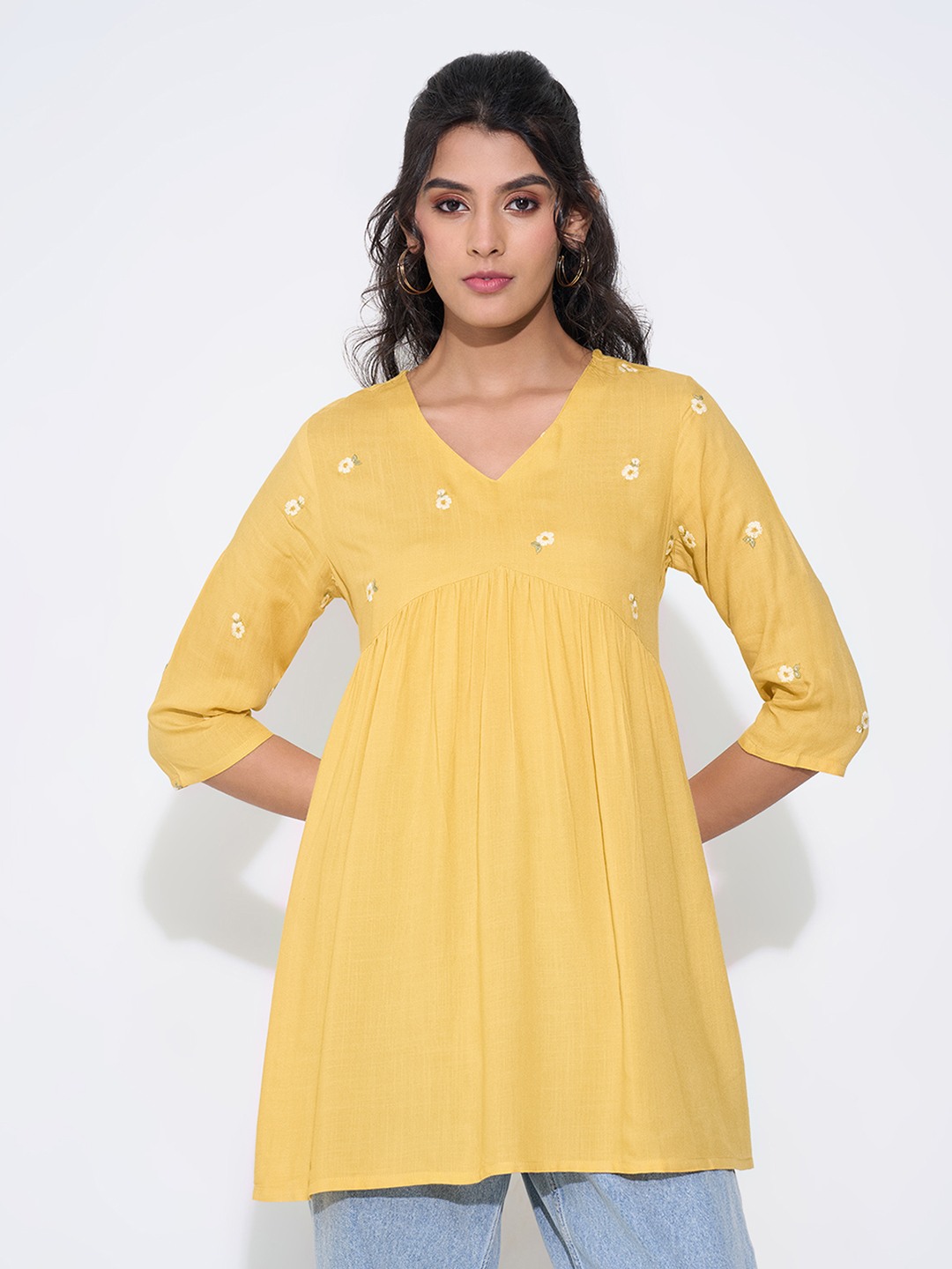 Sunlit and cheerful, this tunic glows in a warm yellow tone dotted with delicate embroidered florals. Cut with an empire-line silhouette, V-neckline, and 3/4 sleeves, it falls with gentle gathers for an easy drape. Its airy woven texture keeps it light and versatile through the day.
