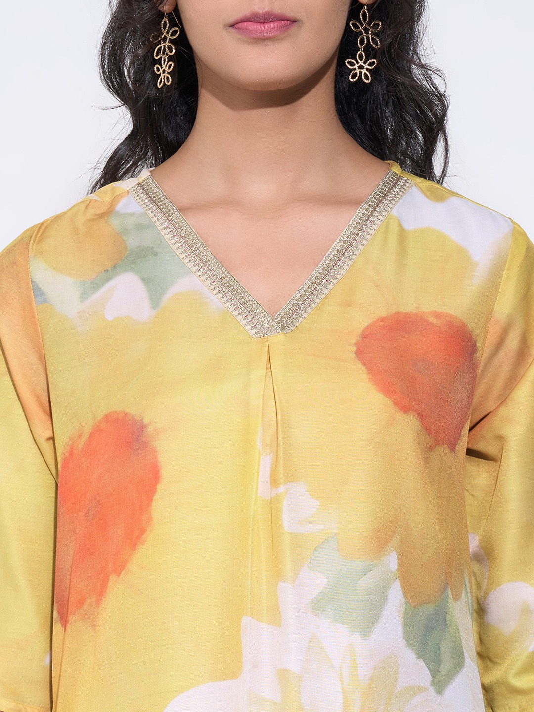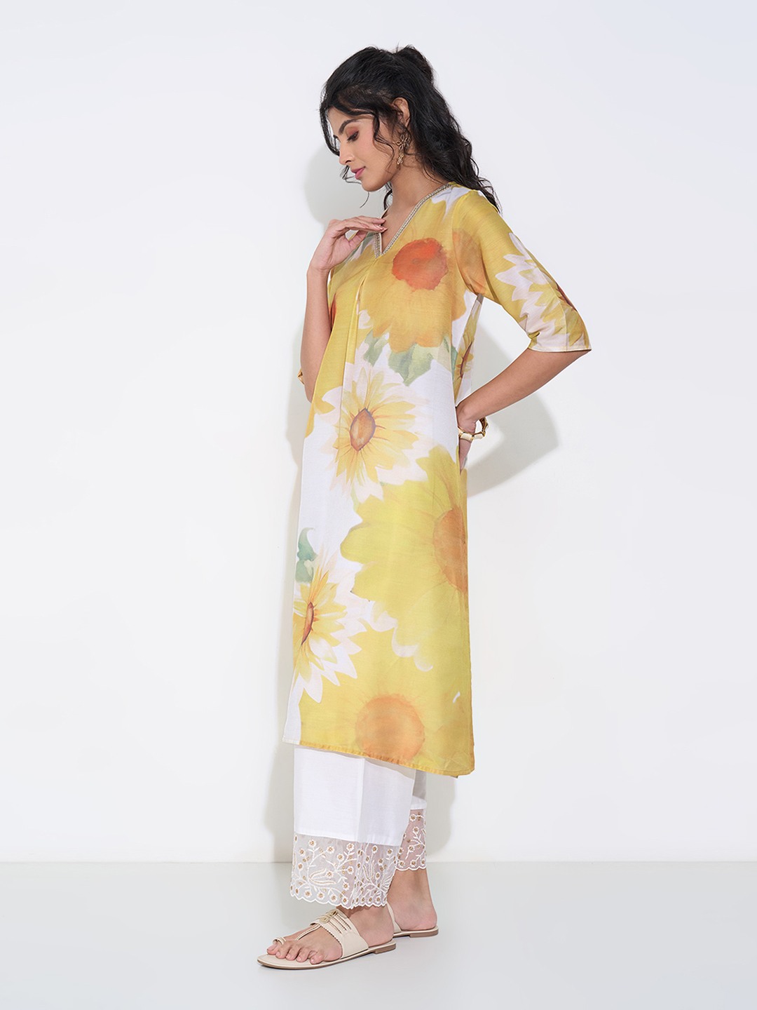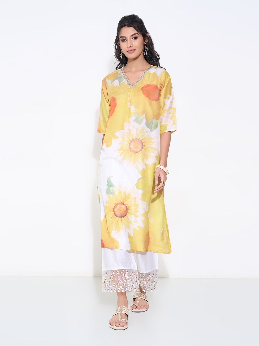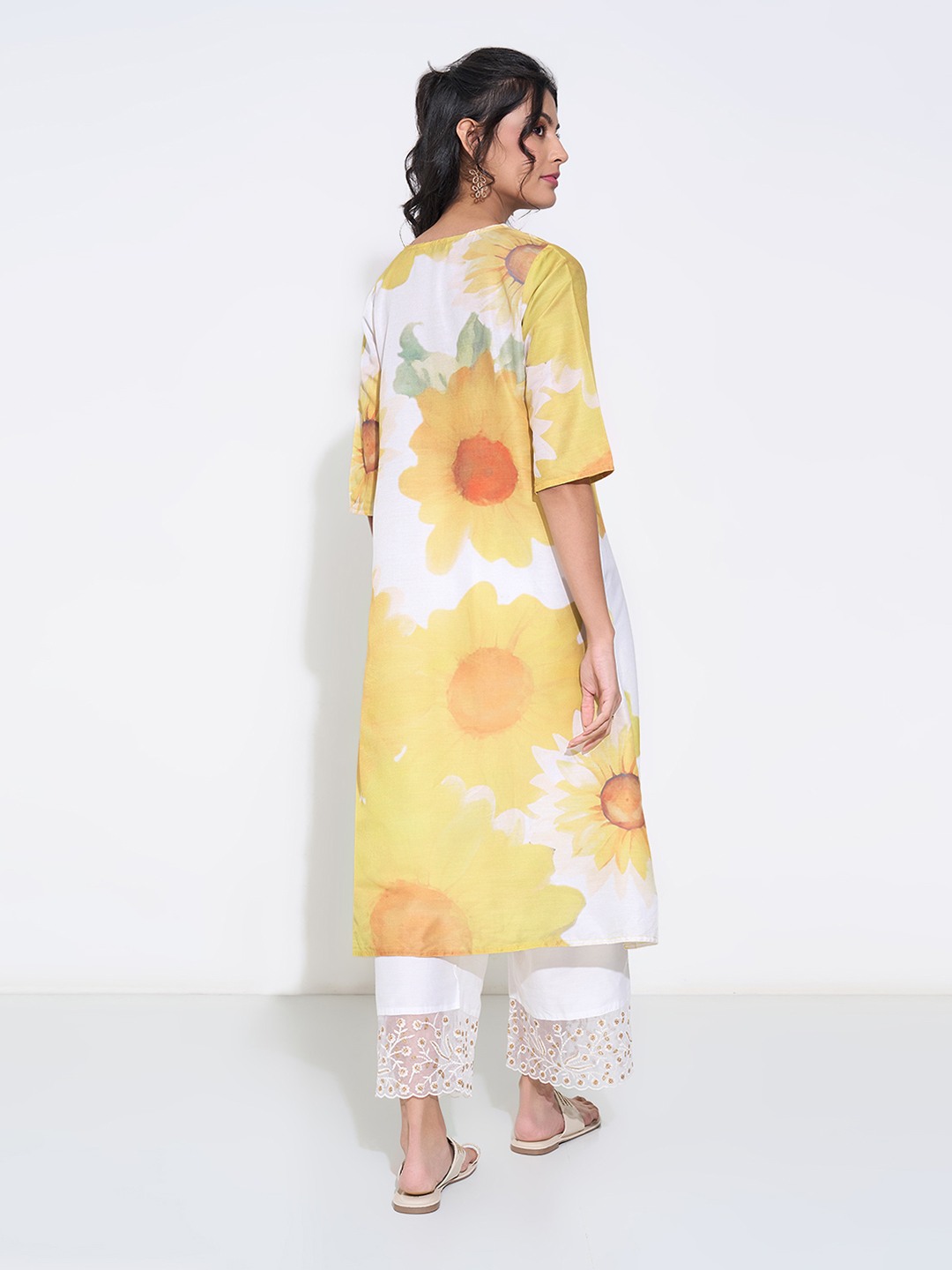 Hello sunshine—this kurta beams with oversized sunflower motifs. The modern silhouette is styled with an embroidered V-neckline, front pleat, and easy 3/4 sleeves. Its woven fabric adds a breezy touch to the bold print.