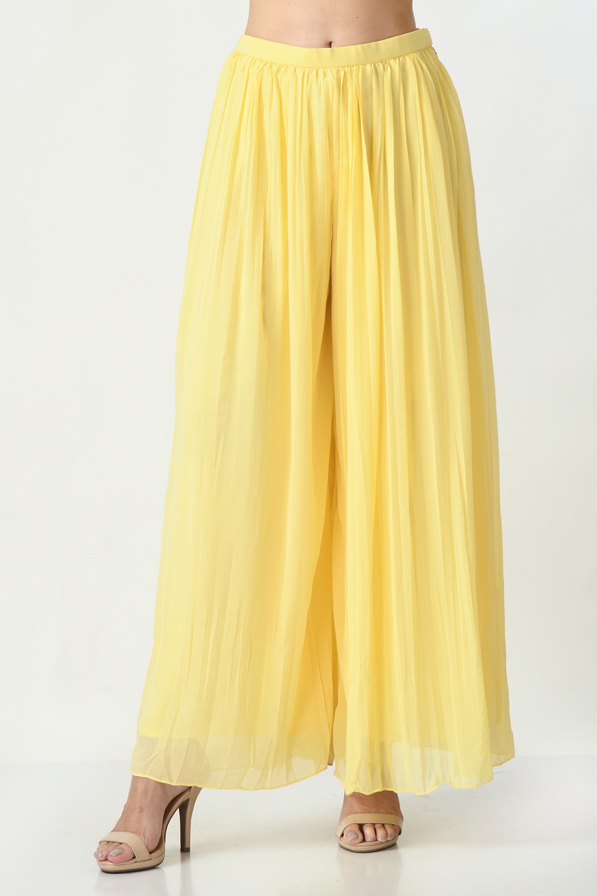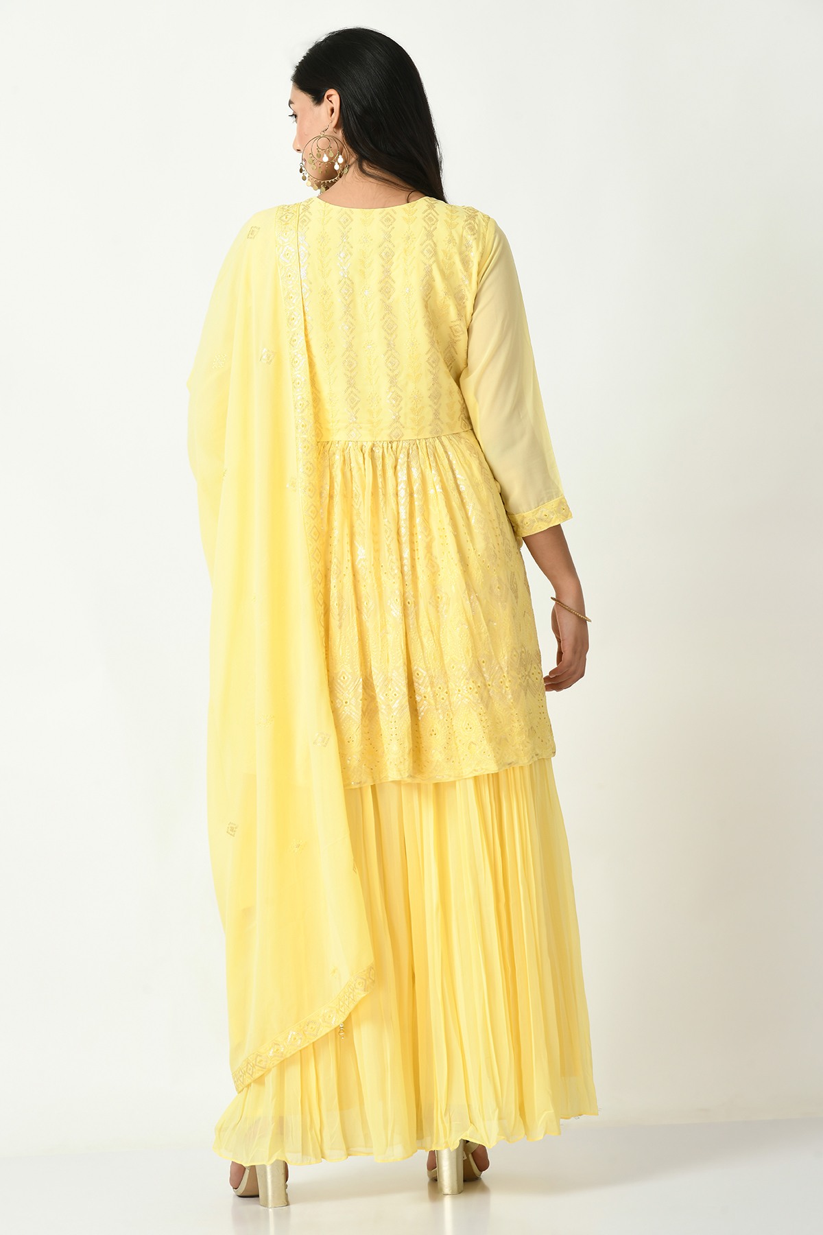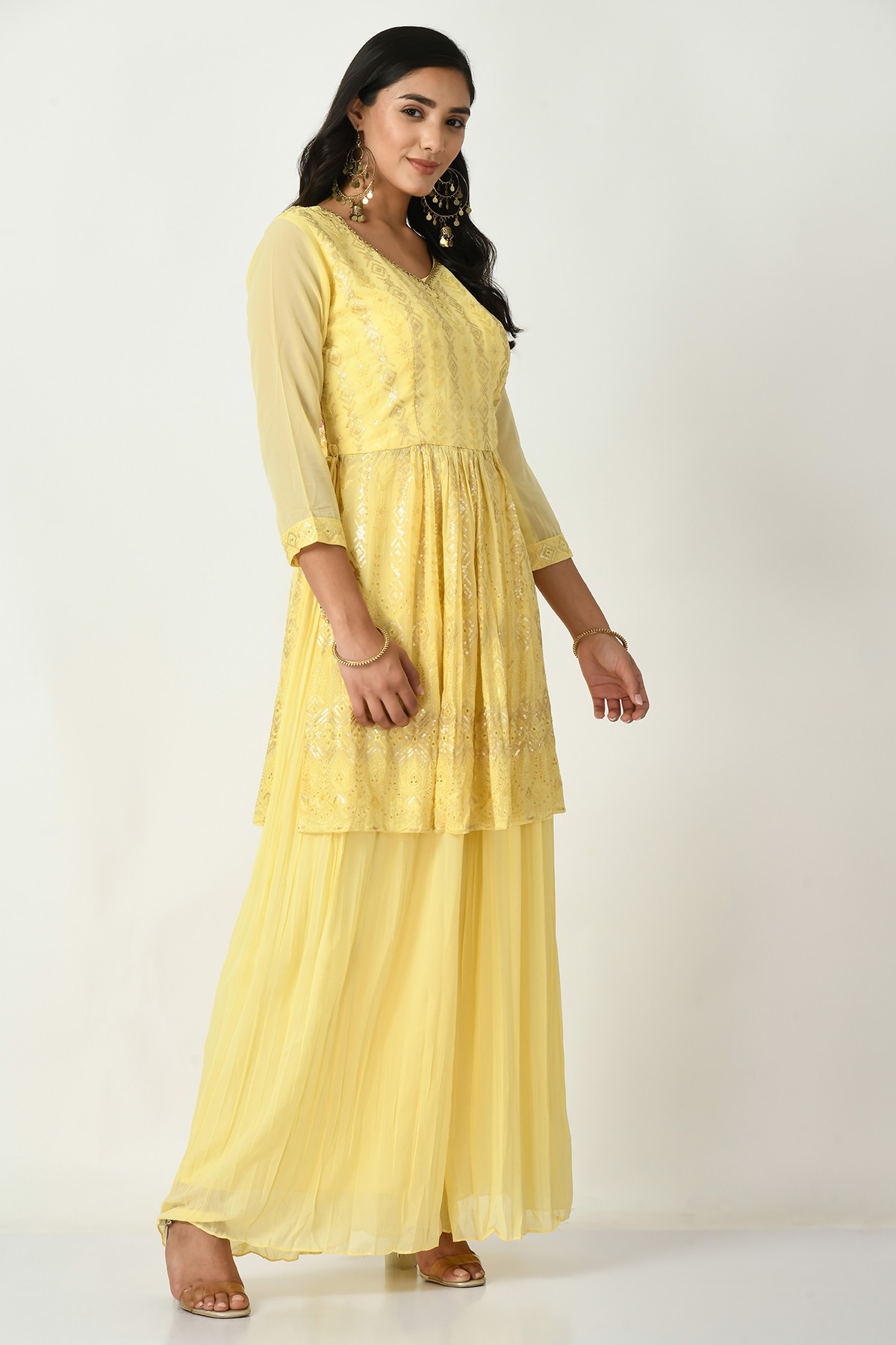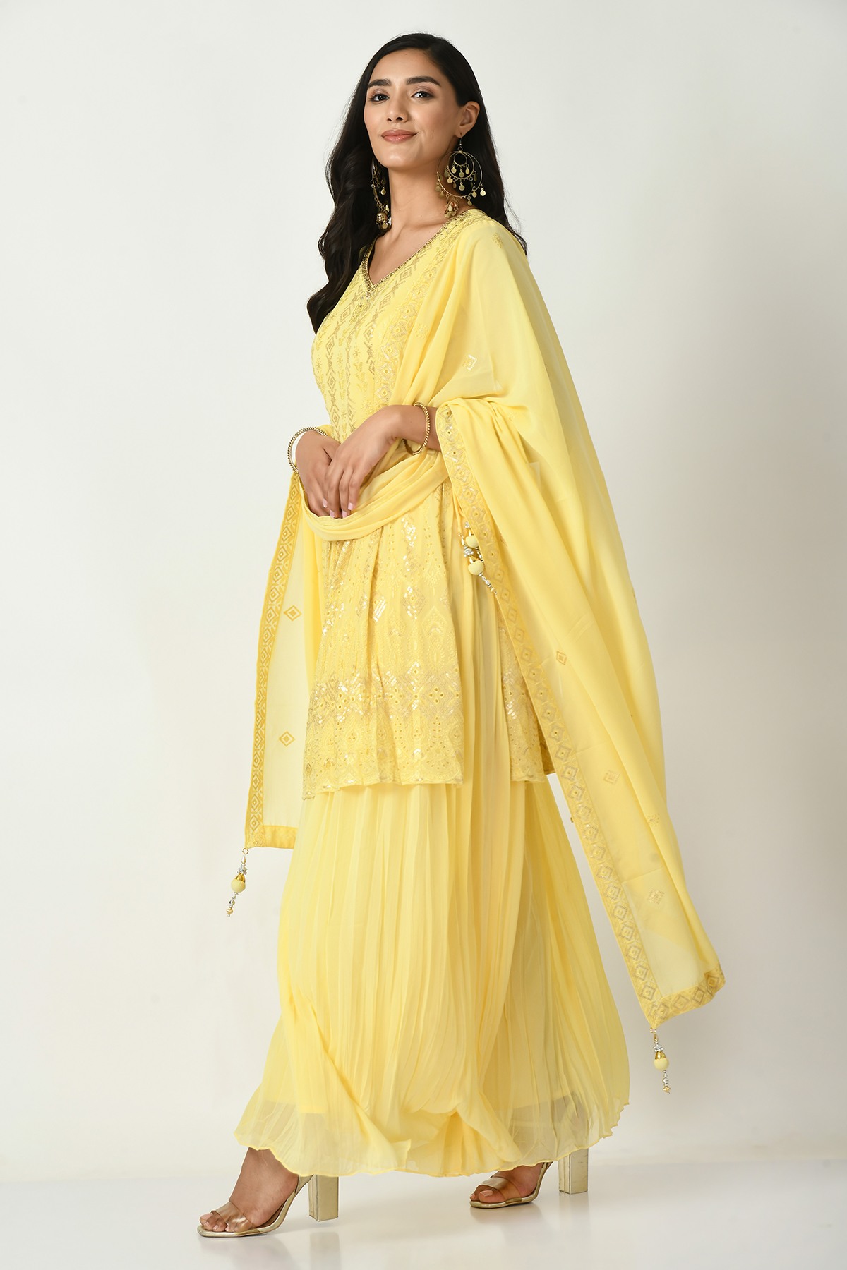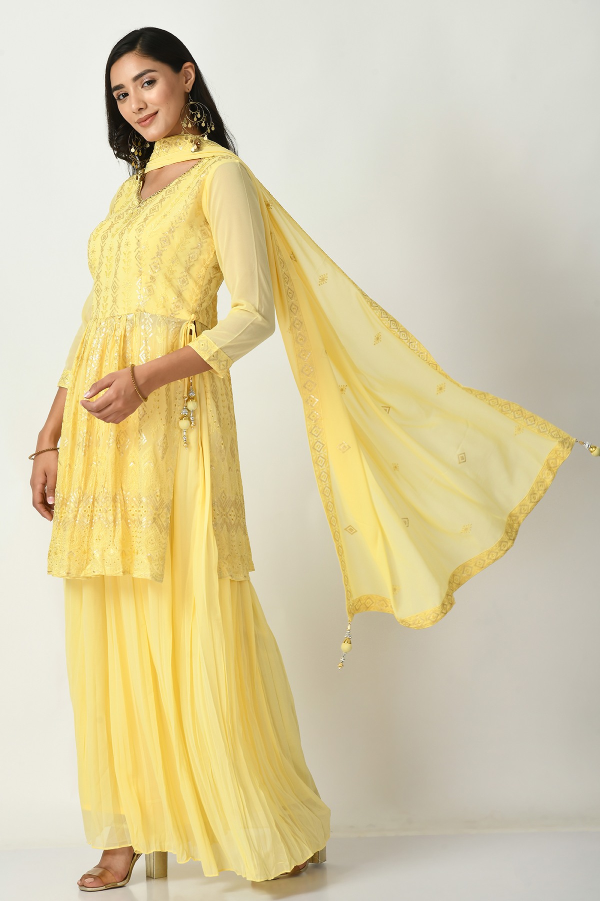 Yellow Zari embroidered and sequinned straight shape panelled style, has a portrait neck, three-quarter sleeves sequinned detail above knee length with straight hem with solid sharara elasticated waistband slip-on closure and embroidered taping Dupatta has beautiful tassel on border